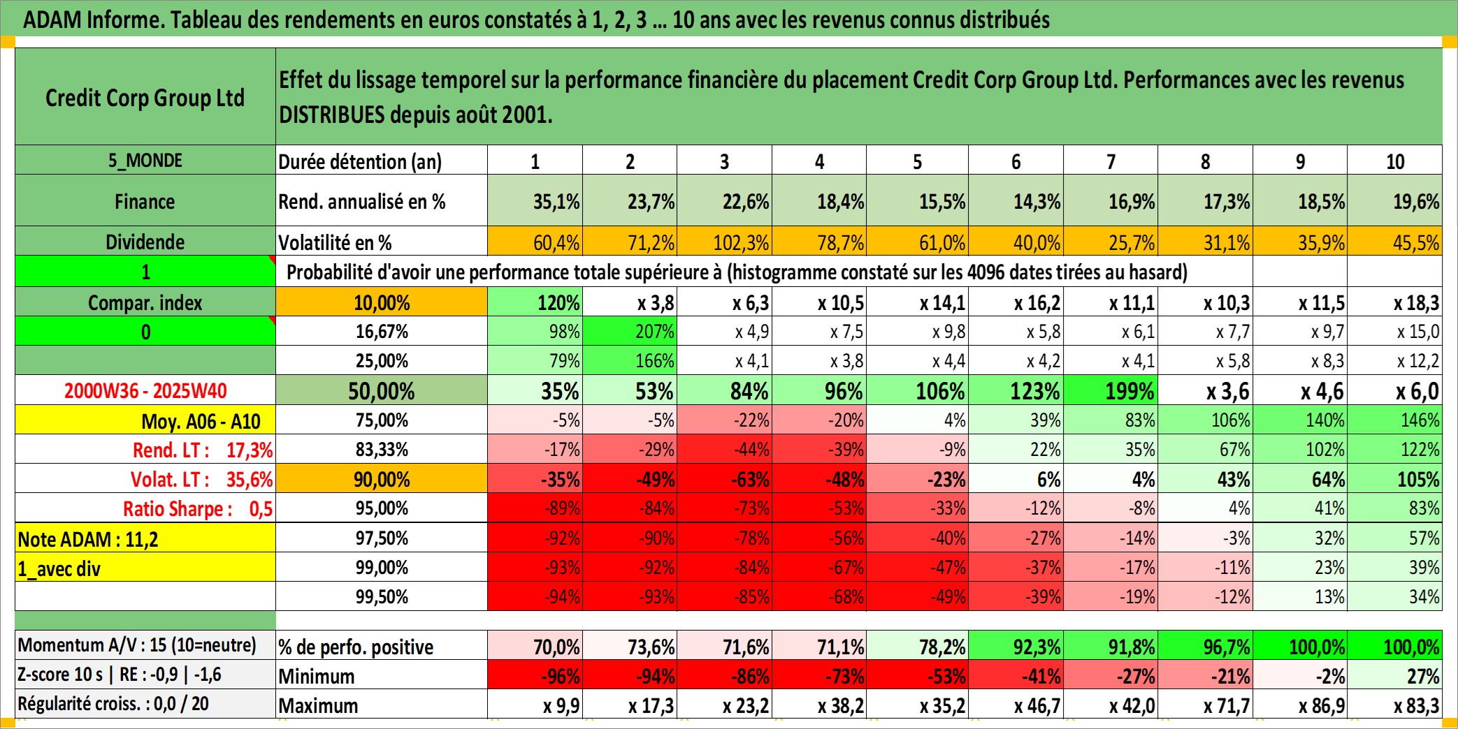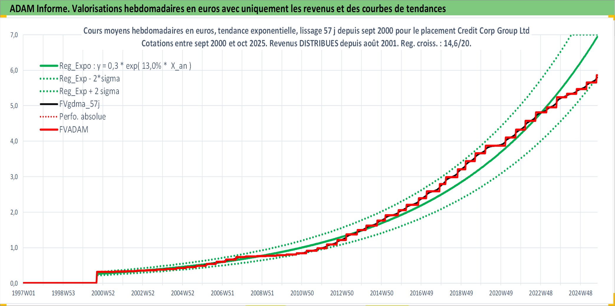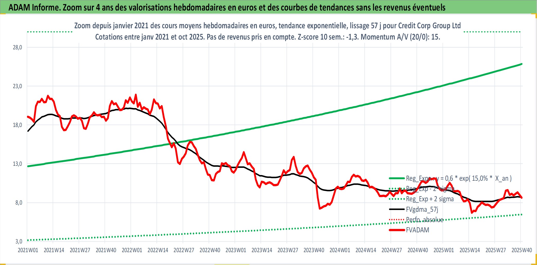 Site dédié aux investisseursPage dédiée sur site financeAnalyse des valorisations hebdomadaires de l'action Credit Corp Group Ltd. Cet actif est cote en AUD. Les valorisations sont en contrevaleur EURO et couvrent les semaines 2000W36 a 2025W40. Les revenus de cet actif financier sont pris en compte depuis la semaine 2001W33. La note ESG de cet actif n'est pas connue.