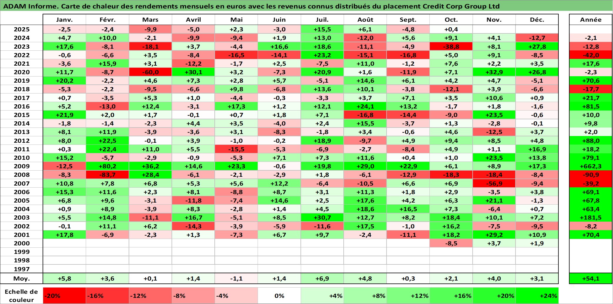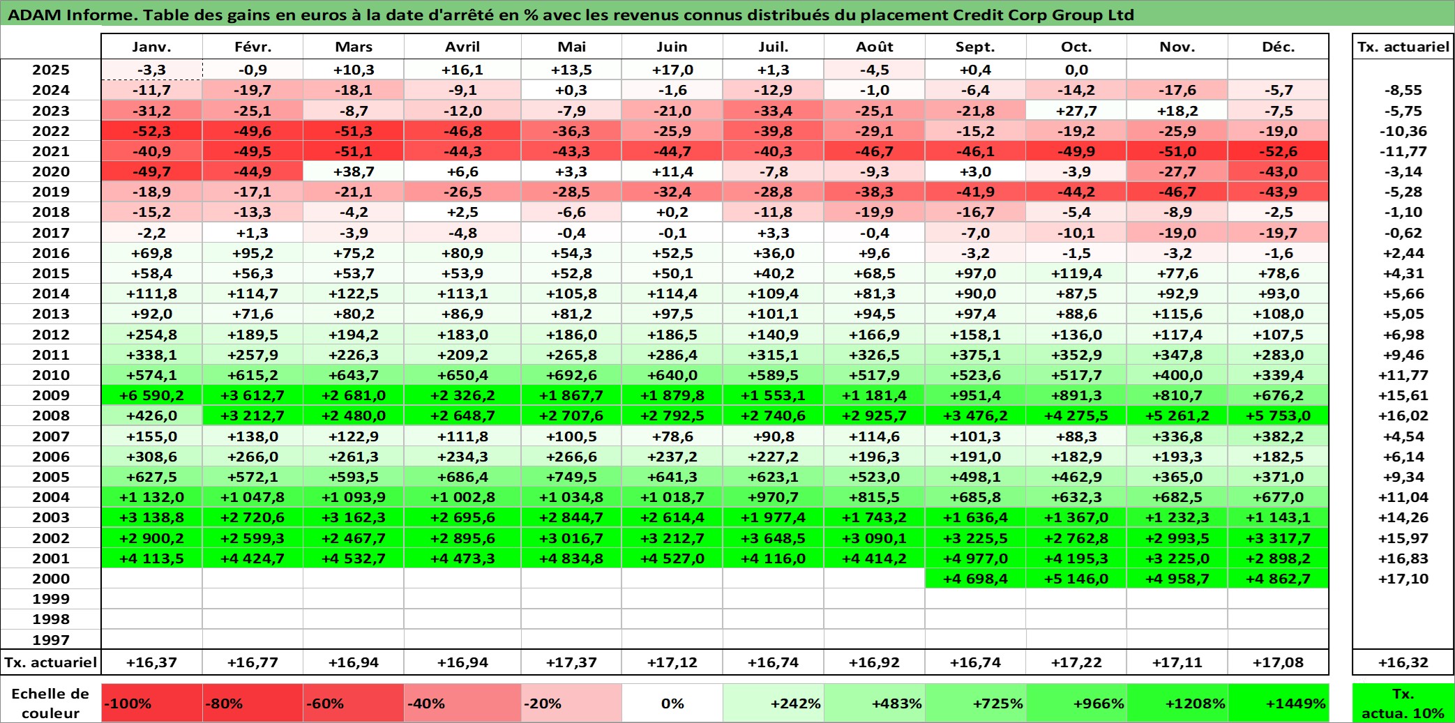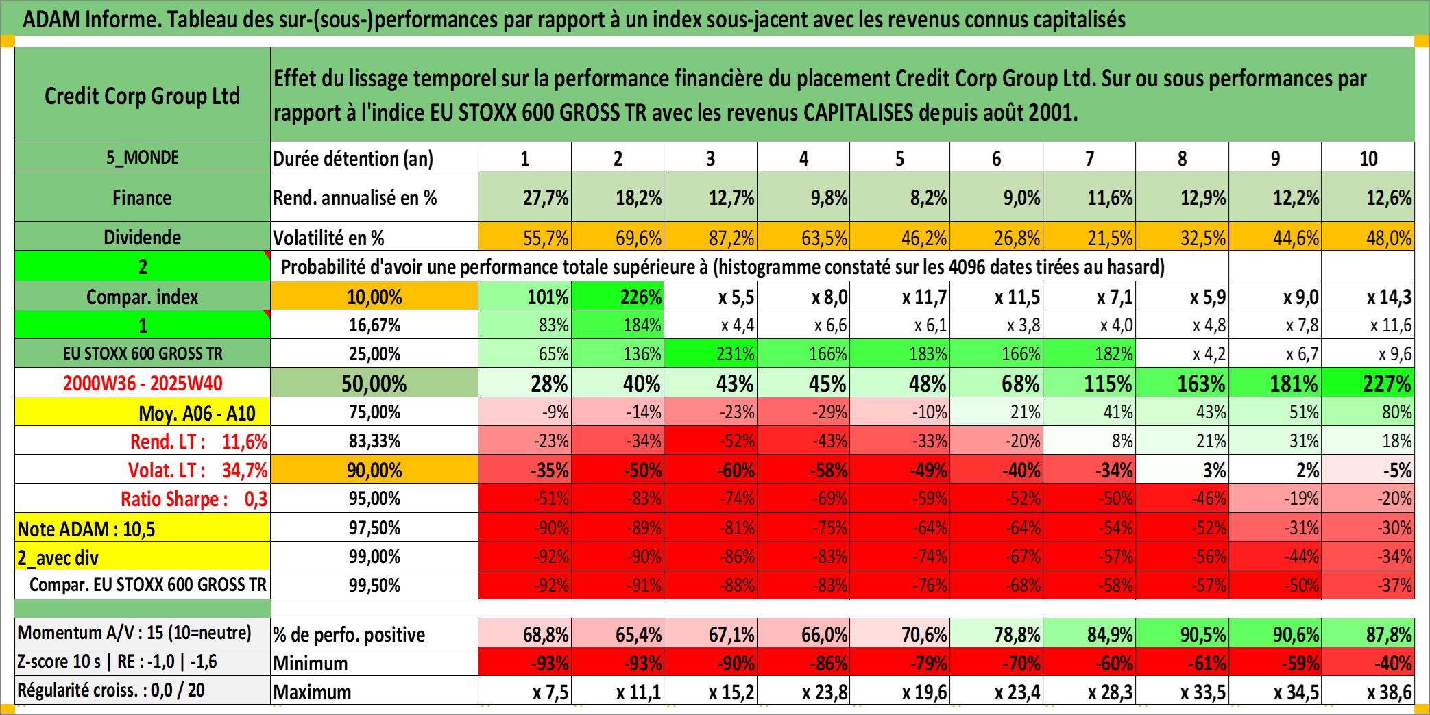 Site dédié aux investisseursPage dédiée sur site financeAnalyse des valorisations hebdomadaires de l'action Credit Corp Group Ltd. Cet actif est cote en AUD. Les valorisations sont en contrevaleur EURO et couvrent les semaines 2000W36 a 2025W40. Les revenus de cet actif financier sont pris en compte depuis la semaine 2001W33. La note ESG de cet actif n'est pas connue.