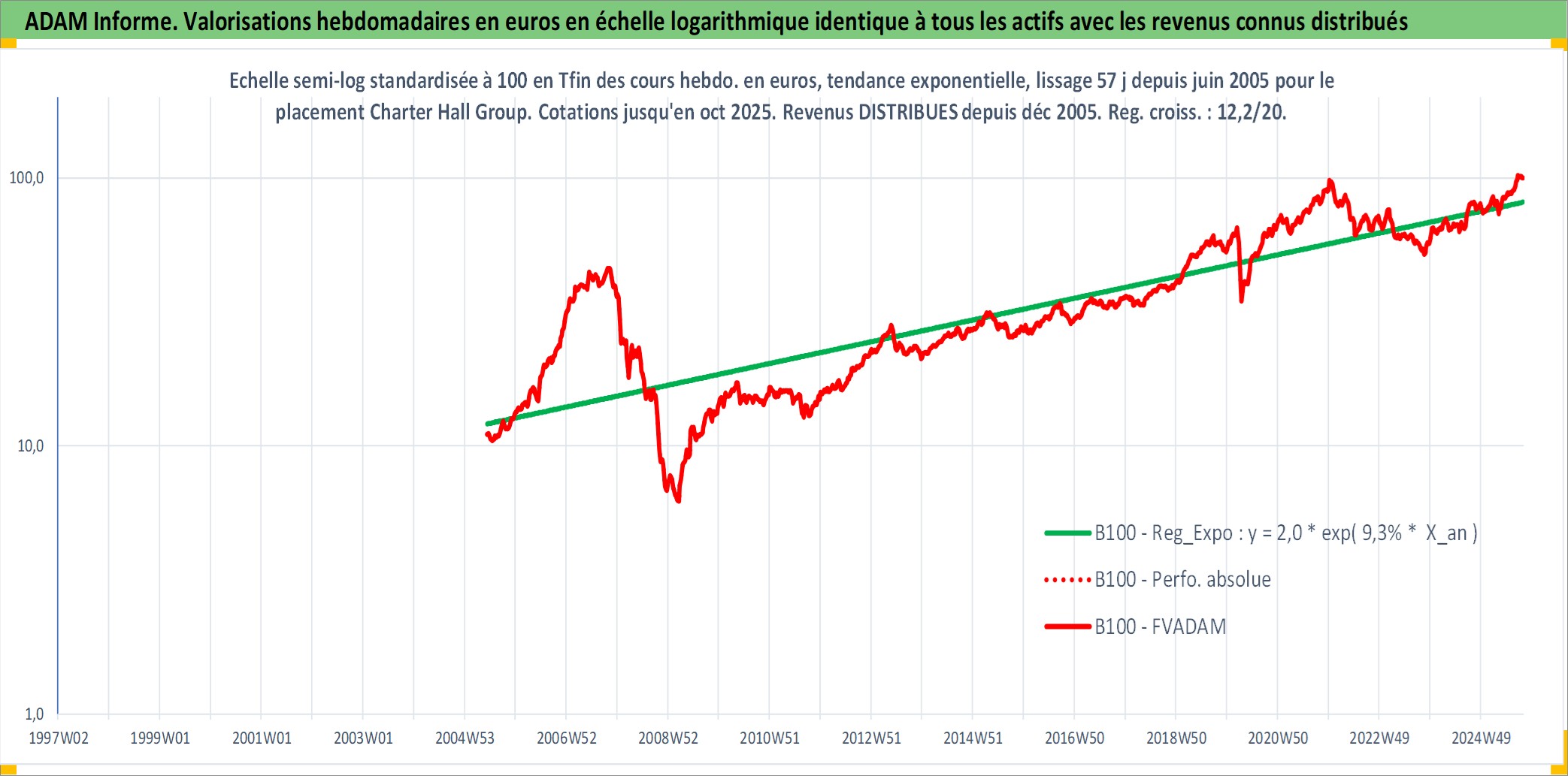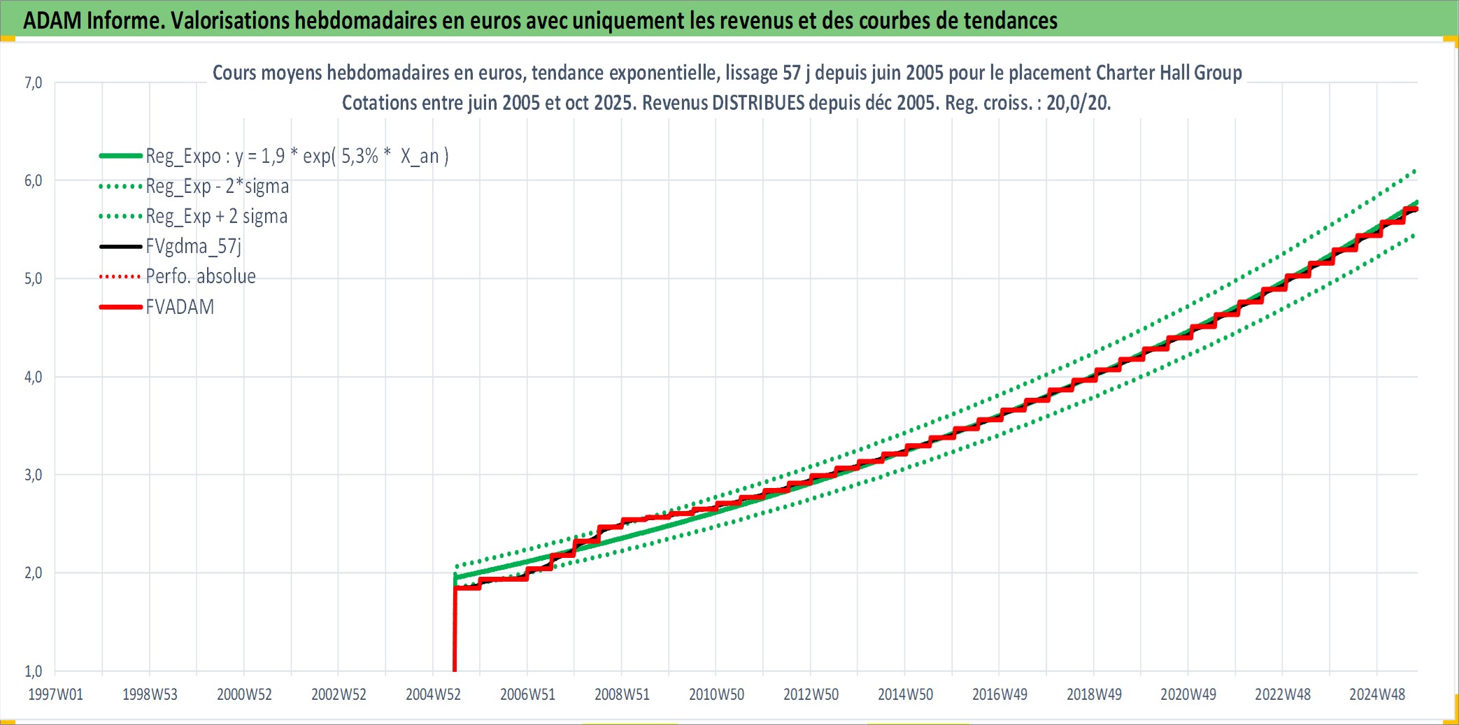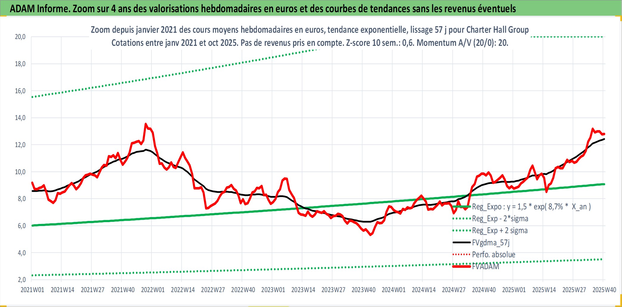 Site dédié aux investisseursPage dédiée sur site financeAnalyse des valorisations hebdomadaires de l'action Charter Hall Group. Cet actif est cote en AUD. Les valorisations sont en contrevaleur EURO et couvrent les semaines 2005W23 a 2025W40. Les revenus de cet actif financier sont pris en compte depuis la semaine 2005W51. La note ESG de cet actif n'est pas connue.