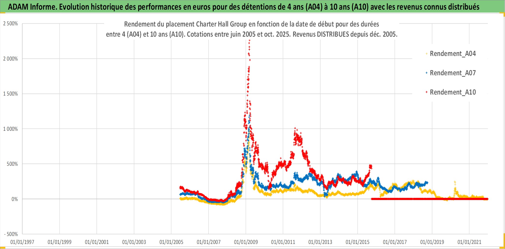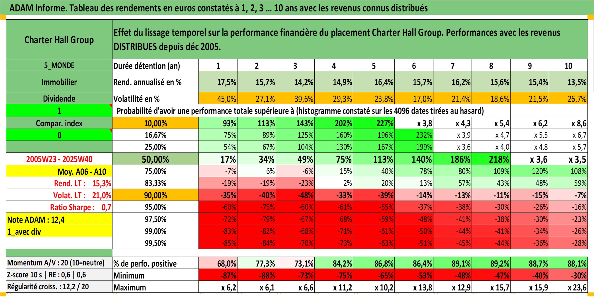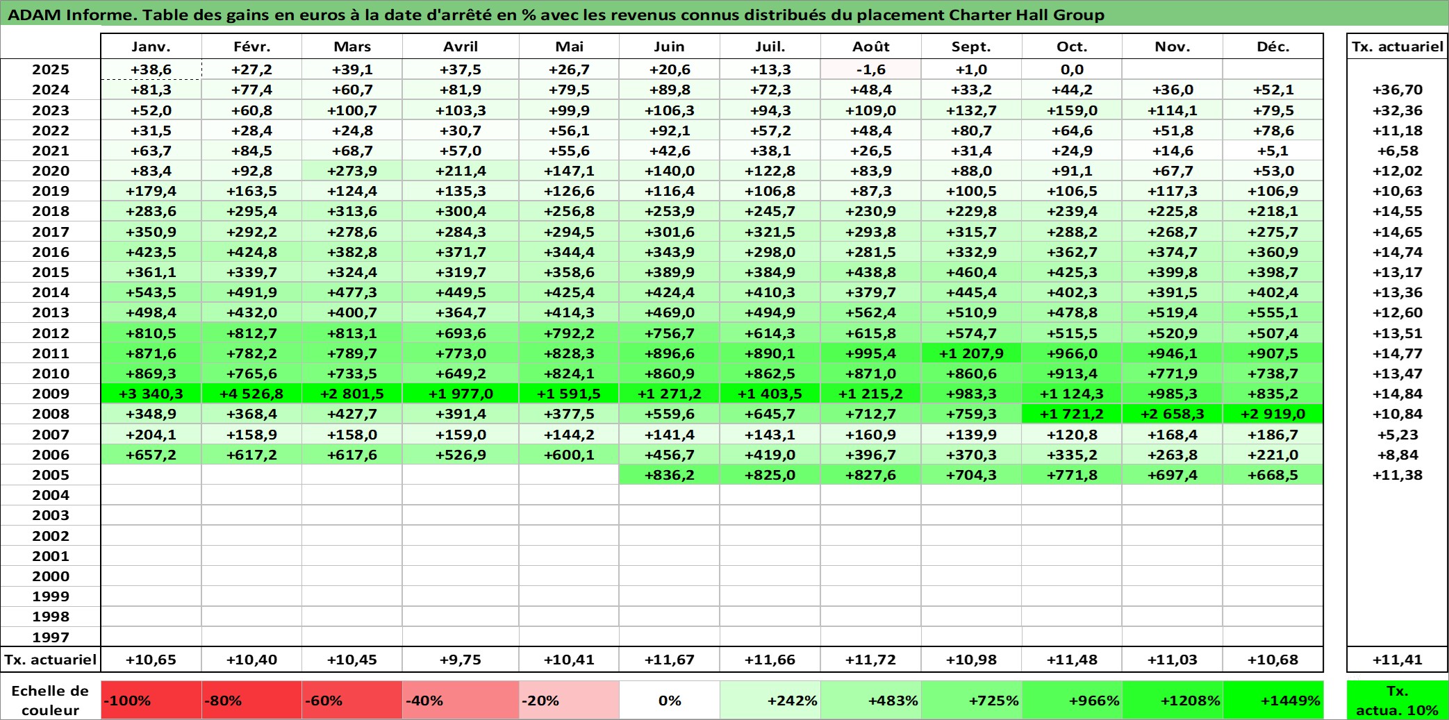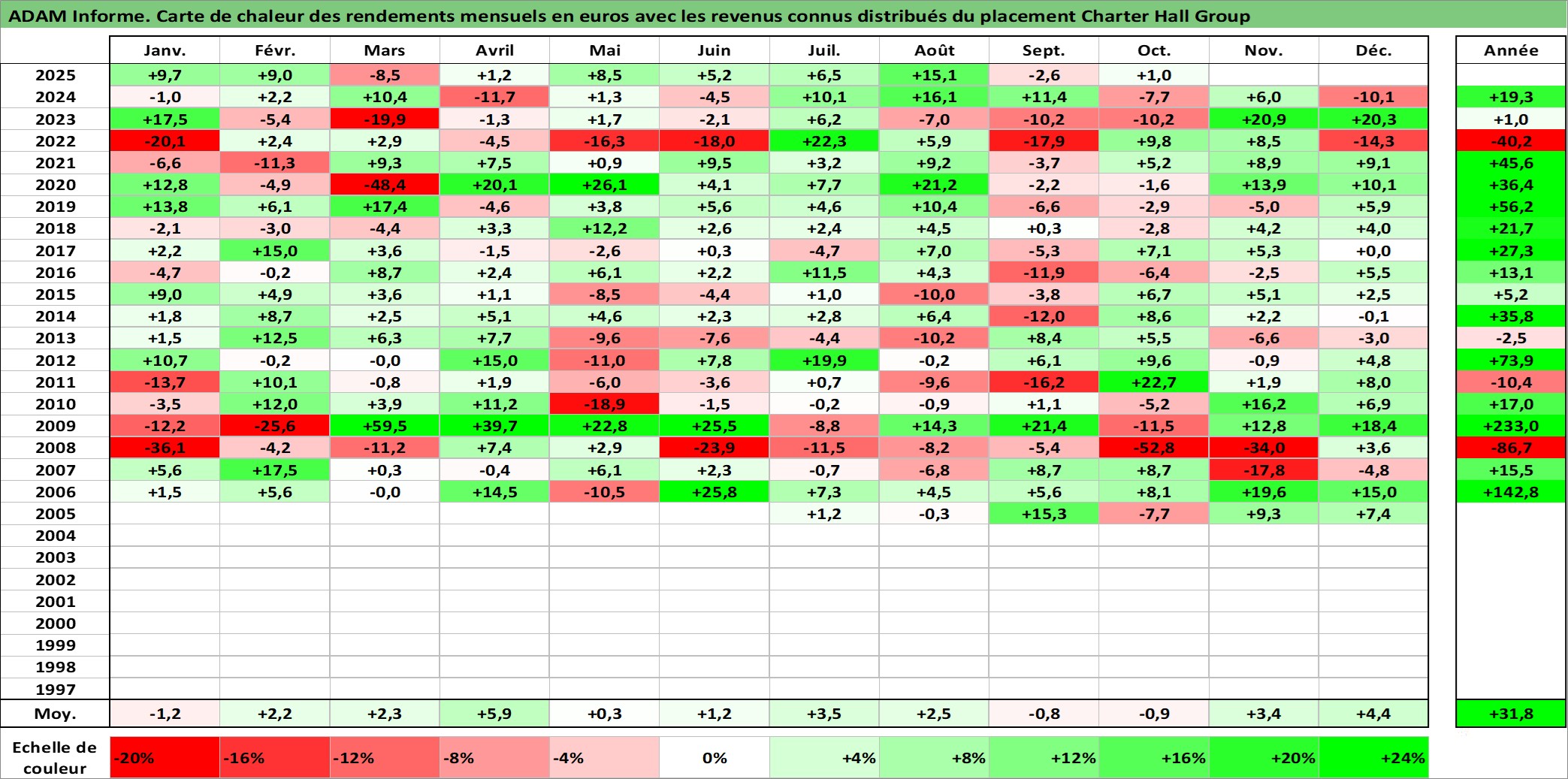 Site dédié aux investisseursPage dédiée sur site financeAnalyse des valorisations hebdomadaires de l'action Charter Hall Group. Cet actif est cote en AUD. Les valorisations sont en contrevaleur EURO et couvrent les semaines 2005W23 a 2025W40. Les revenus de cet actif financier sont pris en compte depuis la semaine 2005W51. La note ESG de cet actif n'est pas connue.
