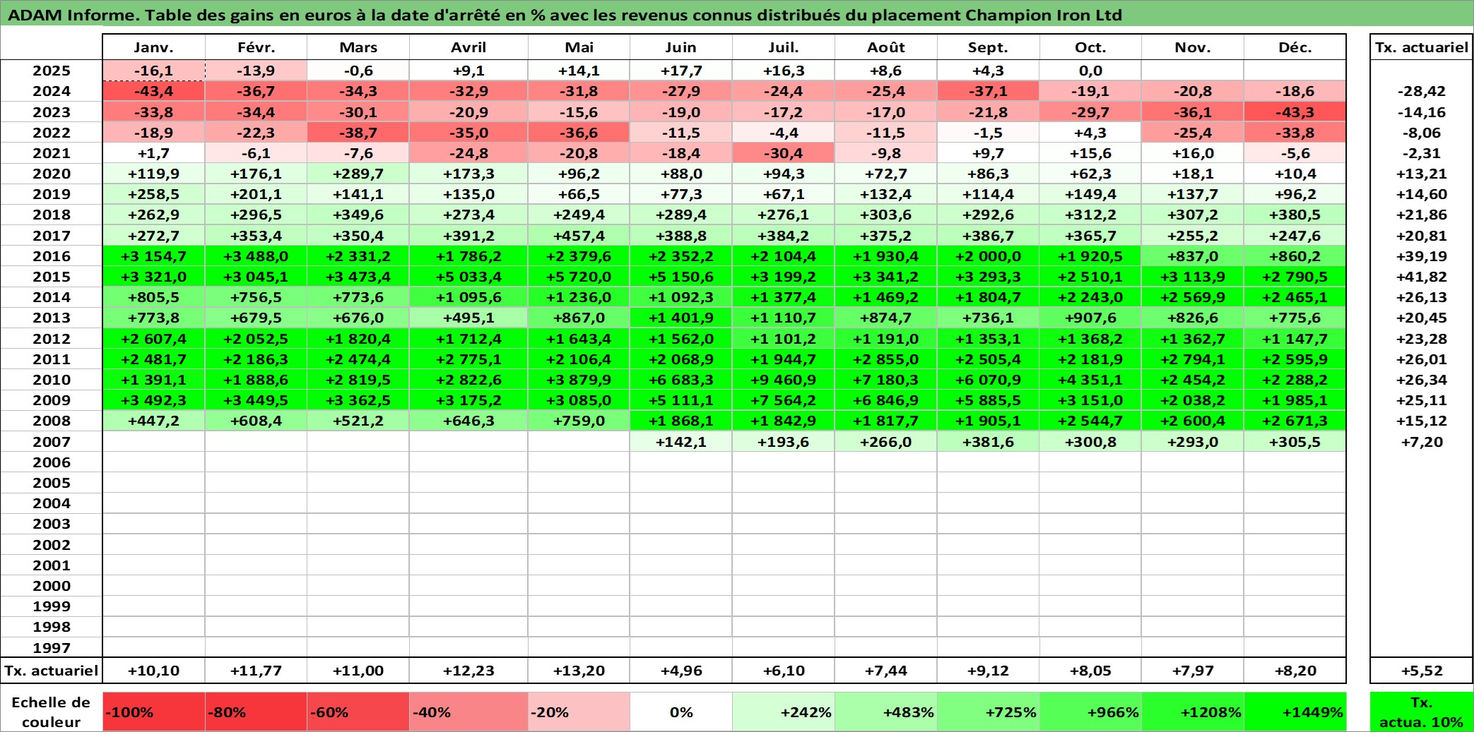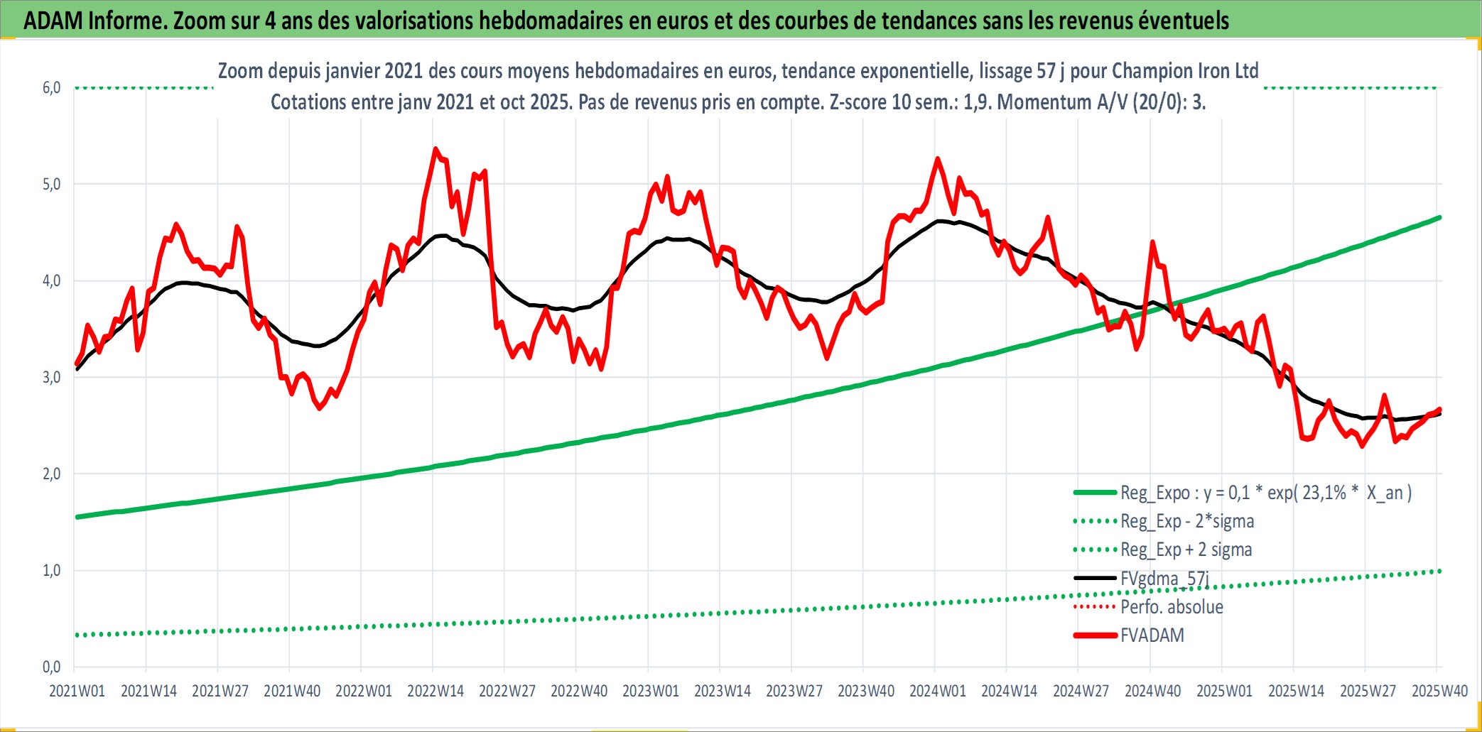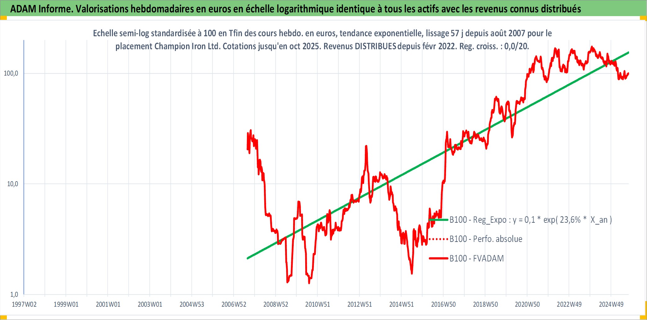 Site dédié aux investisseursPage dédiée sur site financeAnalyse des valorisations hebdomadaires de l'action Champion Iron Ltd. Cet actif est cote en AUD. Les valorisations sont en contrevaleur EURO et couvrent les semaines 2007W34 a 2025W40. Les revenus de cet actif financier sont pris en compte depuis la semaine 2022W05. La note ESG de cet actif n'est pas connue.