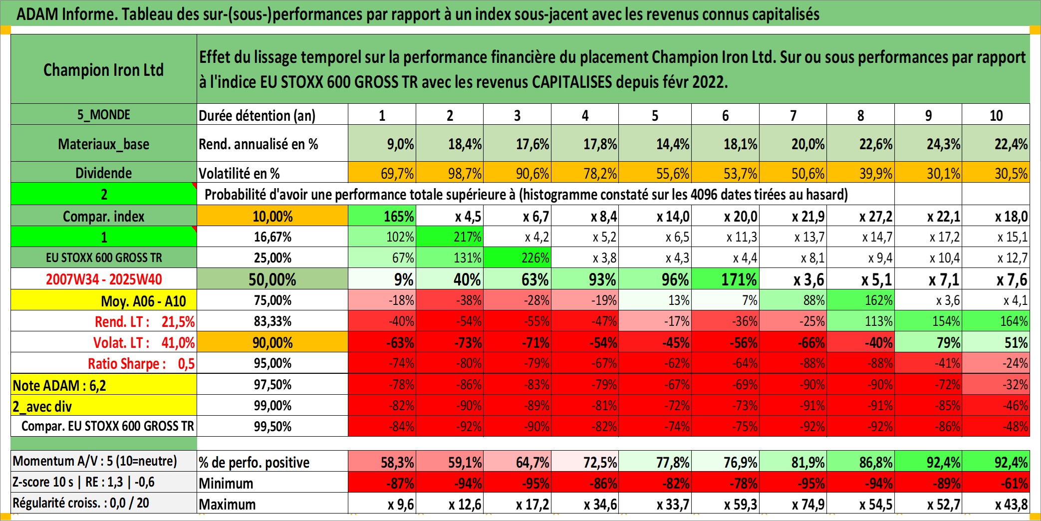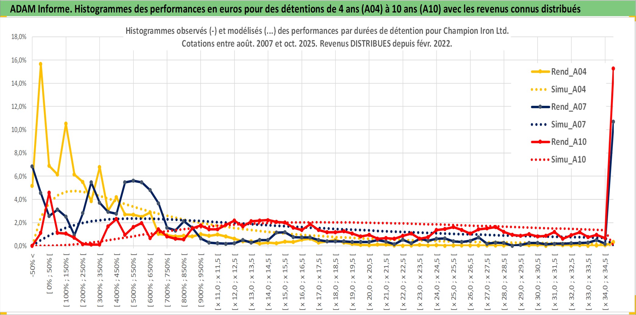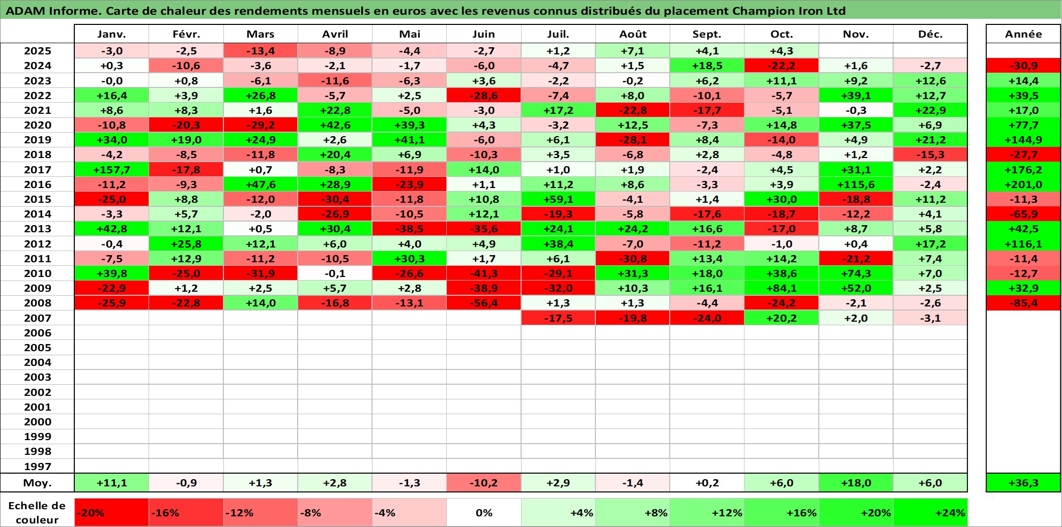 Site dédié aux investisseursPage dédiée sur site financeAnalyse des valorisations hebdomadaires de l'action Champion Iron Ltd. Cet actif est cote en AUD. Les valorisations sont en contrevaleur EURO et couvrent les semaines 2007W34 a 2025W40. Les revenus de cet actif financier sont pris en compte depuis la semaine 2022W05. La note ESG de cet actif n'est pas connue.
