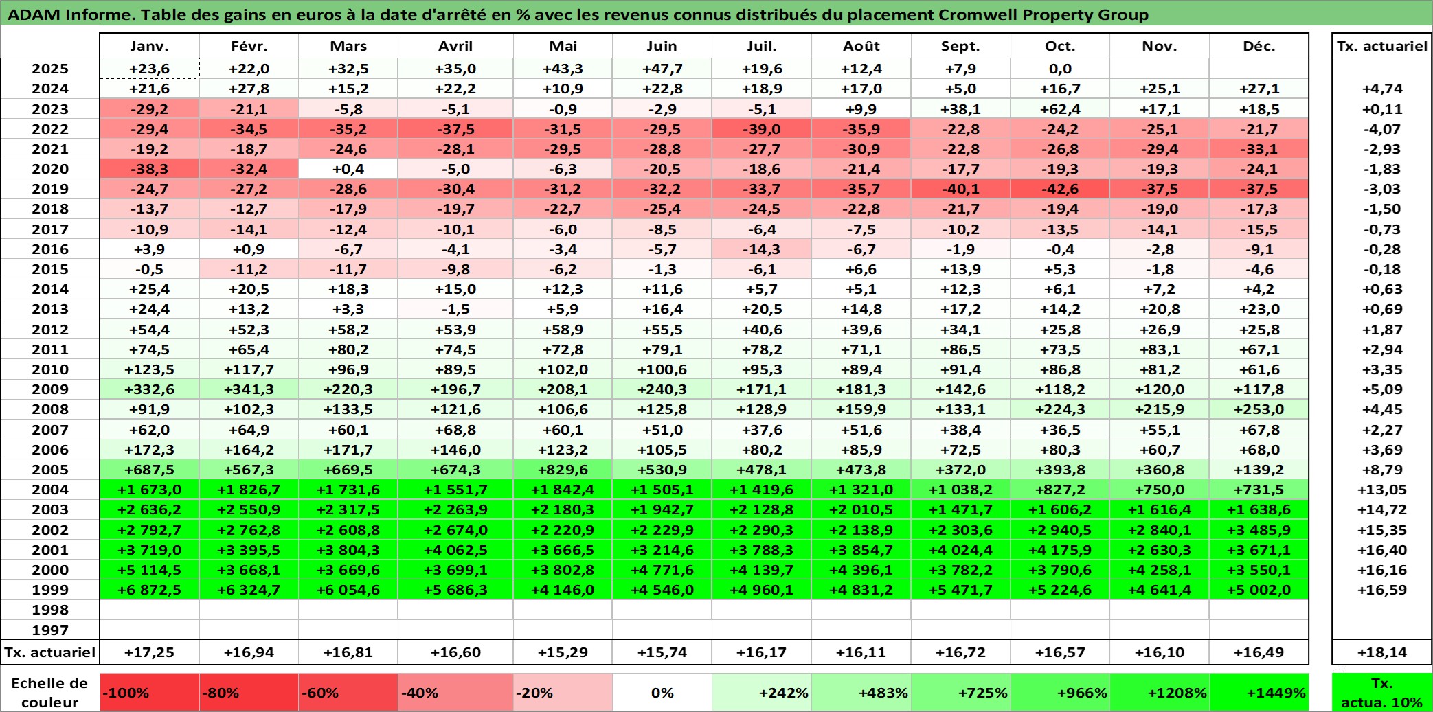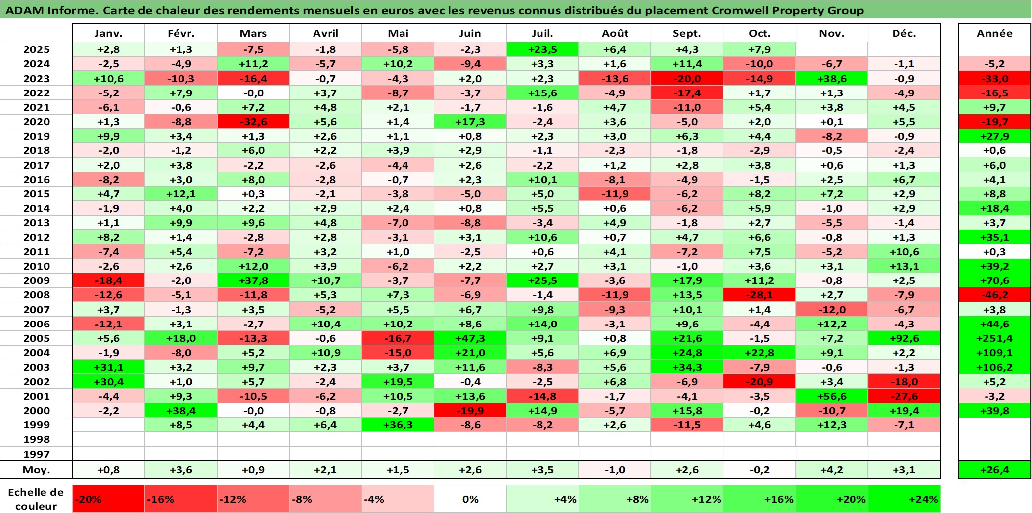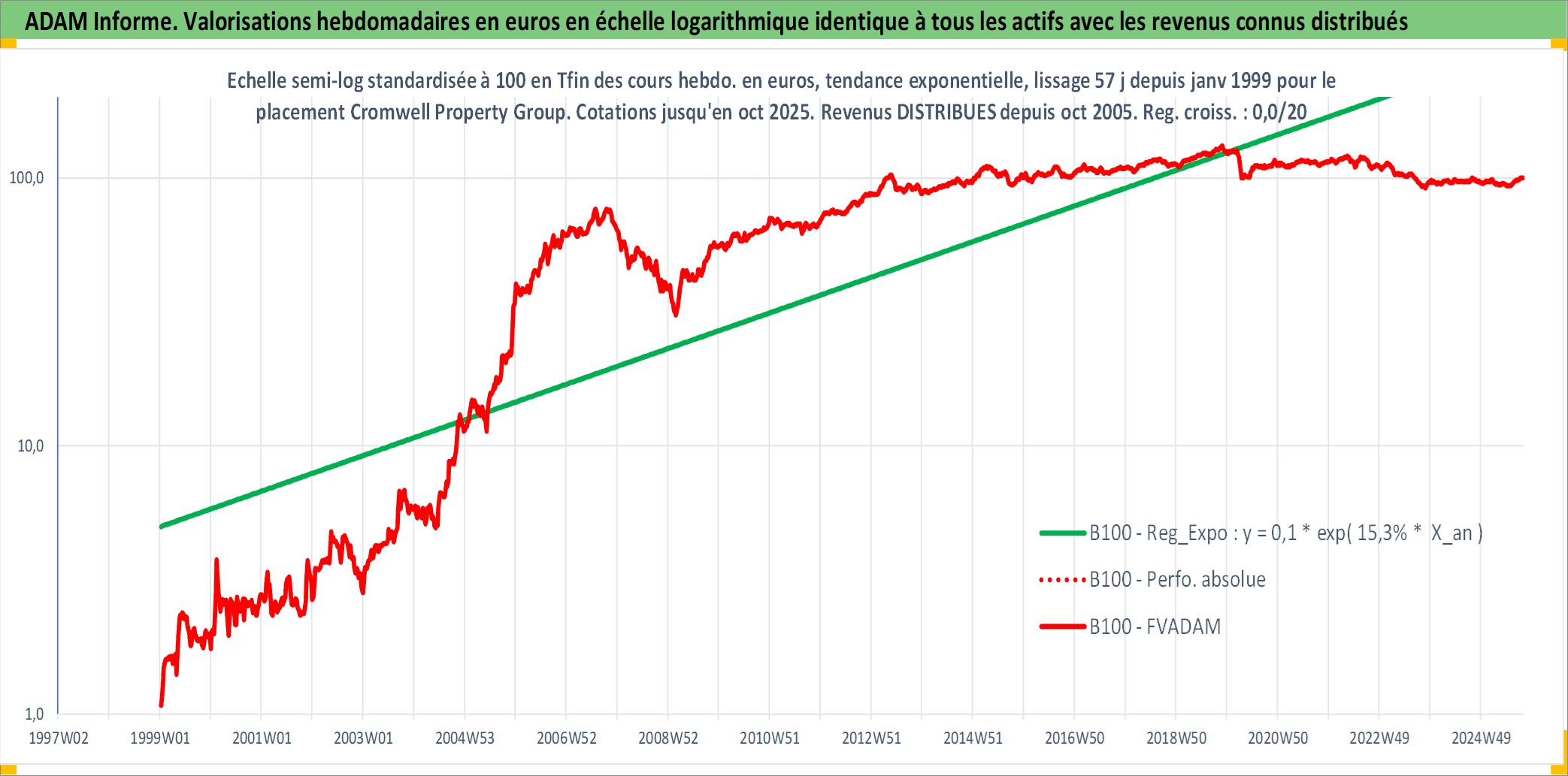 Site dédié aux investisseursPage dédiée sur site financeAnalyse des valorisations hebdomadaires de l'action Cromwell Property Group. Cet actif est cote en AUD. Les valorisations sont en contrevaleur EURO et couvrent les semaines 1999W02 a 2025W40. Les revenus de cet actif financier sont pris en compte depuis la semaine 2005W43. La note ESG de cet actif n'est pas connue.