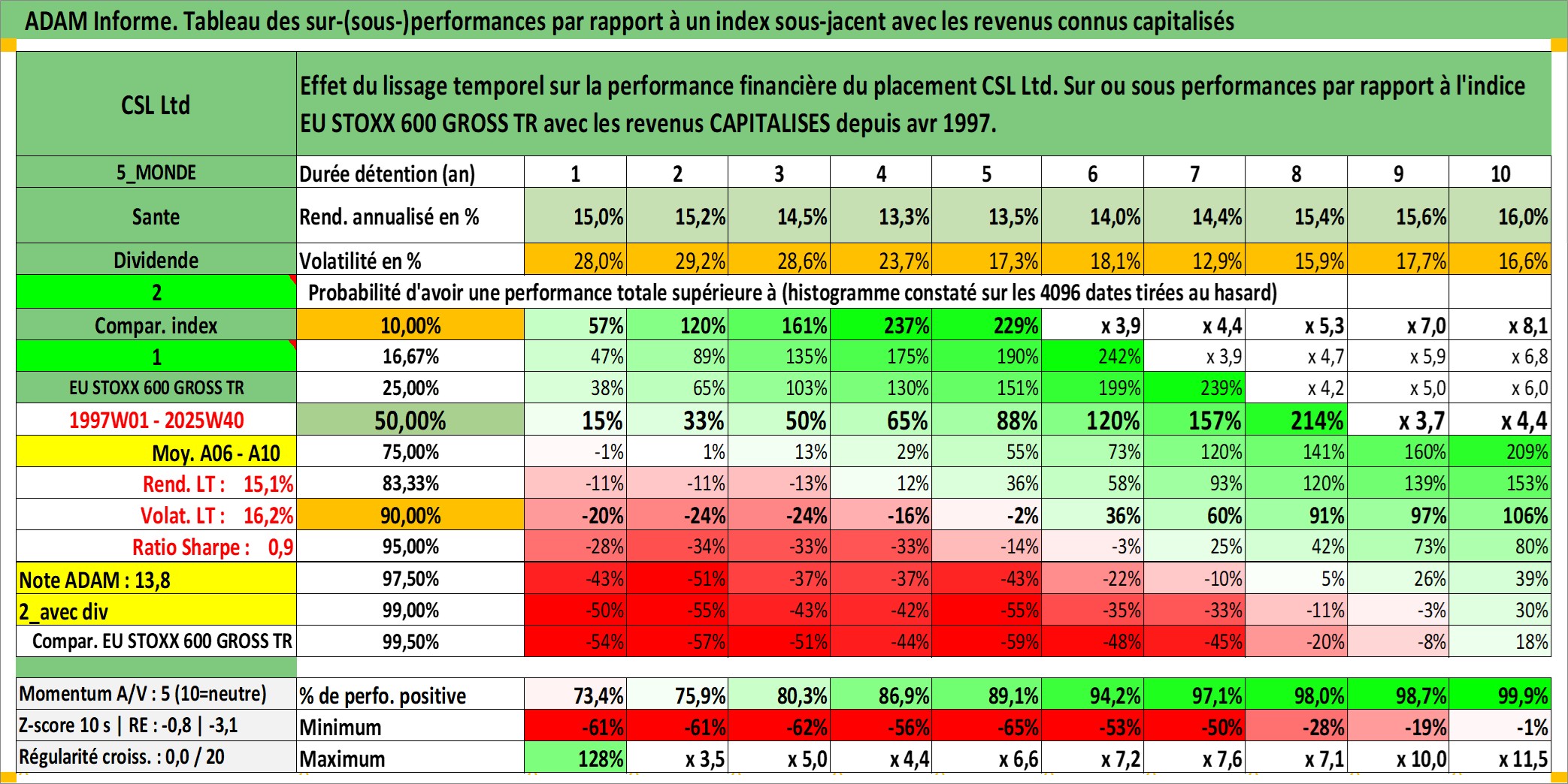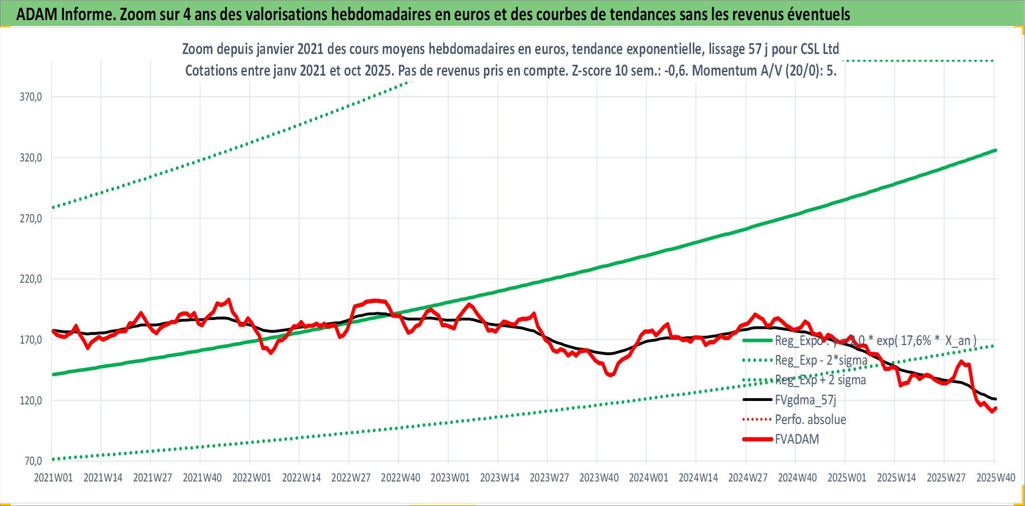 Site dédié aux investisseursPage dédiée sur site financeAnalyse des valorisations hebdomadaires de l'action CSL Ltd. Cet actif est cote en AUD. Les valorisations sont en contrevaleur EURO et couvrent les semaines 1997W01 a 2025W40. Les revenus de cet actif financier sont pris en compte depuis la semaine 1997W15. La note globale ESG de cet actif est estimee a 8.0 (apres rebasage entre 0 et 20).