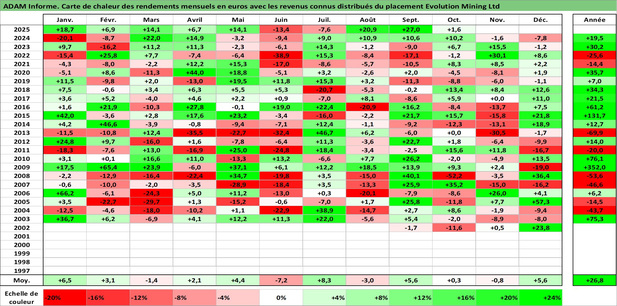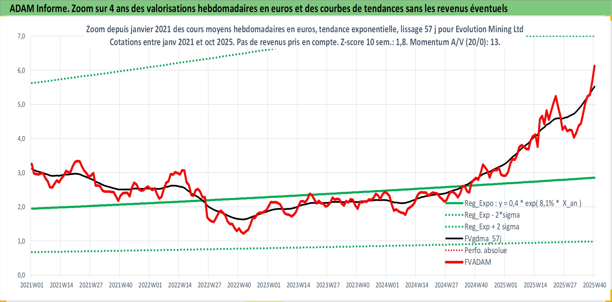 Site dédié aux investisseursPage dédiée sur site financeAnalyse des valorisations hebdomadaires de l'action Evolution Mining Ltd. Cet actif est cote en AUD. Les valorisations sont en contrevaleur EURO et couvrent les semaines 2002W34 a 2025W40. Les revenus de cet actif financier sont pris en compte depuis la semaine 2013W36. La note ESG de cet actif n'est pas connue.
