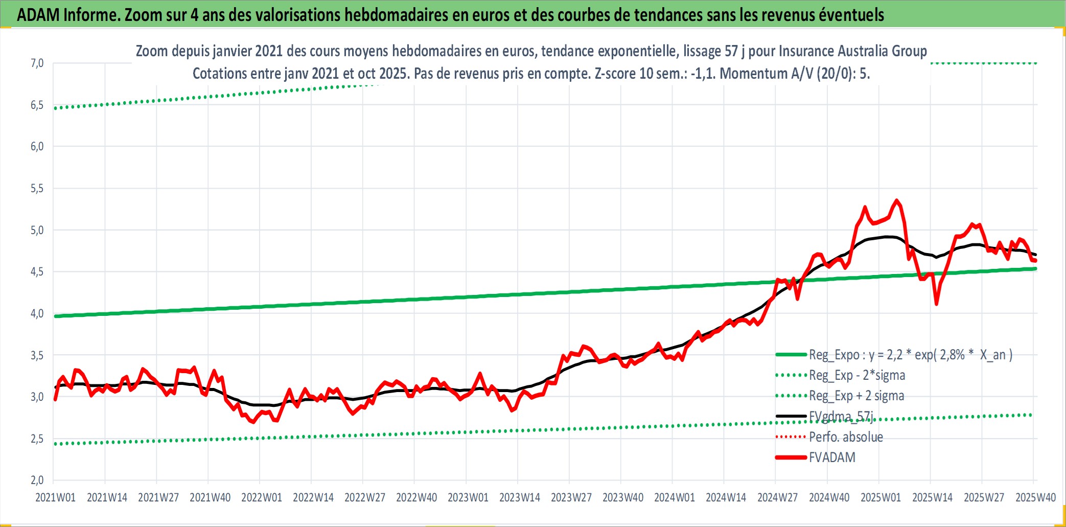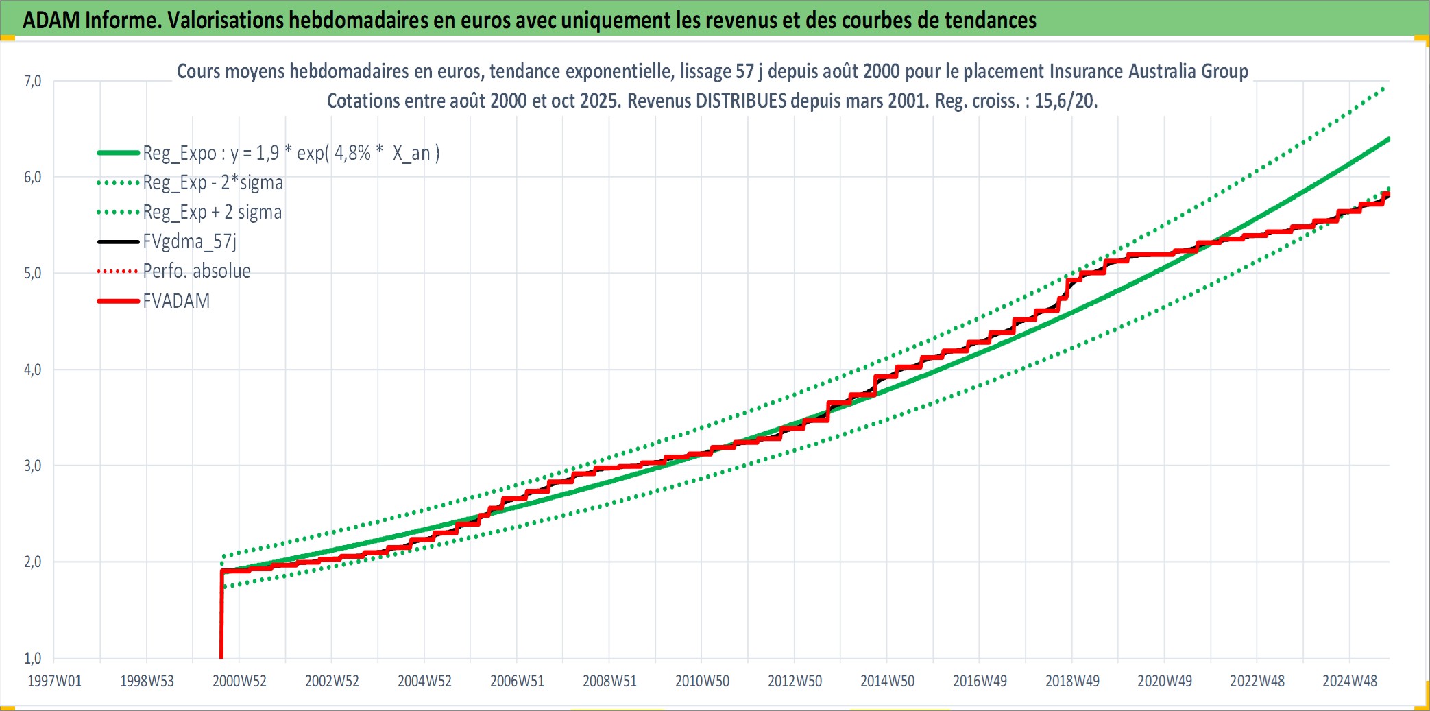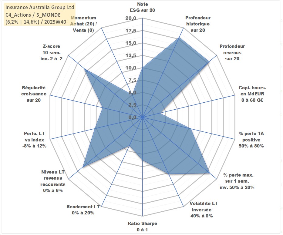 Site dédié aux investisseursPage dédiée sur site financeAnalyse des valorisations hebdomadaires de l'action Insurance Australia Group Ltd. Cet actif est cote en AUD. Les valorisations sont en contrevaleur EURO et couvrent les semaines 2000W32 a 2025W40. Les revenus de cet actif financier sont pris en compte depuis la semaine 2001W12. La note globale ESG de cet actif est estimee a 10.0 (apres rebasage entre 0 et 20).
