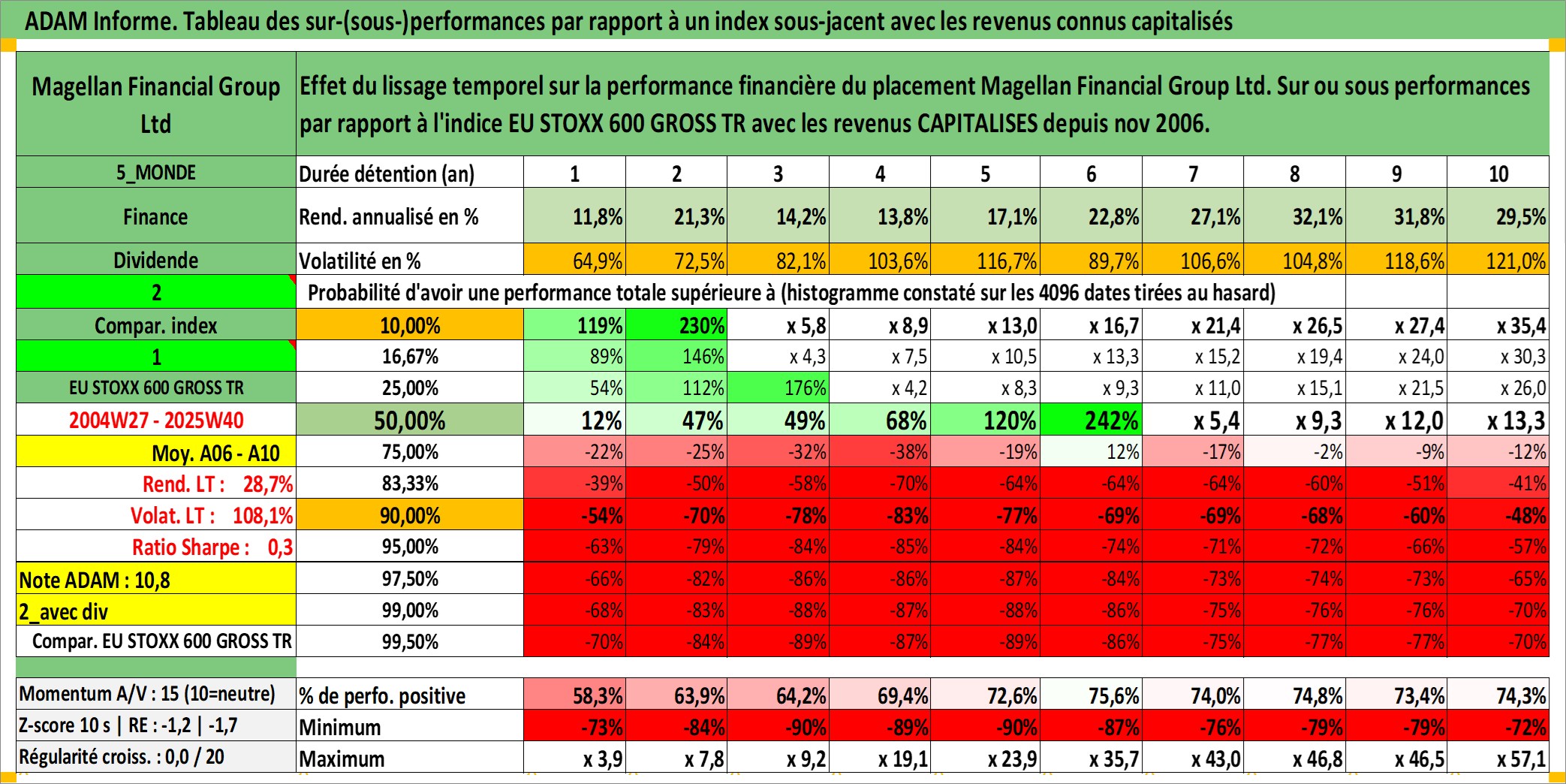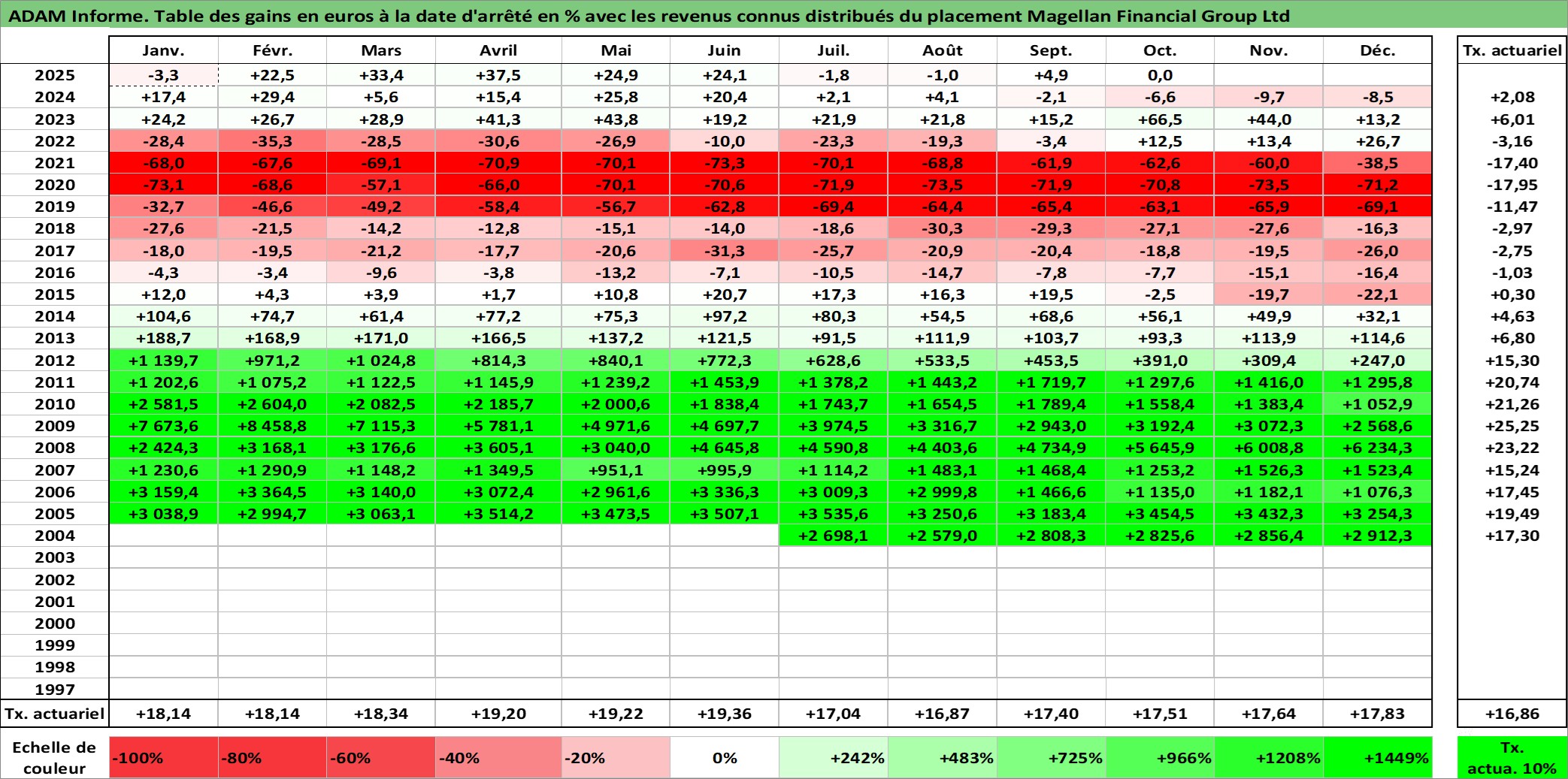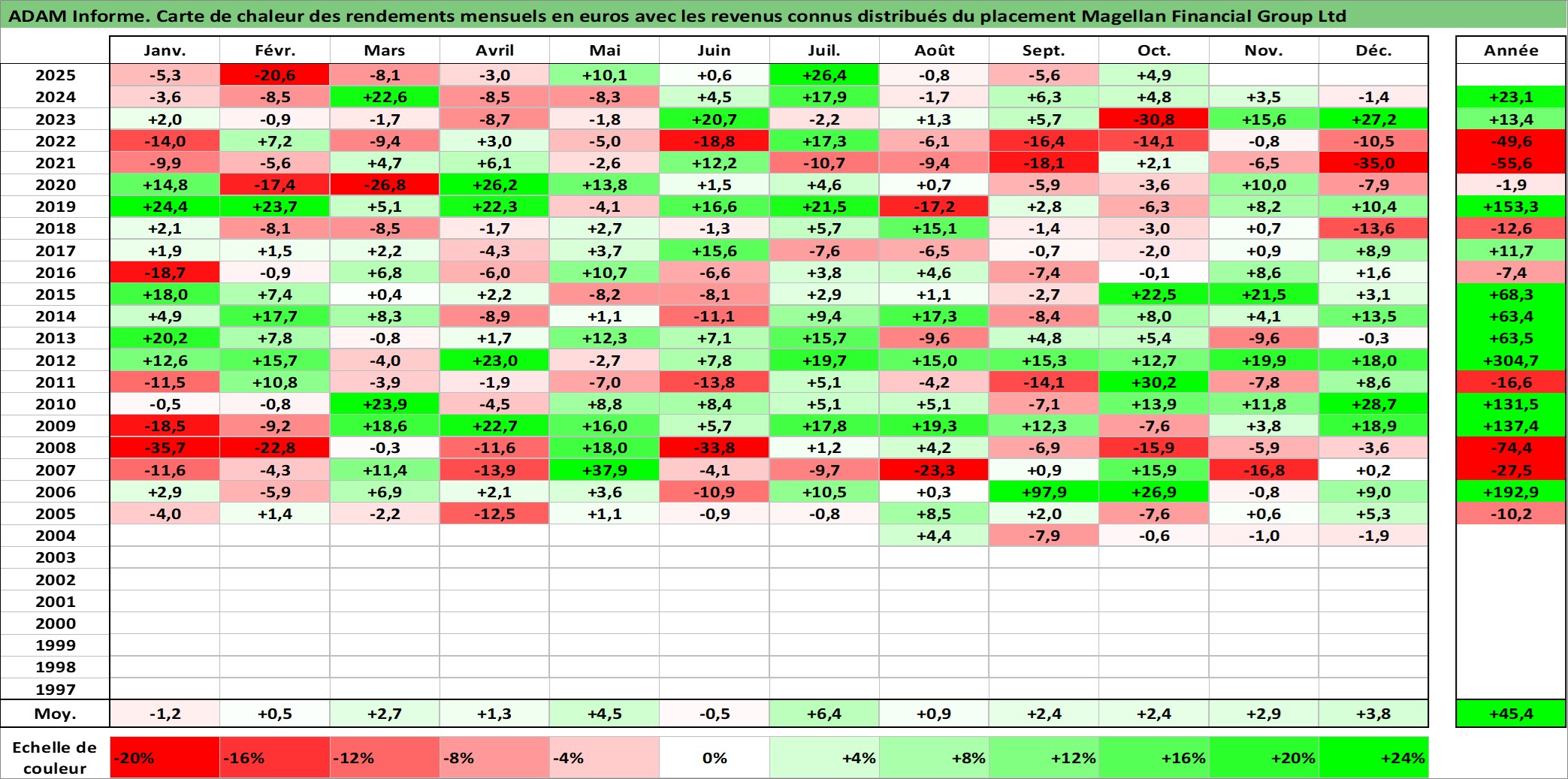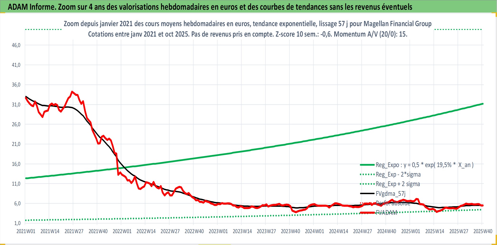 Site dédié aux investisseursPage dédiée sur site financeAnalyse des valorisations hebdomadaires de l'action Magellan Financial Group Ltd. Cet actif est cote en AUD. Les valorisations sont en contrevaleur EURO et couvrent les semaines 2004W27 a 2025W40. Les revenus de cet actif financier sont pris en compte depuis la semaine 2006W46. La note ESG de cet actif n'est pas connue.
