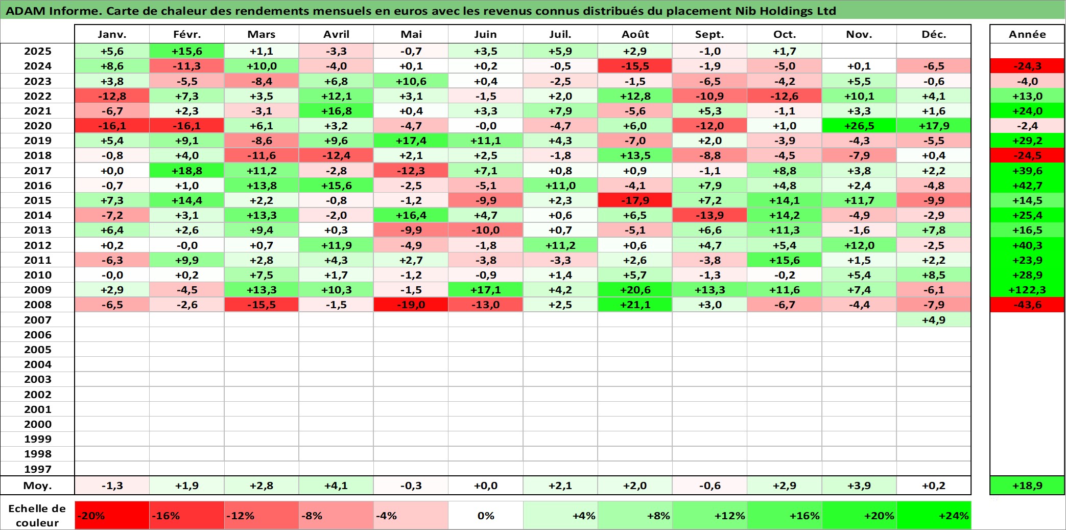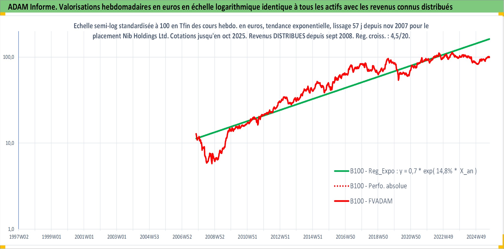 Site dédié aux investisseursPage dédiée sur site financeAnalyse des valorisations hebdomadaires de l'action Nib Holdings Ltd. Cet actif est cote en AUD. Les valorisations sont en contrevaleur EURO et couvrent les semaines 2007W45 a 2025W40. Les revenus de cet actif financier sont pris en compte depuis la semaine 2008W38. La note ESG de cet actif n'est pas connue.