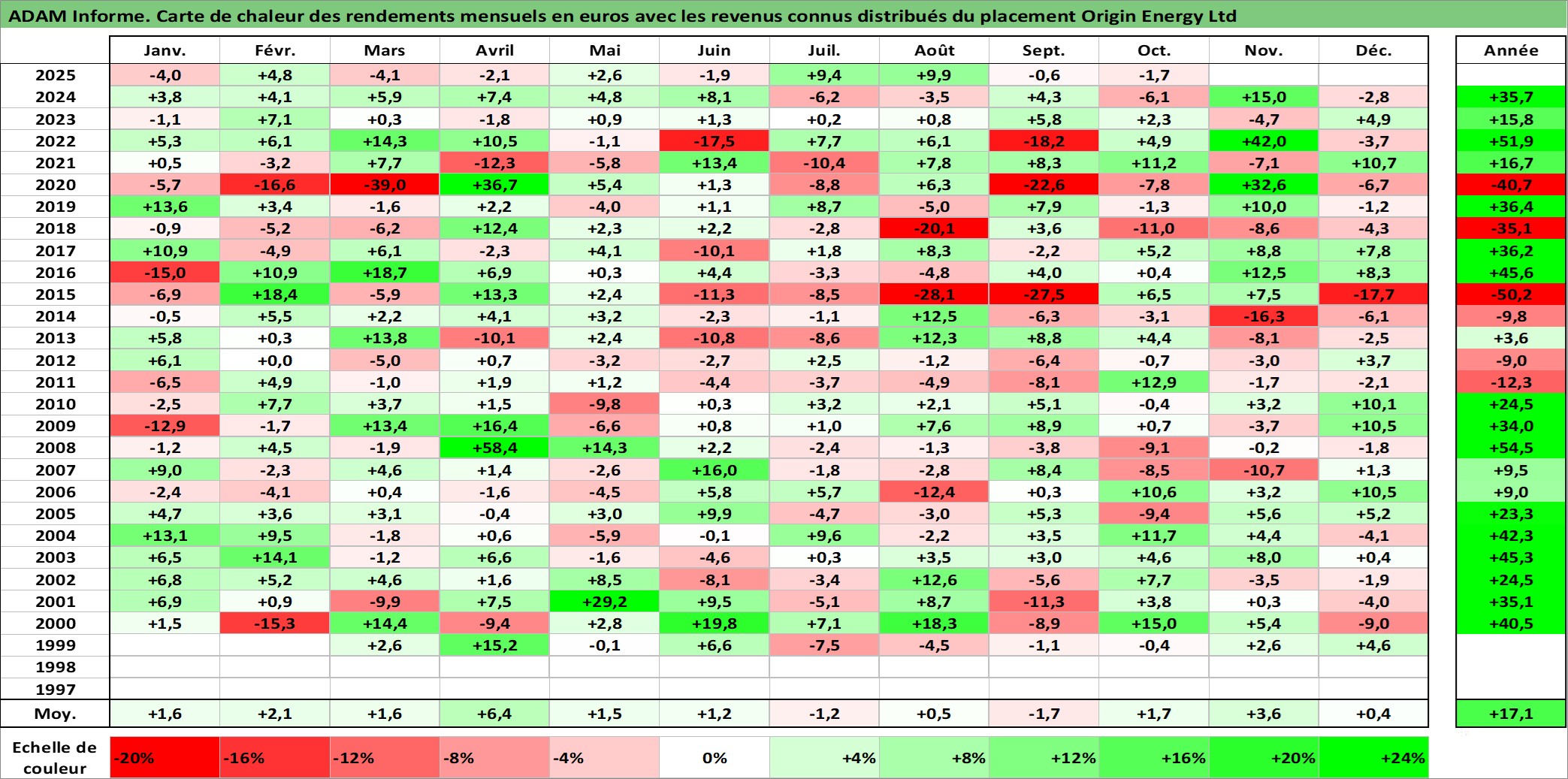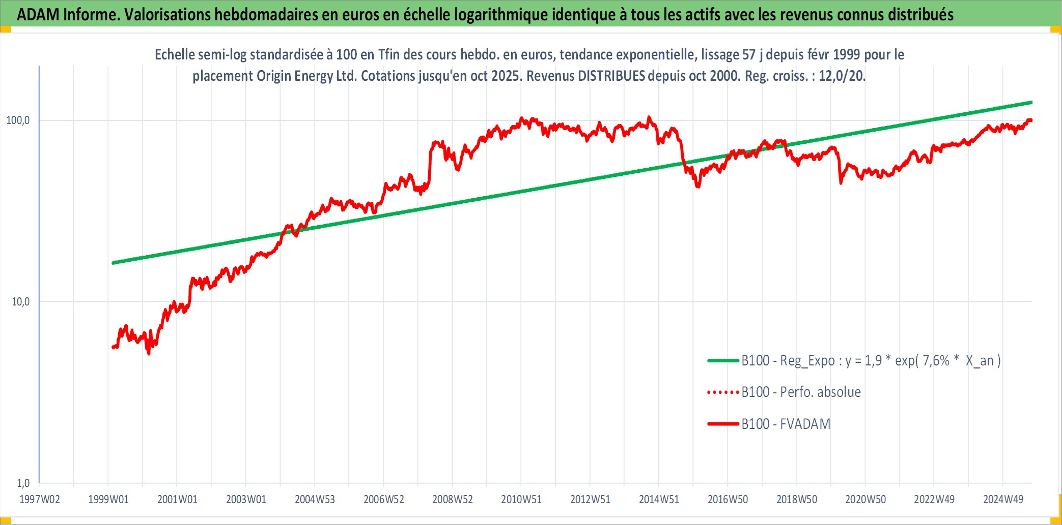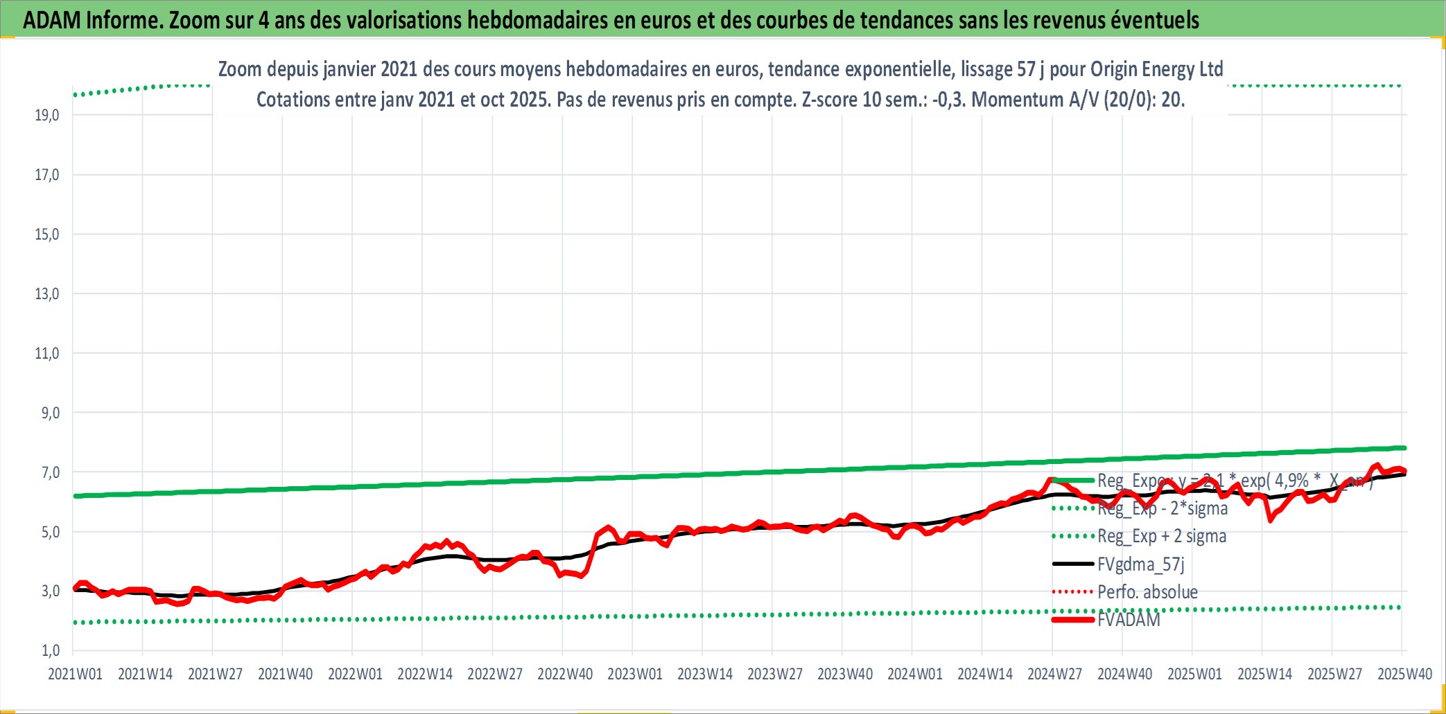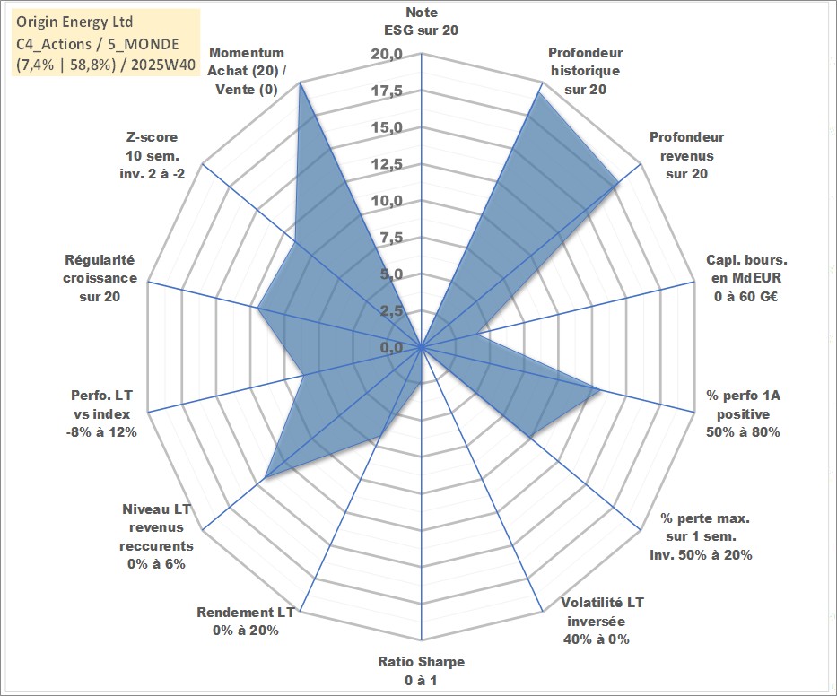 Site dédié aux investisseursPage dédiée sur site financeAnalyse des valorisations hebdomadaires de l'action Origin Energy Ltd. Cet actif est cote en AUD. Les valorisations sont en contrevaleur EURO et couvrent les semaines 1999W08 a 2025W40. Les revenus de cet actif financier sont pris en compte depuis la semaine 2000W41. La note ESG de cet actif n'est pas connue.