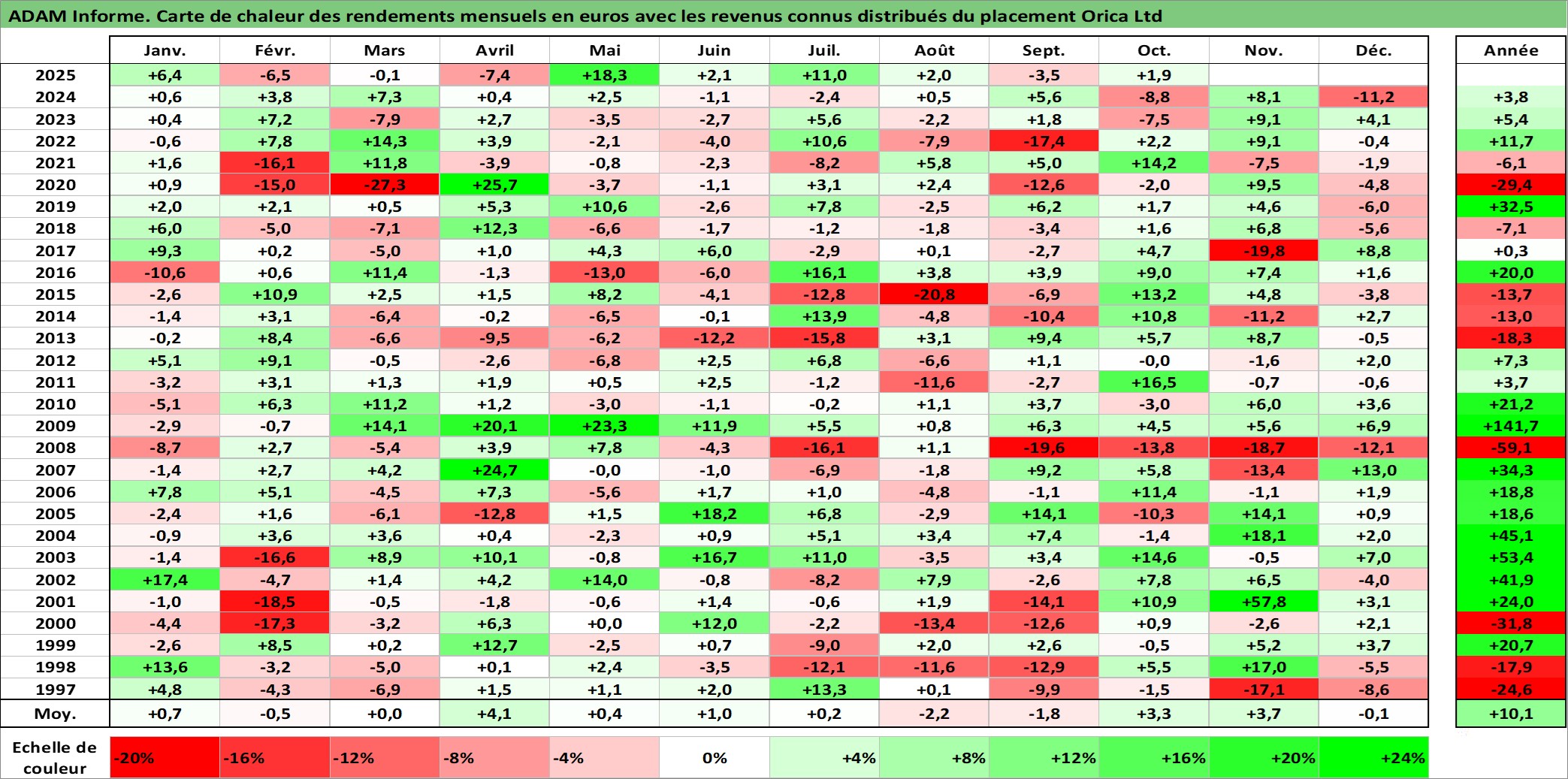 Site dédié aux investisseursPage dédiée sur site financeAnalyse des valorisations hebdomadaires de l'action Orica Ltd. Cet actif est cote en AUD. Les valorisations sont en contrevaleur EURO et couvrent les semaines 1997W01 a 2025W40. Les revenus de cet actif financier sont pris en compte depuis la semaine 1997W01. La note globale ESG de cet actif est estimee a 5.0 (apres rebasage entre 0 et 20).