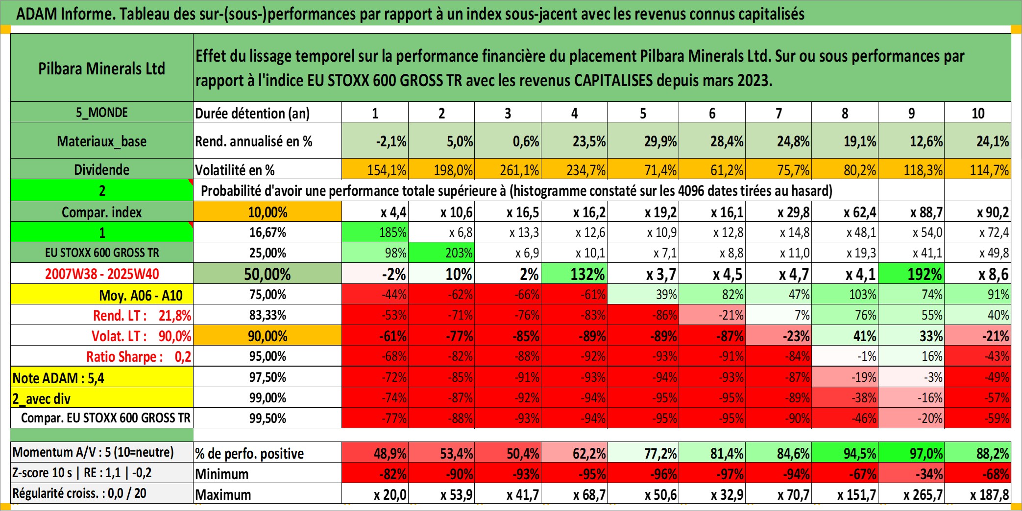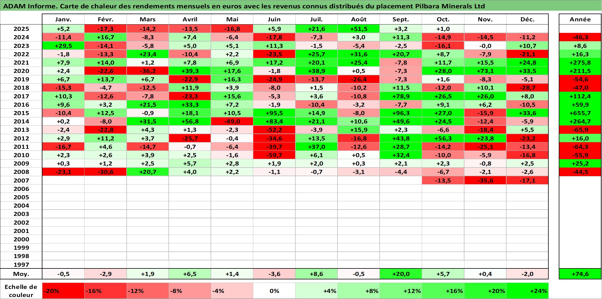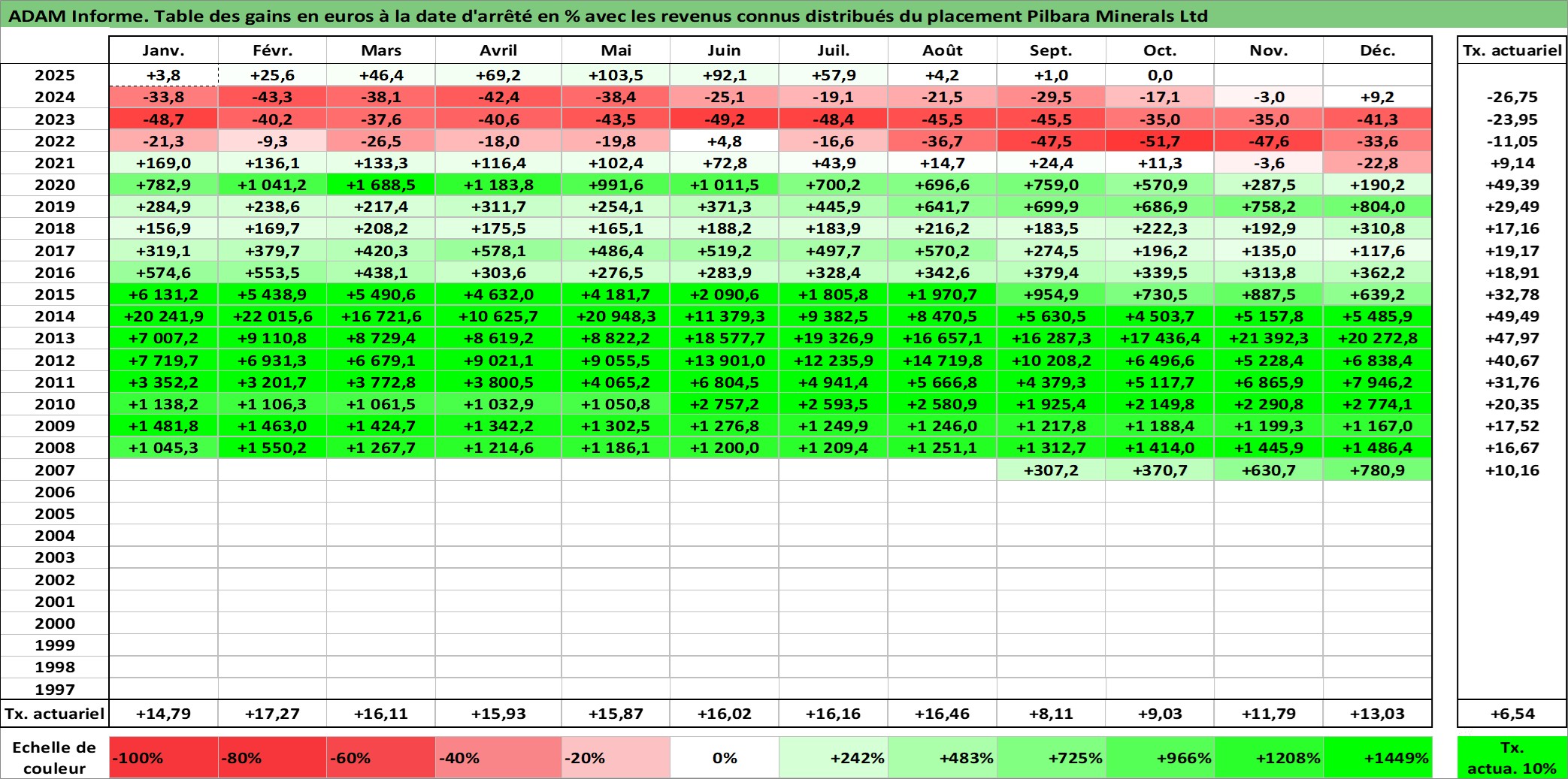 Site dédié aux investisseursPage dédiée sur site financeAnalyse des valorisations hebdomadaires de l'action Pilbara Minerals Ltd. Cet actif est cote en AUD. Les valorisations sont en contrevaleur EURO et couvrent les semaines 2007W38 a 2025W40. Les revenus de cet actif financier sont pris en compte depuis la semaine 2023W09. La note ESG de cet actif n'est pas connue.