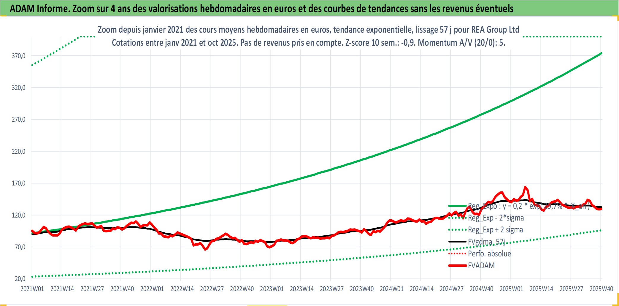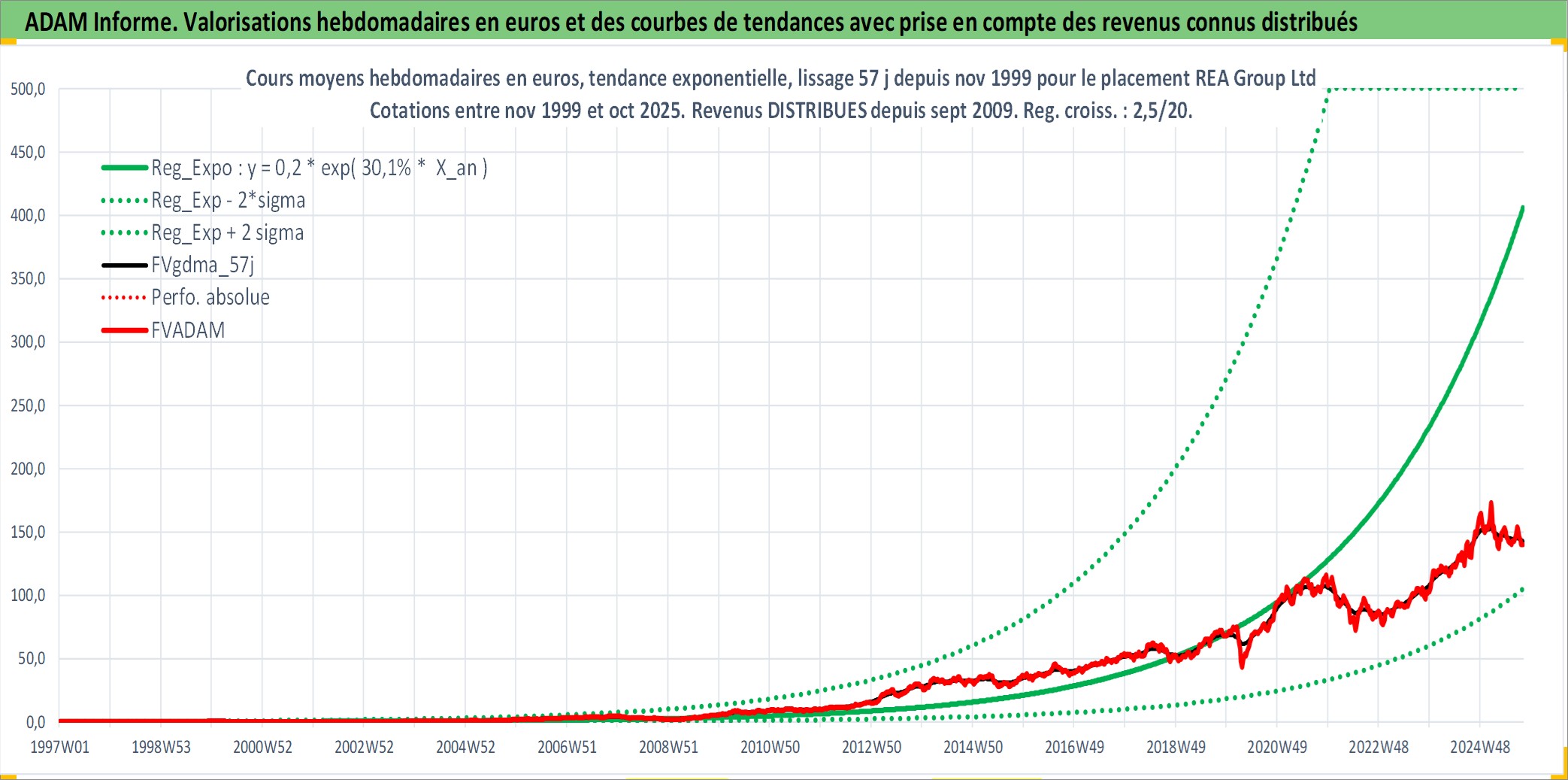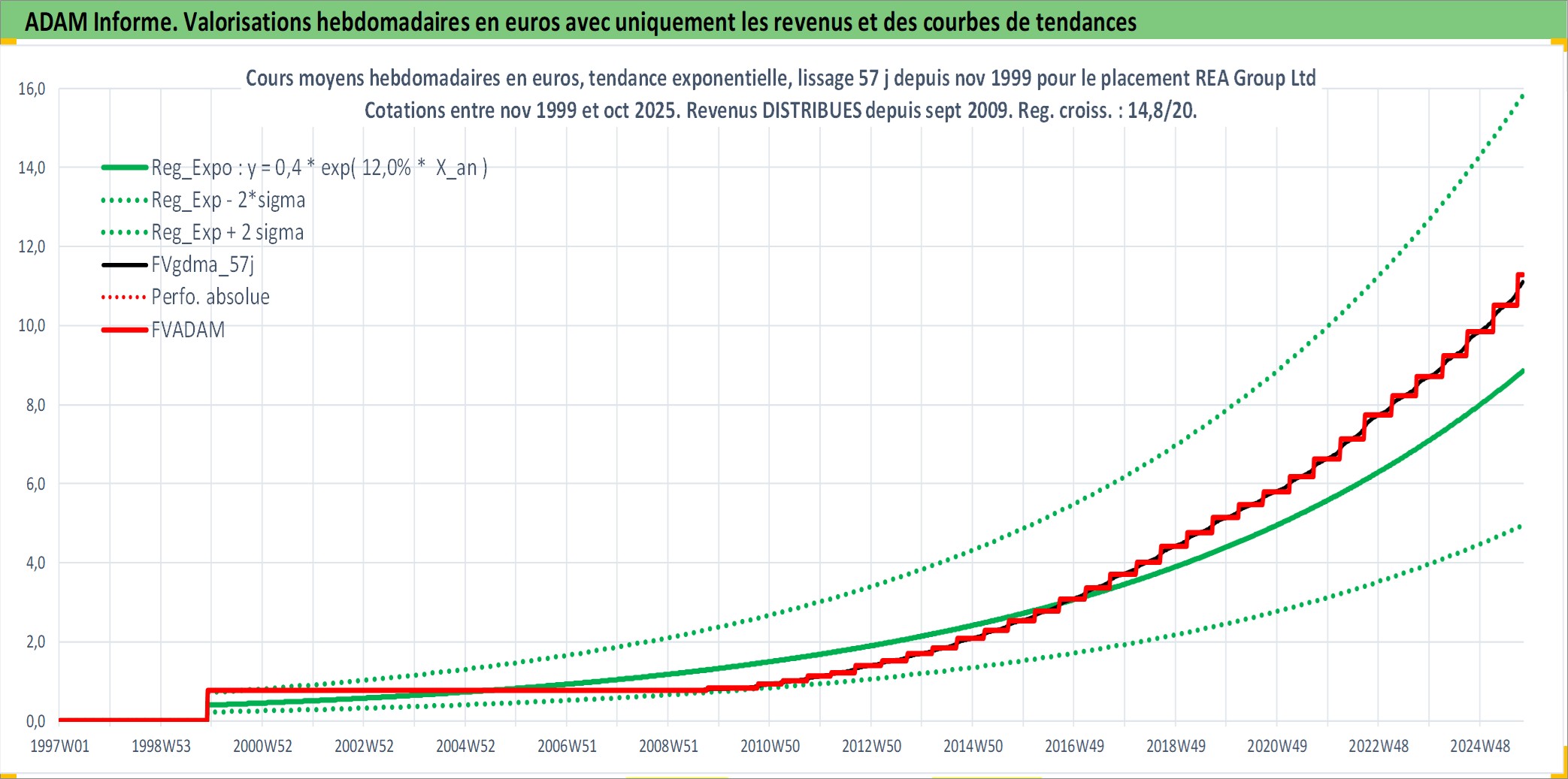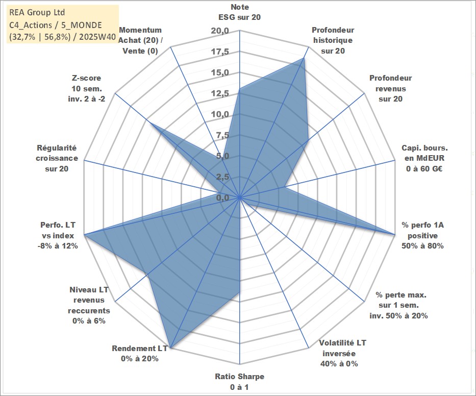 Site dédié aux investisseursPage dédiée sur site financeAnalyse des valorisations hebdomadaires de l'action REA Group Ltd. Cet actif est cote en AUD. Les valorisations sont en contrevaleur EURO et couvrent les semaines 1999W48 a 2025W40. Les revenus de cet actif financier sont pris en compte depuis la semaine 2009W39. La note globale ESG de cet actif est estimee a 13.0 (apres rebasage entre 0 et 20).