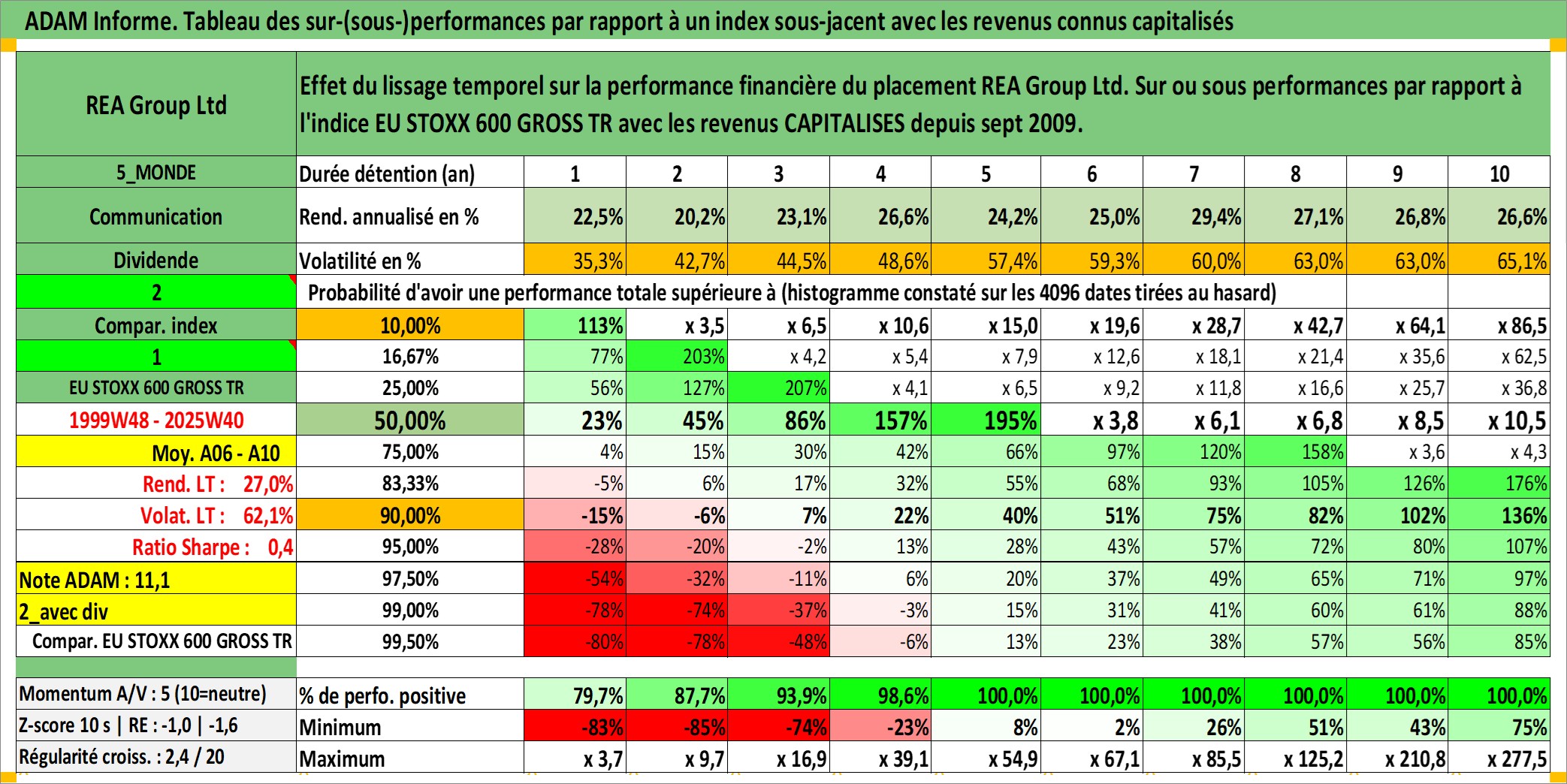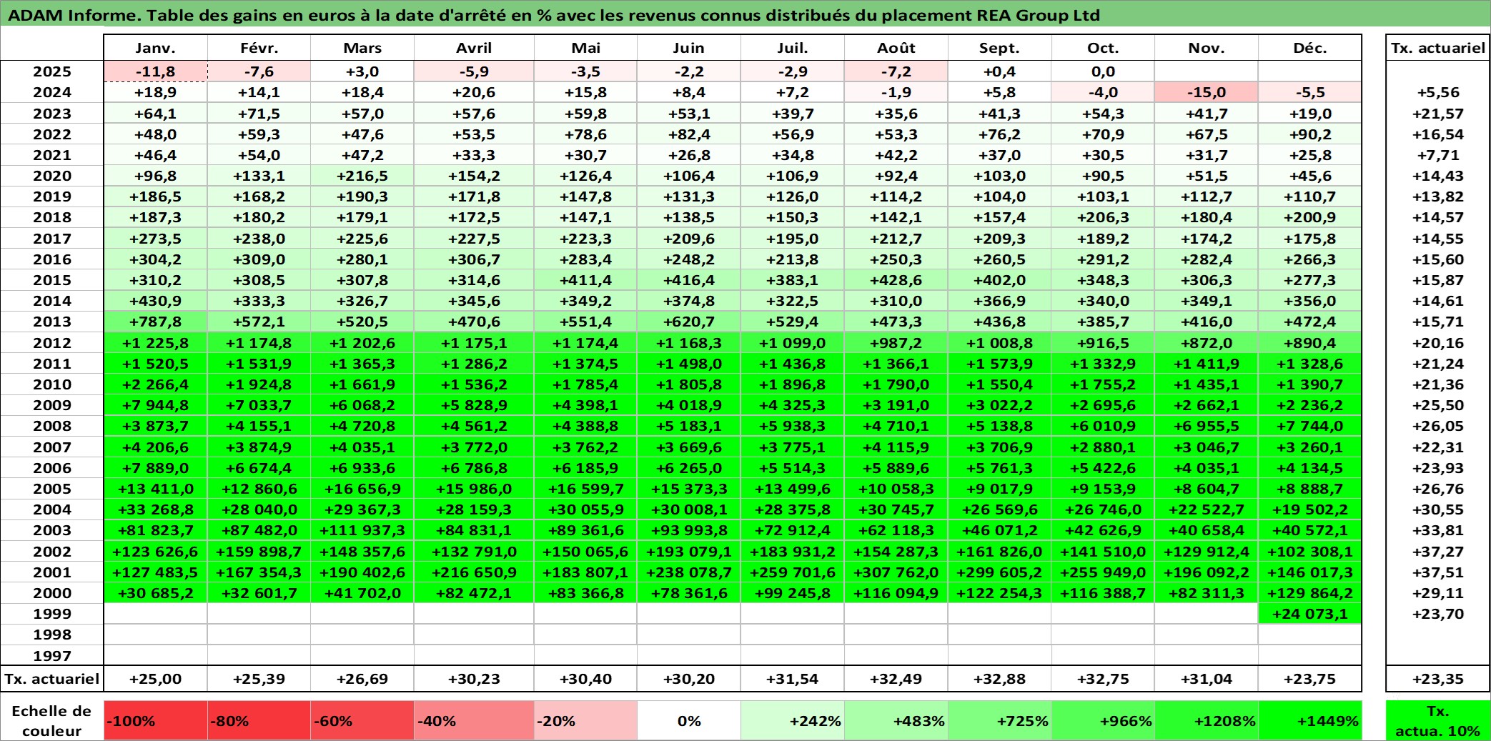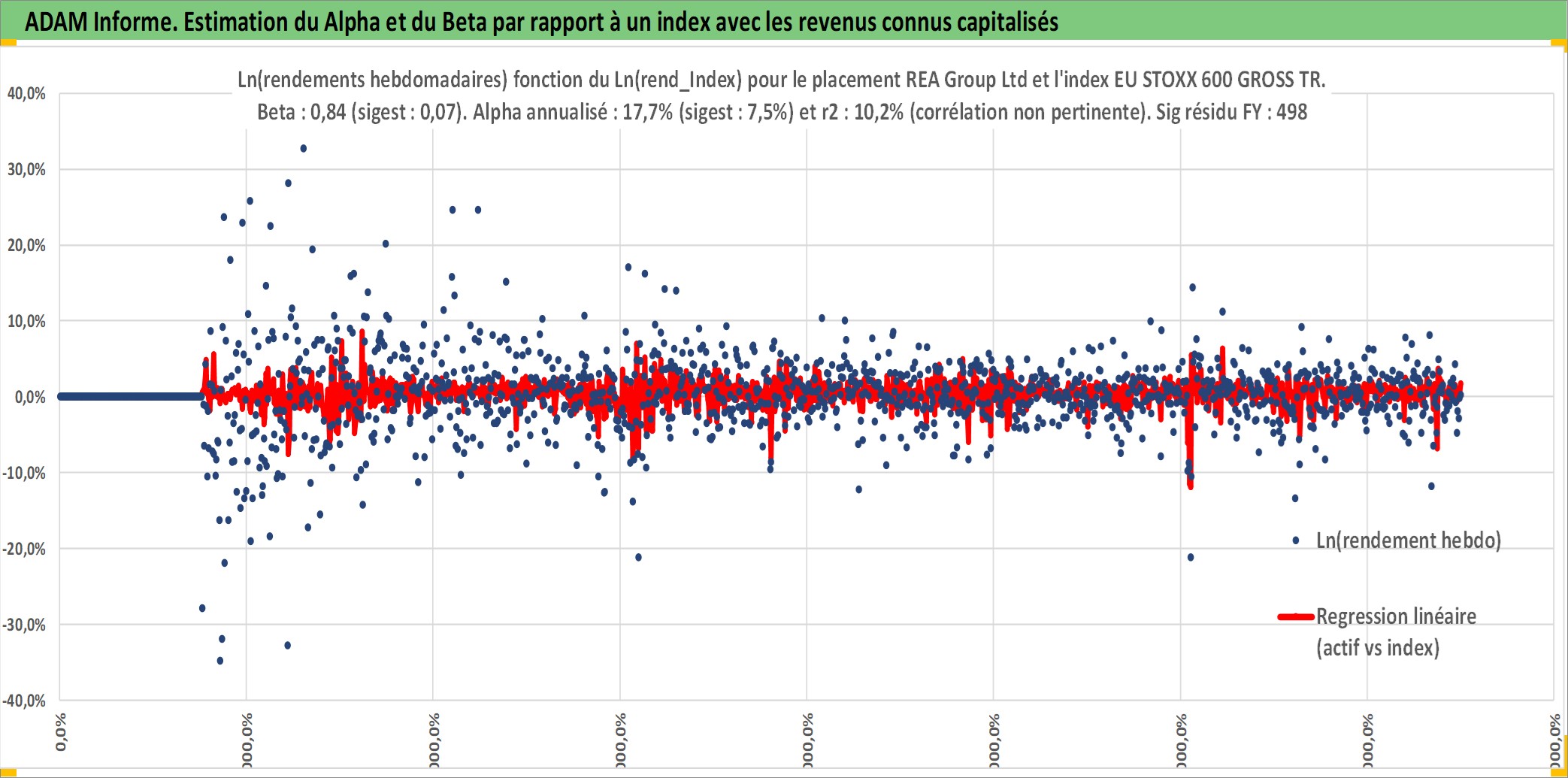 Site dédié aux investisseursPage dédiée sur site financeAnalyse des valorisations hebdomadaires de l'action REA Group Ltd. Cet actif est cote en AUD. Les valorisations sont en contrevaleur EURO et couvrent les semaines 1999W48 a 2025W40. Les revenus de cet actif financier sont pris en compte depuis la semaine 2009W39. La note globale ESG de cet actif est estimee a 13.0 (apres rebasage entre 0 et 20).