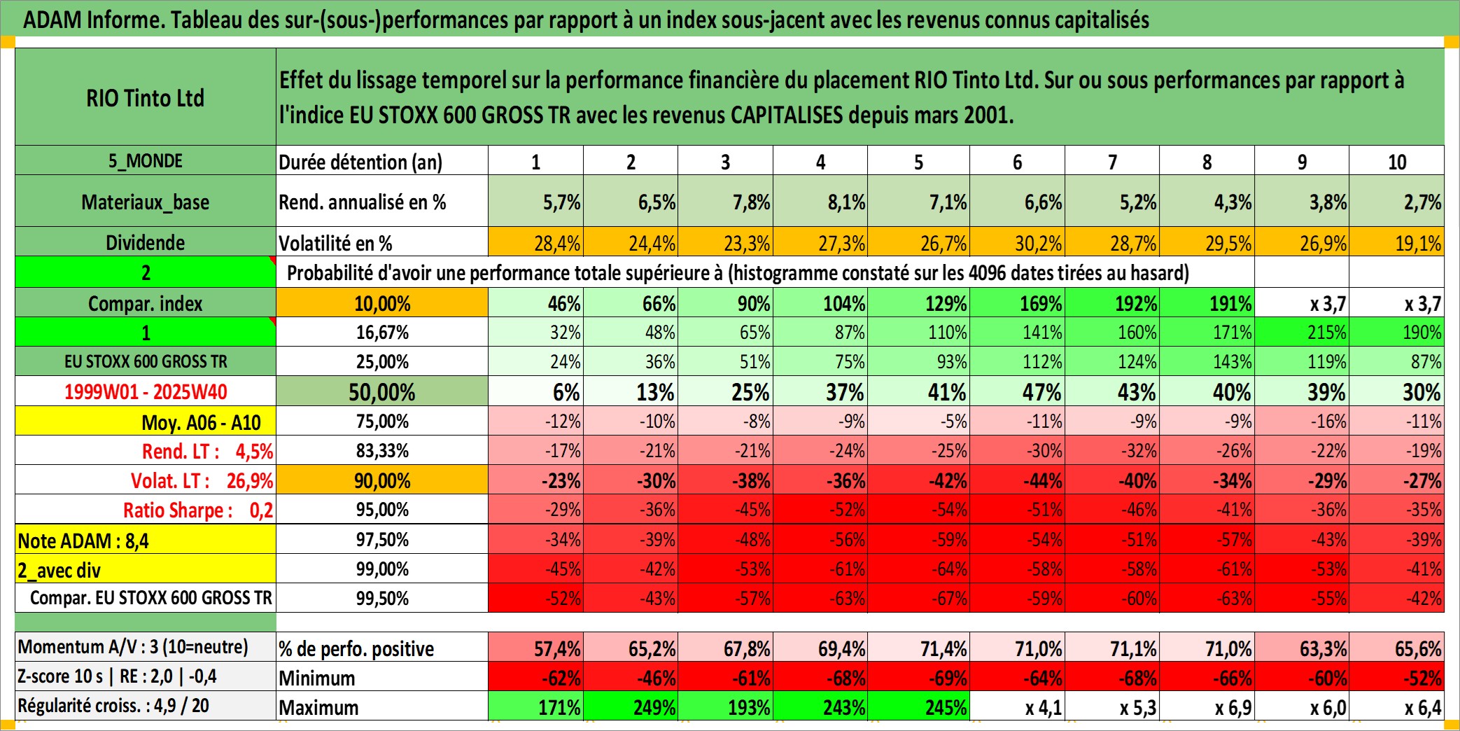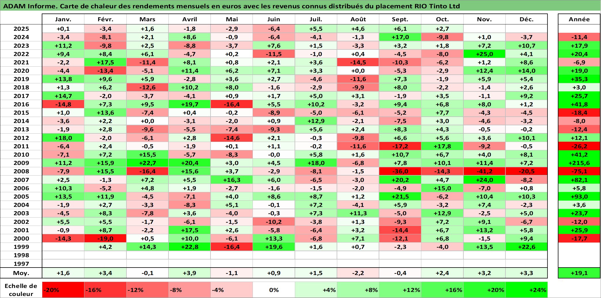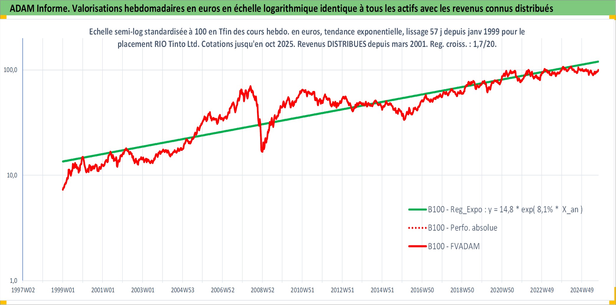 Site dédié aux investisseursPage dédiée sur site financeAnalyse des valorisations hebdomadaires de l'action RIO Tinto Ltd. Cet actif est cote en AUD. Les valorisations sont en contrevaleur EURO et couvrent les semaines 1999W01 a 2025W40. Les revenus de cet actif financier sont pris en compte depuis la semaine 2001W09. La note globale ESG de cet actif est estimee a 4.0 (apres rebasage entre 0 et 20).