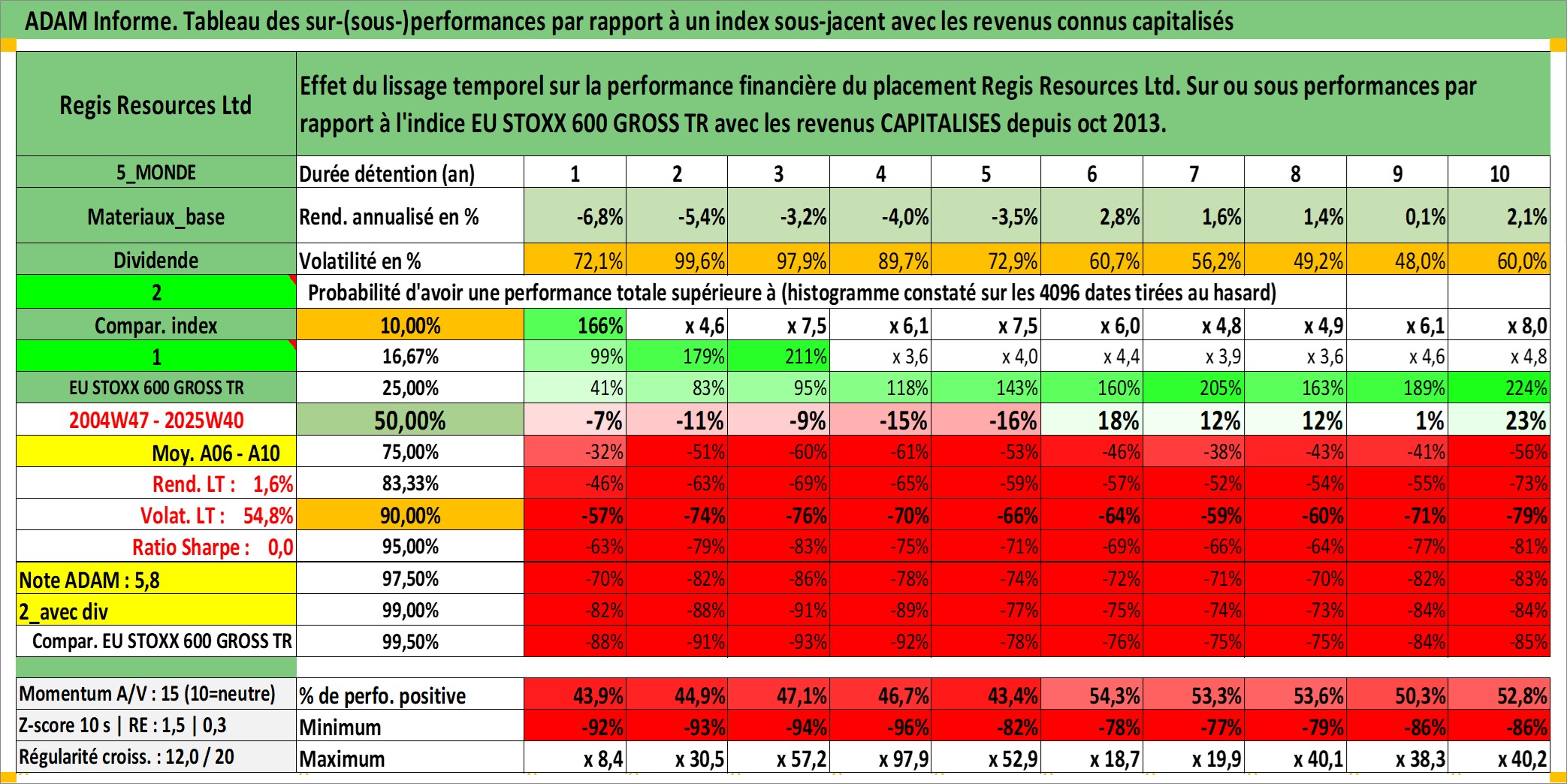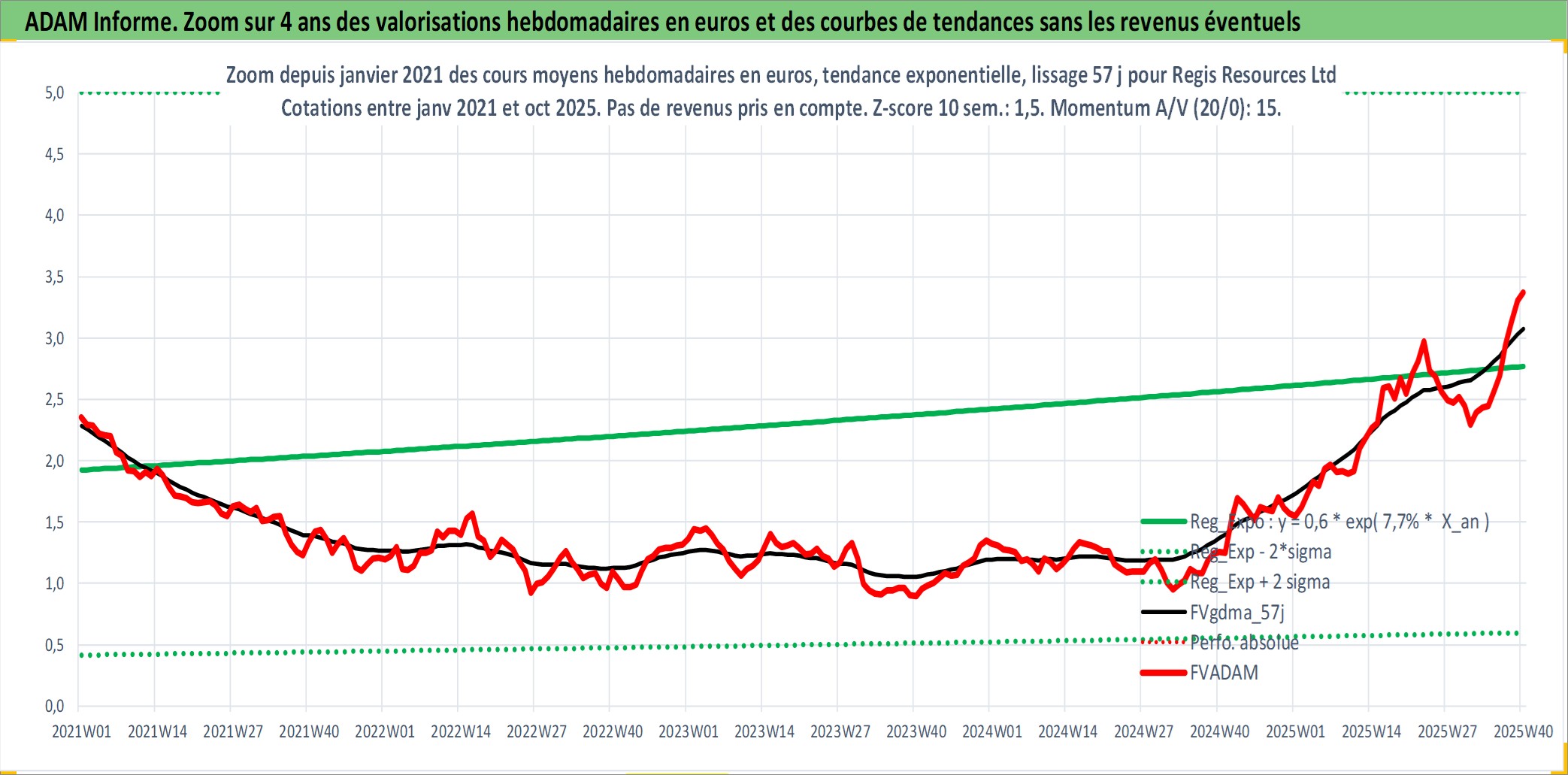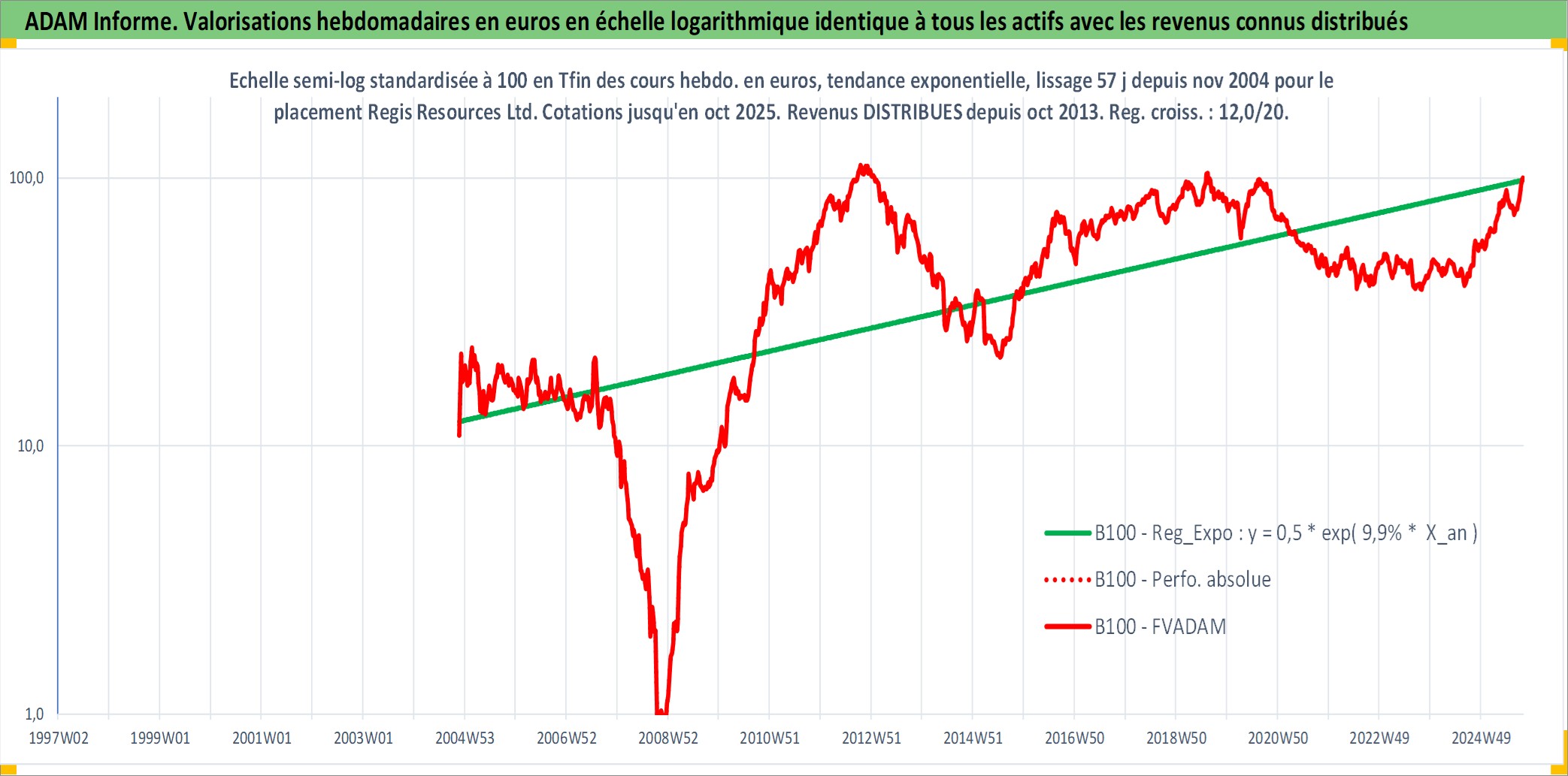 Site dédié aux investisseursPage dédiée sur site financeAnalyse des valorisations hebdomadaires de l'action Regis Resources Ltd. Cet actif est cote en AUD. Les valorisations sont en contrevaleur EURO et couvrent les semaines 2004W47 a 2025W40. Les revenus de cet actif financier sont pris en compte depuis la semaine 2013W41. La note ESG de cet actif n'est pas connue.