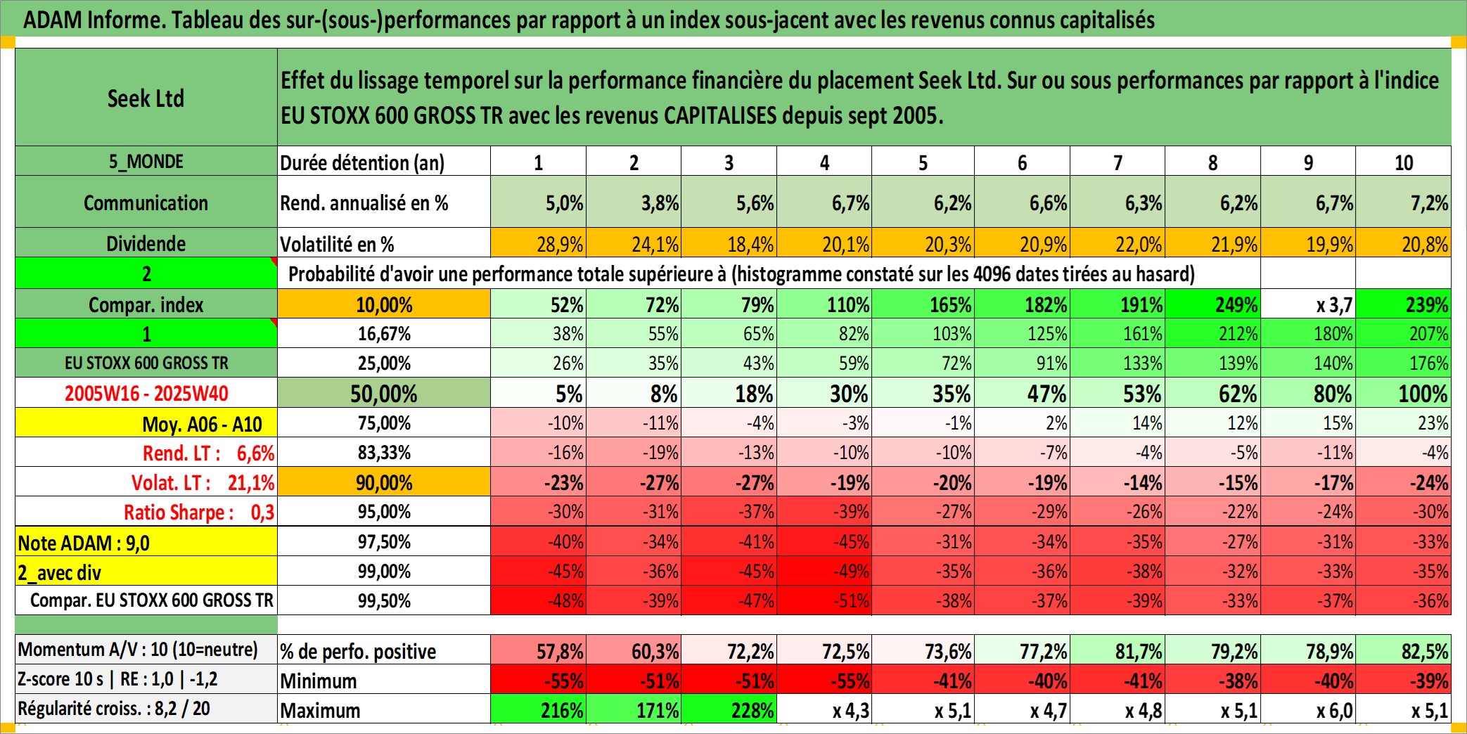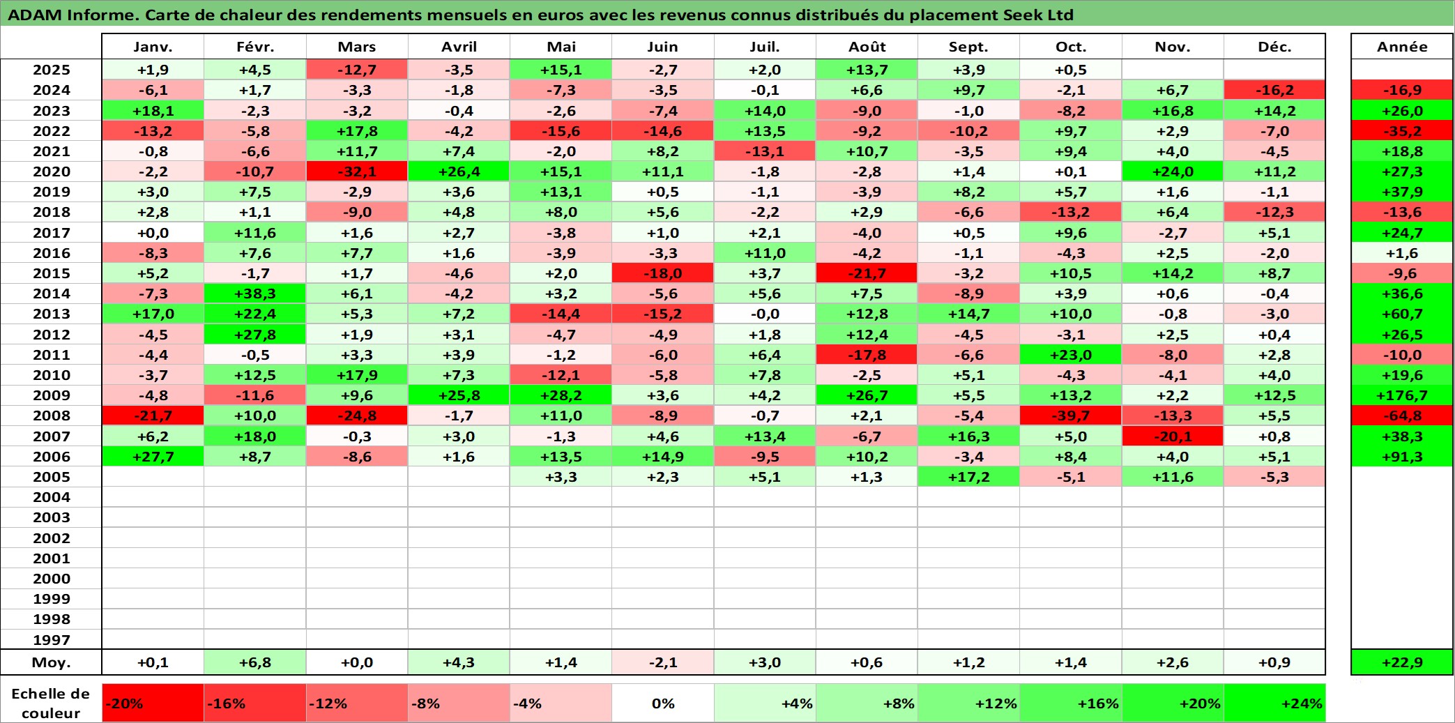 Site dédié aux investisseursPage dédiée sur site financeAnalyse des valorisations hebdomadaires de l'action Seek Ltd. Cet actif est cote en AUD. Les valorisations sont en contrevaleur EURO et couvrent les semaines 2005W16 a 2025W40. Les revenus de cet actif financier sont pris en compte depuis la semaine 2005W37. La note ESG de cet actif n'est pas connue.