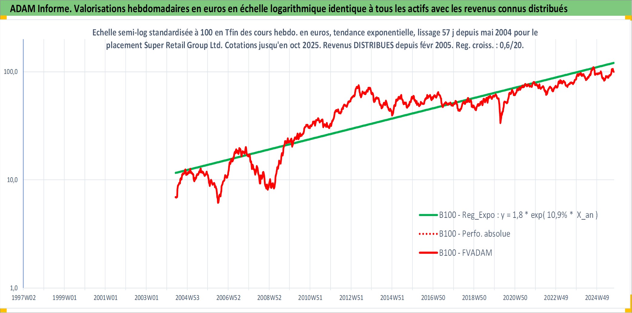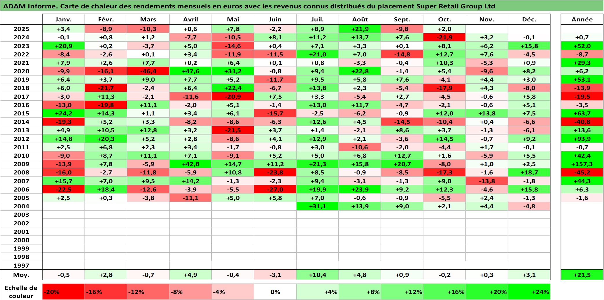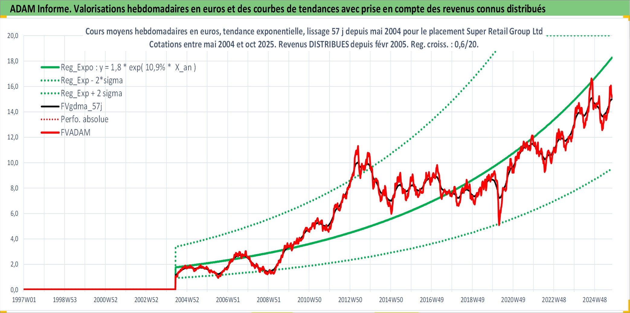 Site dédié aux investisseursPage dédiée sur site financeAnalyse des valorisations hebdomadaires de l'action Super Retail Group Ltd. Cet actif est cote en AUD. Les valorisations sont en contrevaleur EURO et couvrent les semaines 2004W23 a 2025W40. Les revenus de cet actif financier sont pris en compte depuis la semaine 2005W08. La note ESG de cet actif n'est pas connue.