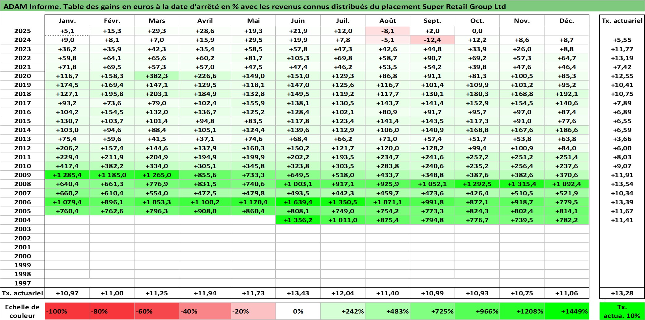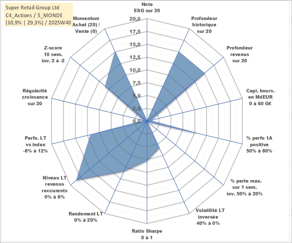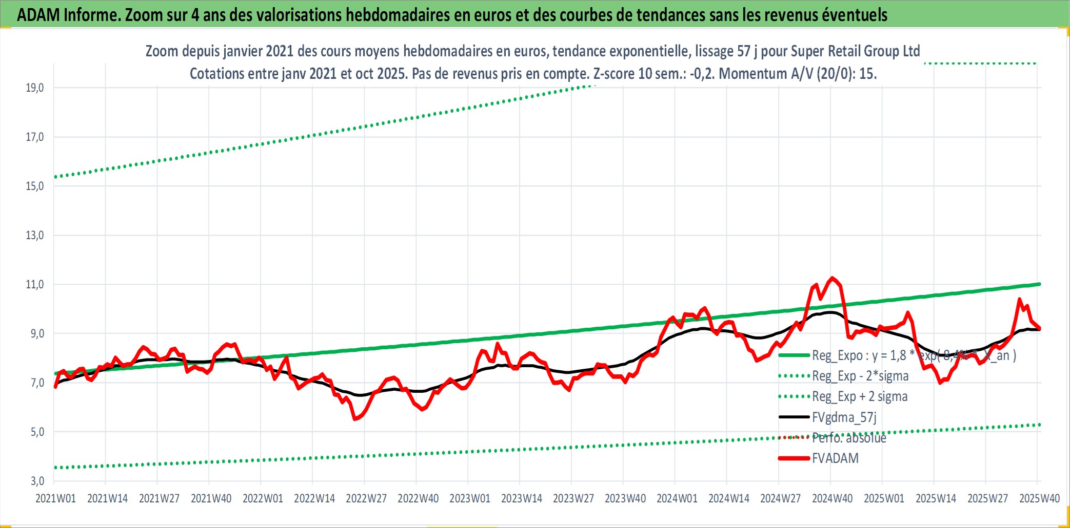 Site dédié aux investisseursPage dédiée sur site financeAnalyse des valorisations hebdomadaires de l'action Super Retail Group Ltd. Cet actif est cote en AUD. Les valorisations sont en contrevaleur EURO et couvrent les semaines 2004W23 a 2025W40. Les revenus de cet actif financier sont pris en compte depuis la semaine 2005W08. La note ESG de cet actif n'est pas connue.
