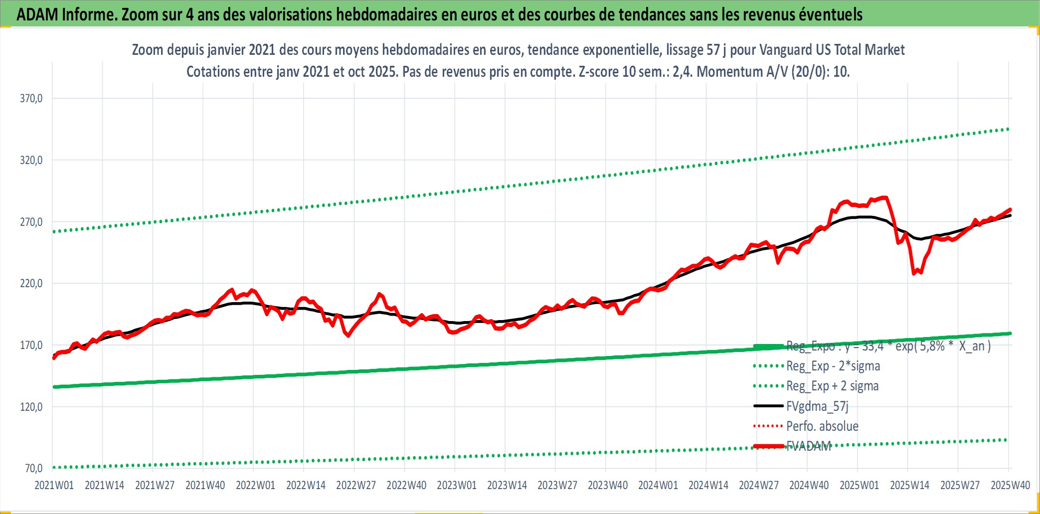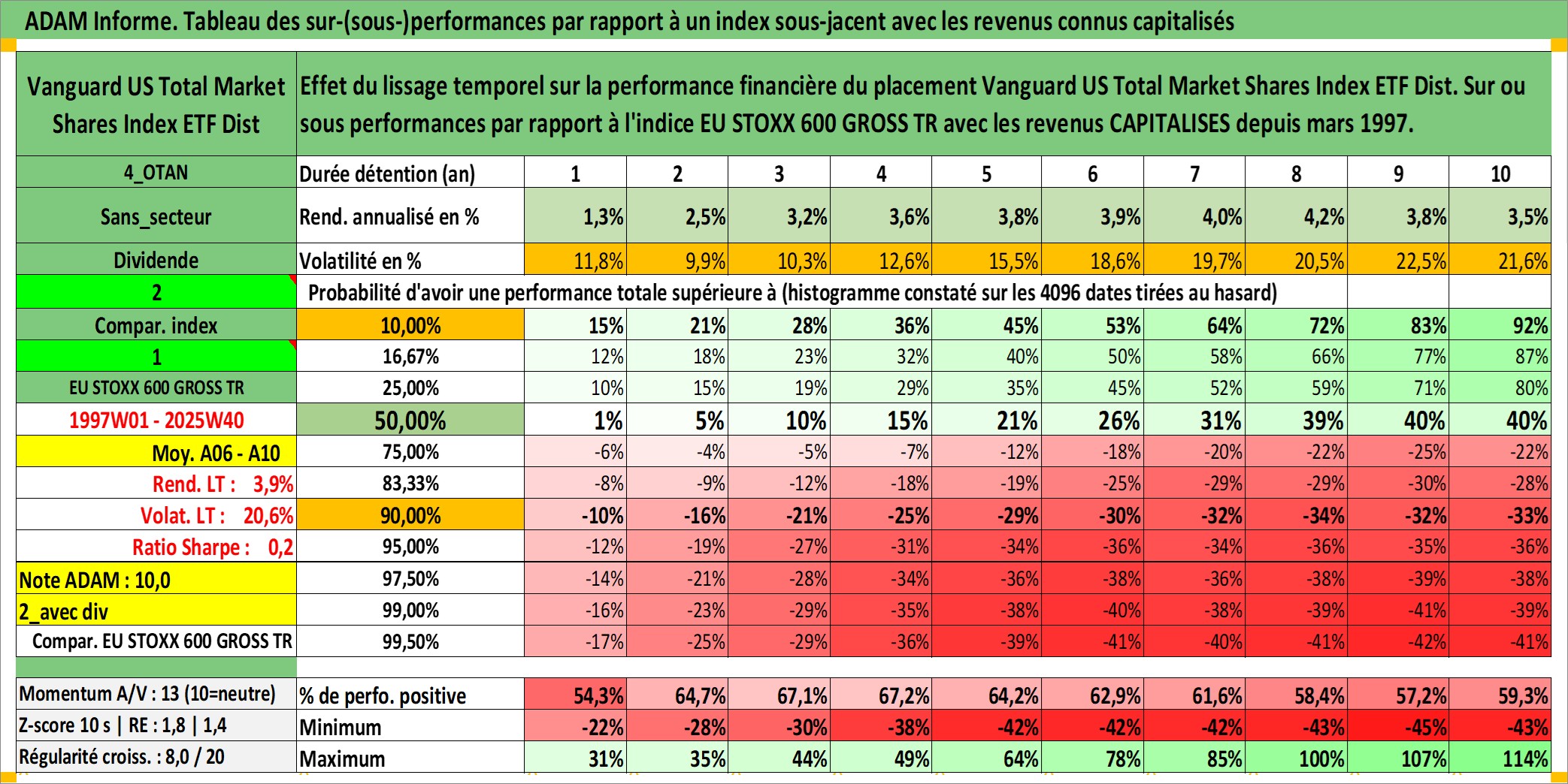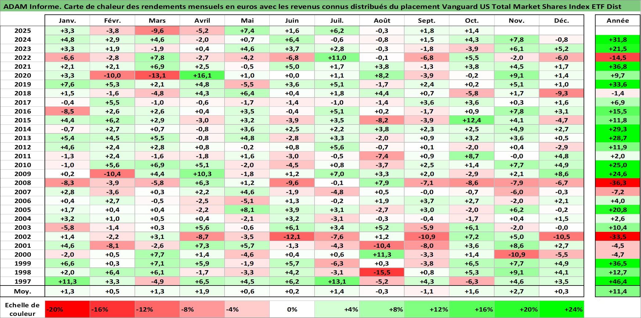 Site dédié aux investisseursPage dédiée sur site financeAnalyse des valorisations hebdomadaires du fonds Vanguard US Total Market Shares Index ETF Dist. Cet actif est cote en AUD. Les valorisations sont en contrevaleur EURO et couvrent les semaines 1997W01 a 2025W40. Les revenus de cet actif financier sont pris en compte depuis la semaine 1997W12. La note ESG de cet actif n'est pas connue.