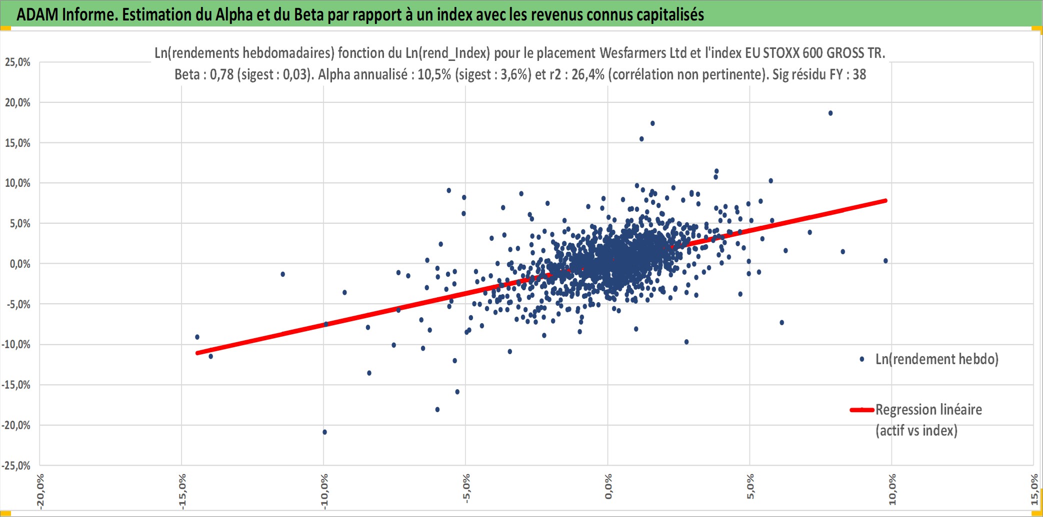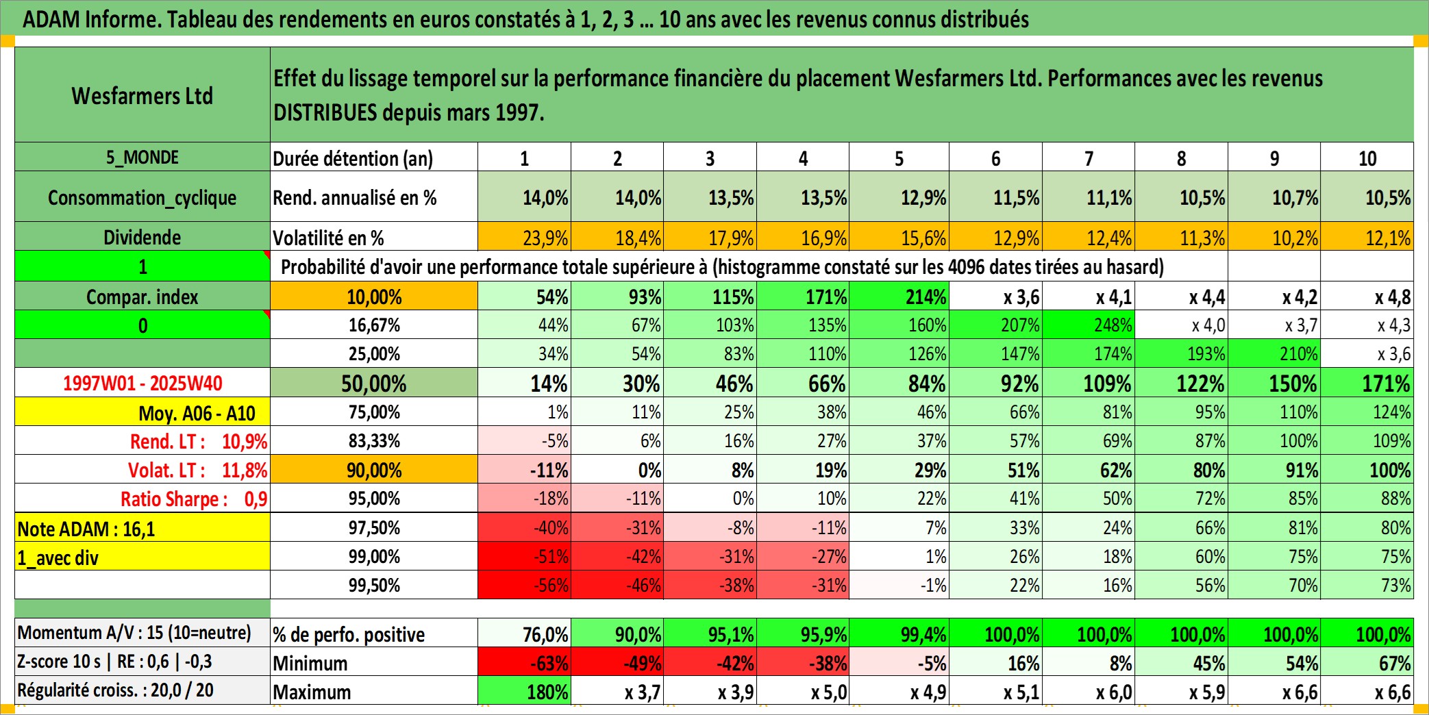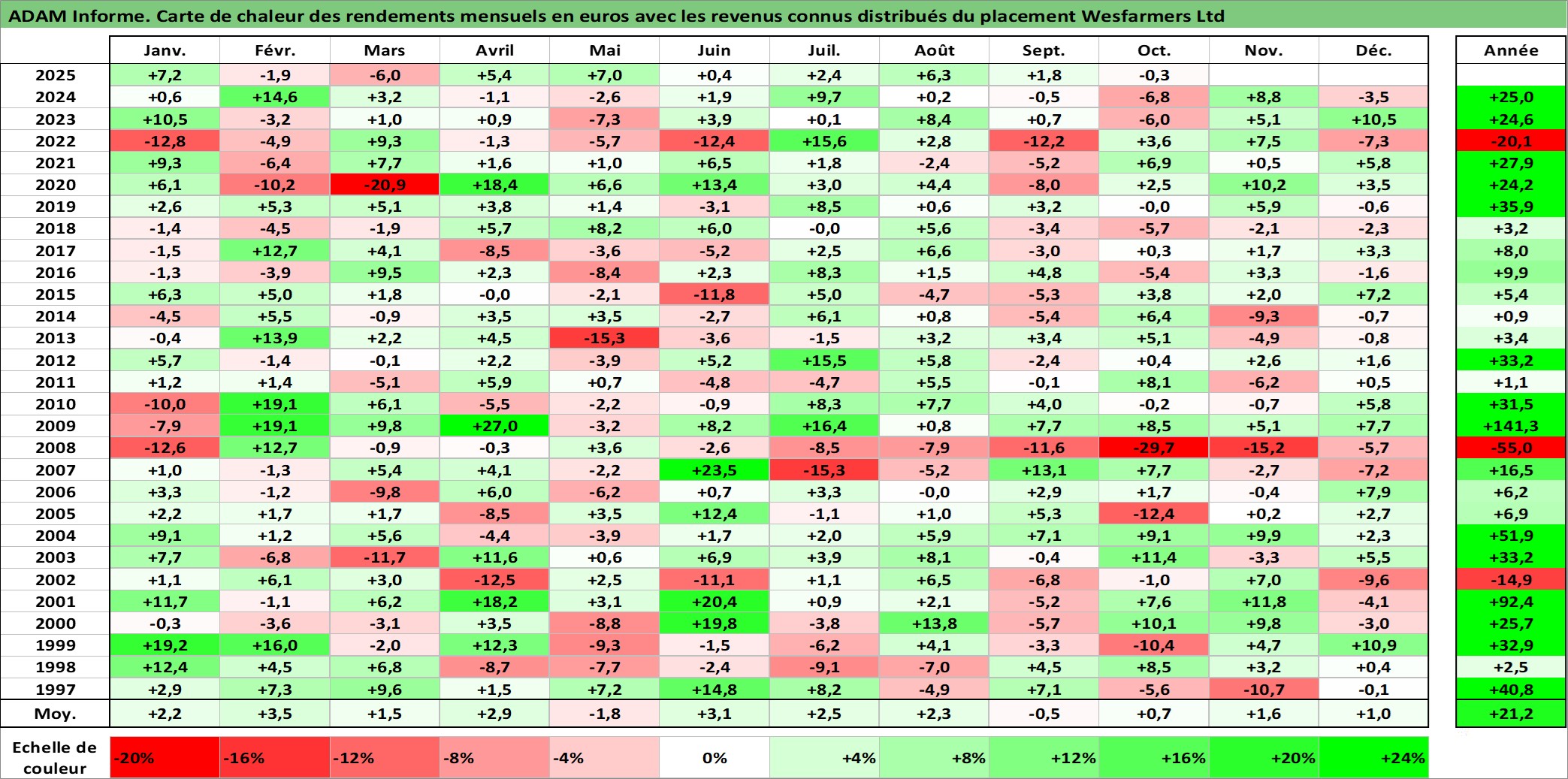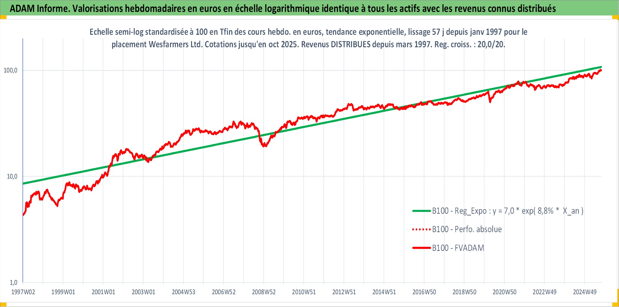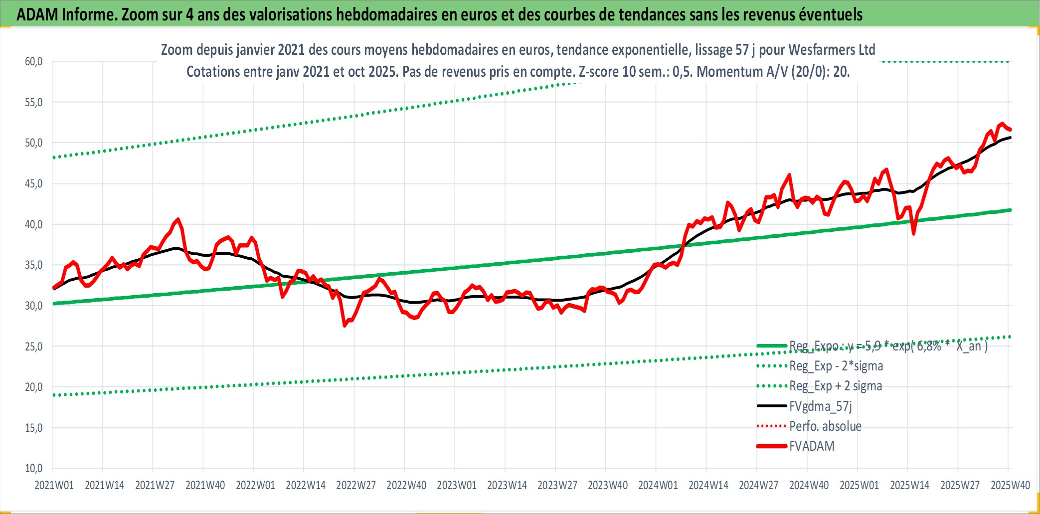 Site dédié aux investisseursPage dédiée sur site financeAnalyse des valorisations hebdomadaires de l'action Wesfarmers Ltd. Cet actif est cote en AUD. Les valorisations sont en contrevaleur EURO et couvrent les semaines 1997W01 a 2025W40. Les revenus de cet actif financier sont pris en compte depuis la semaine 1997W12. La note globale ESG de cet actif est estimee a 15.0 (apres rebasage entre 0 et 20).