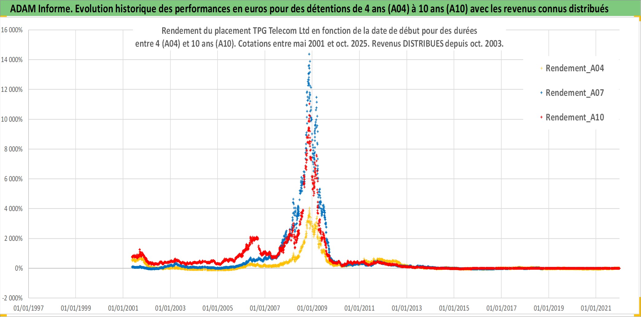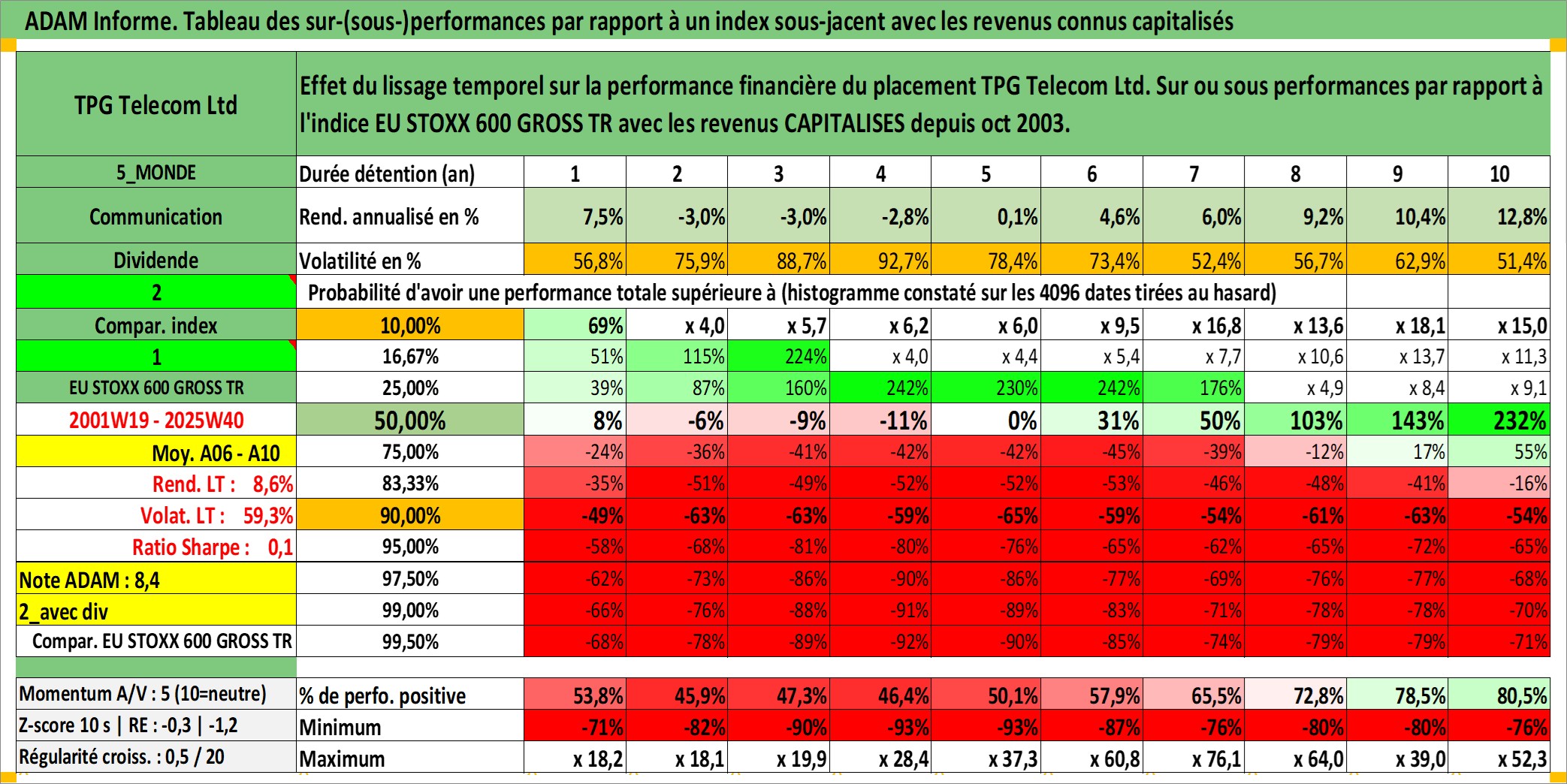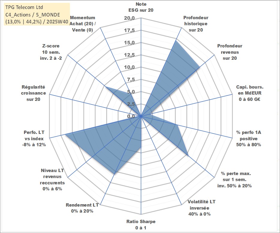 Site dédié aux investisseursPage dédiée sur site financeAnalyse des valorisations hebdomadaires de l'action TPG Telecom Ltd. Cet actif est cote en AUD. Les valorisations sont en contrevaleur EURO et couvrent les semaines 2001W19 a 2025W40. Les revenus de cet actif financier sont pris en compte depuis la semaine 2003W40. La note ESG de cet actif n'est pas connue.
