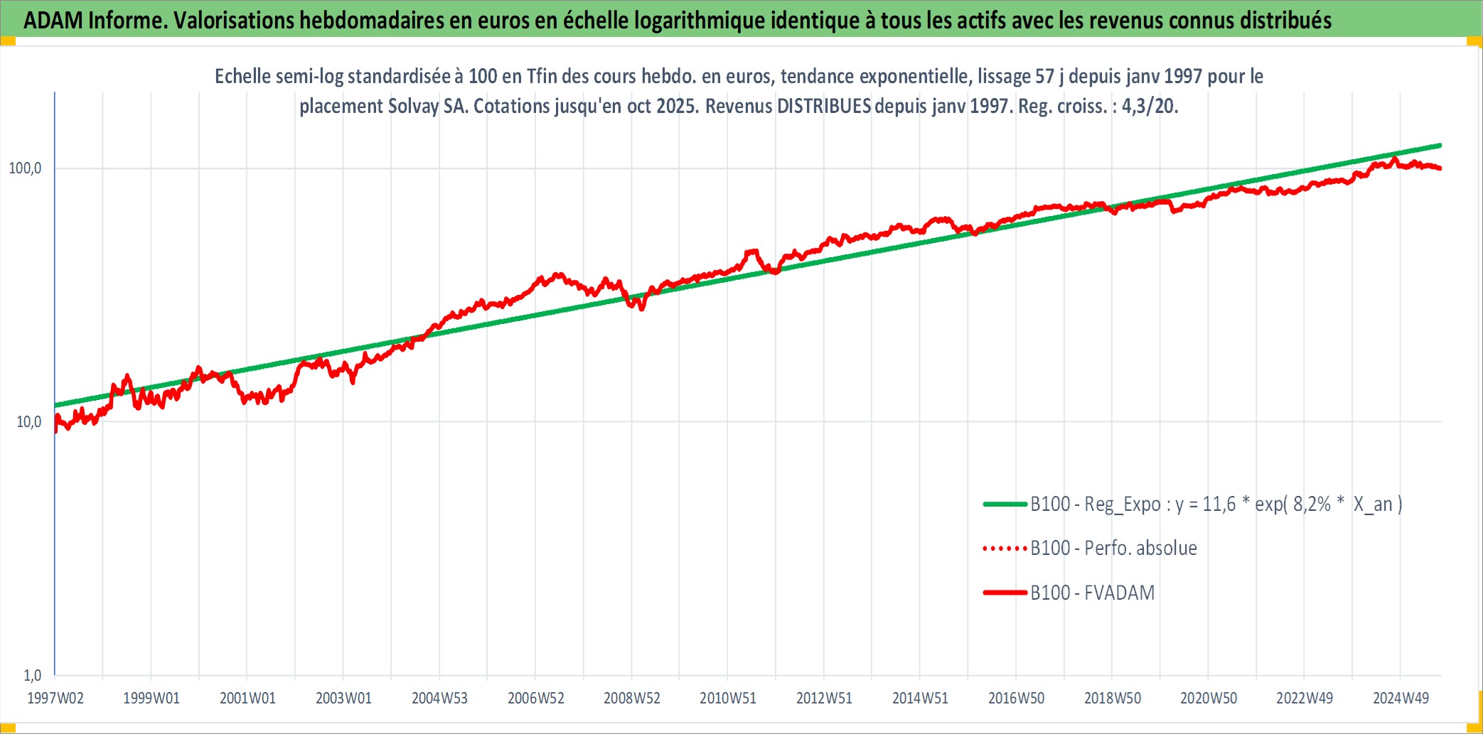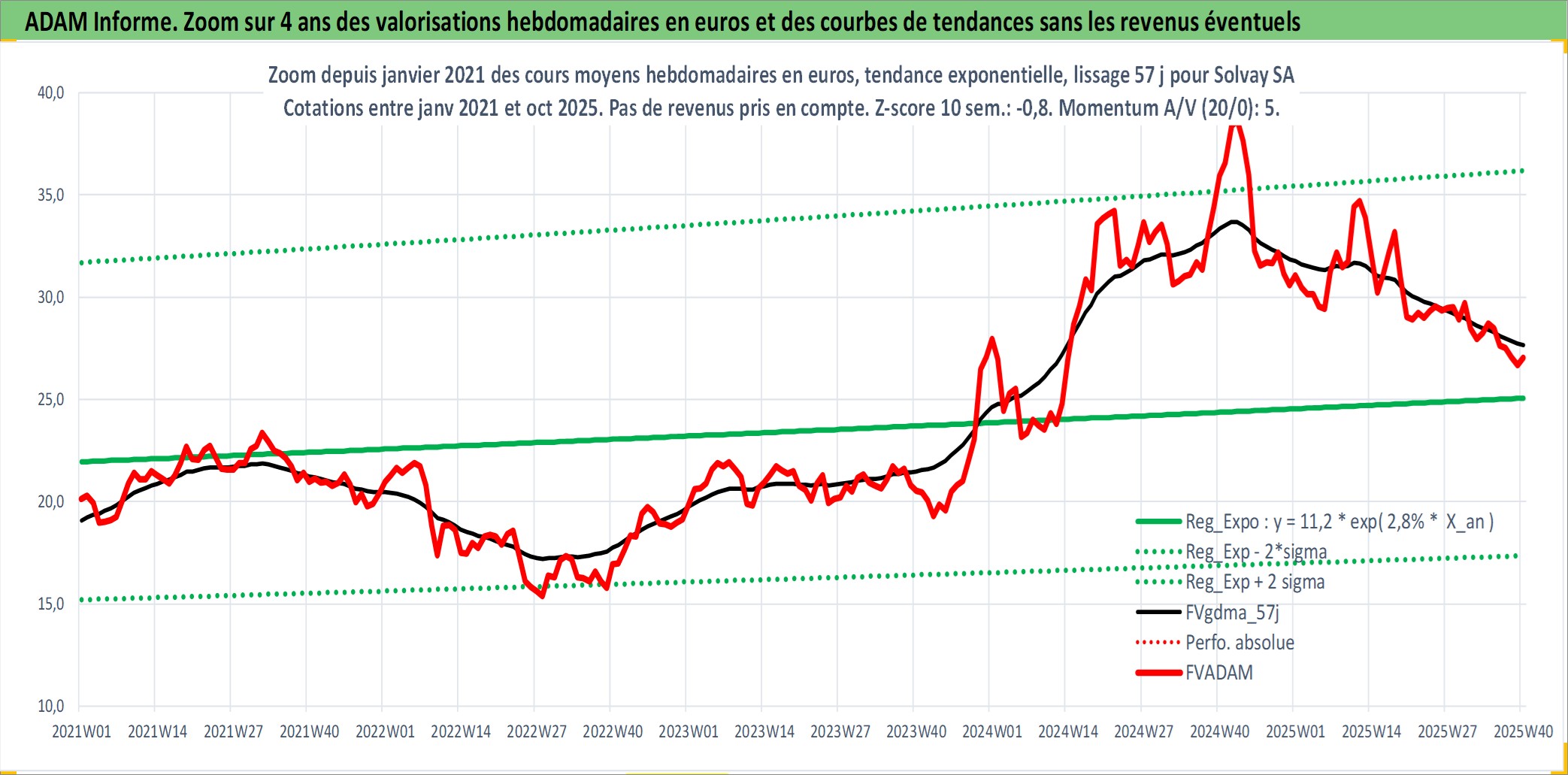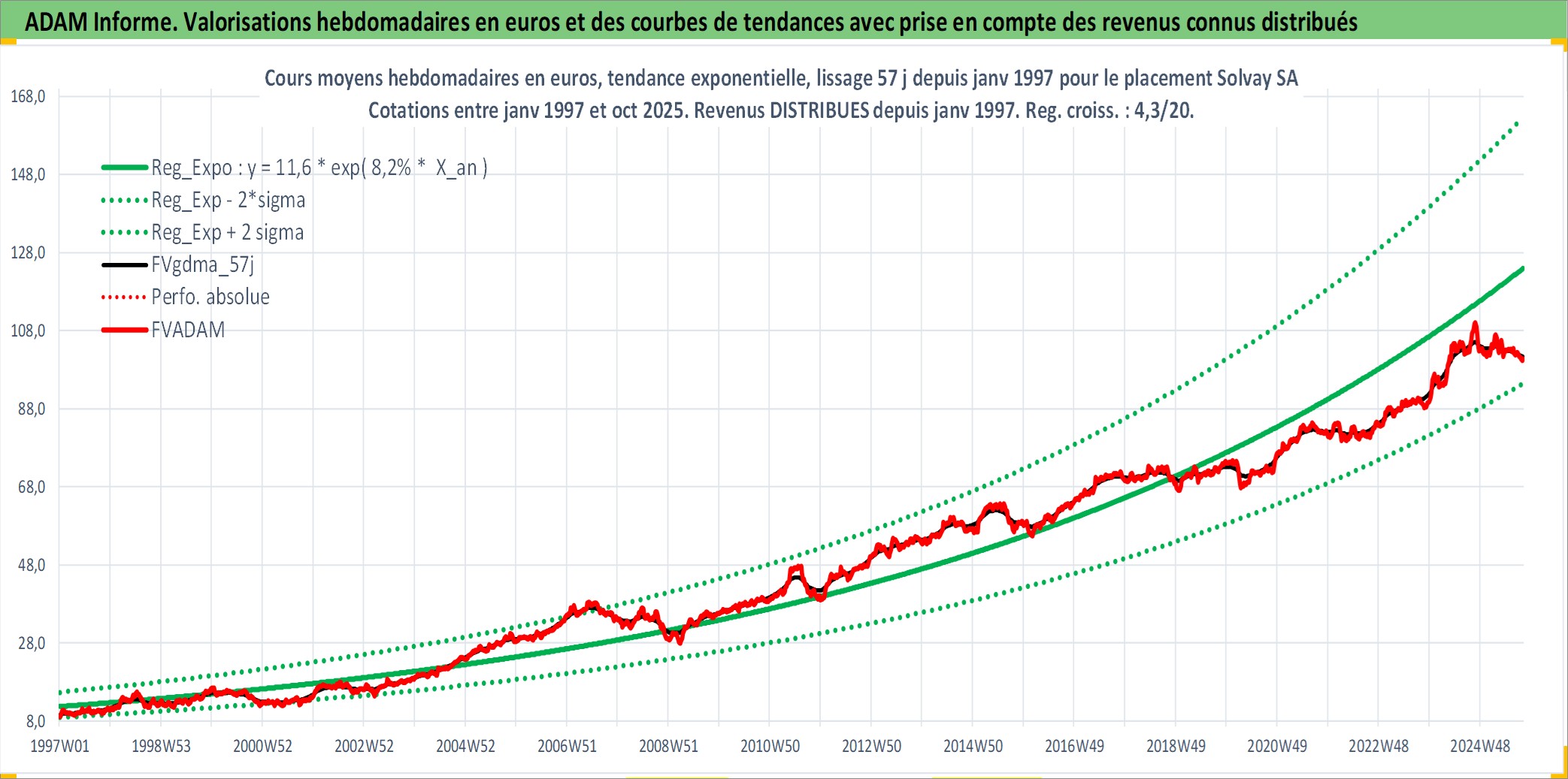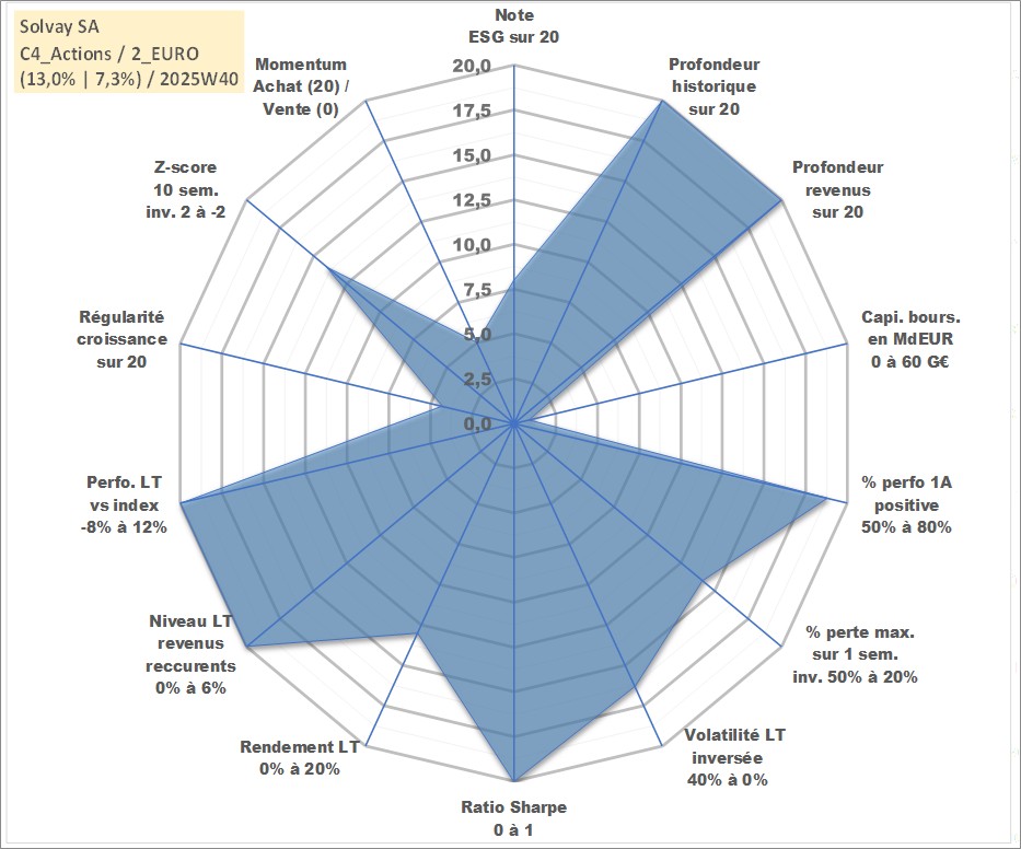 Site dédié aux investisseursPage dédiée sur site financeAnalyse des valorisations hebdomadaires de l'action Solvay SA. Cet actif est cote en EUR. Les valorisations couvrent les semaines 1997W01 a 2025W40. Les revenus de cet actif financier sont pris en compte depuis la semaine 1997W04. La note globale ESG de cet actif est estimee a 8.0 (apres rebasage entre 0 et 20).