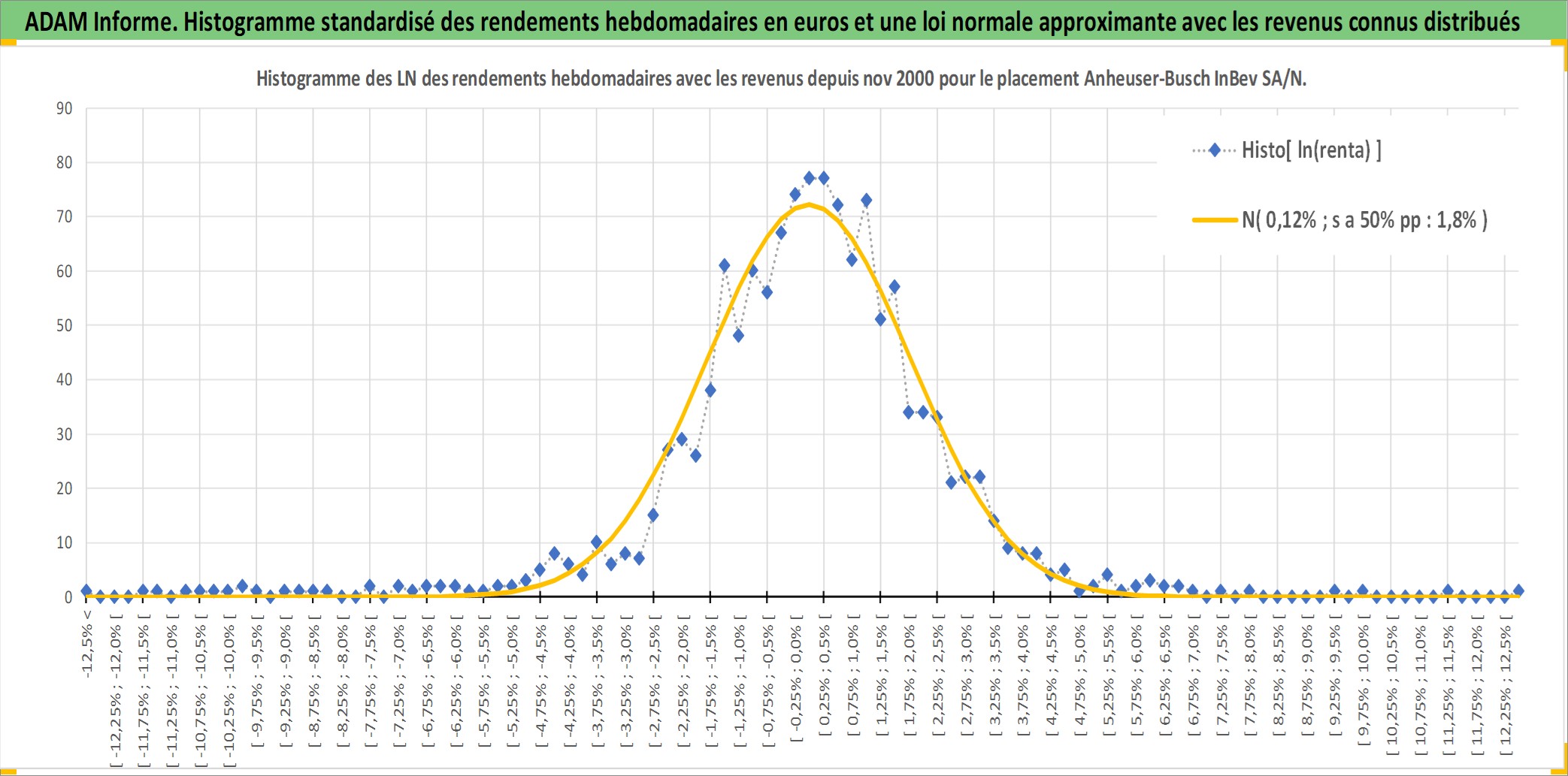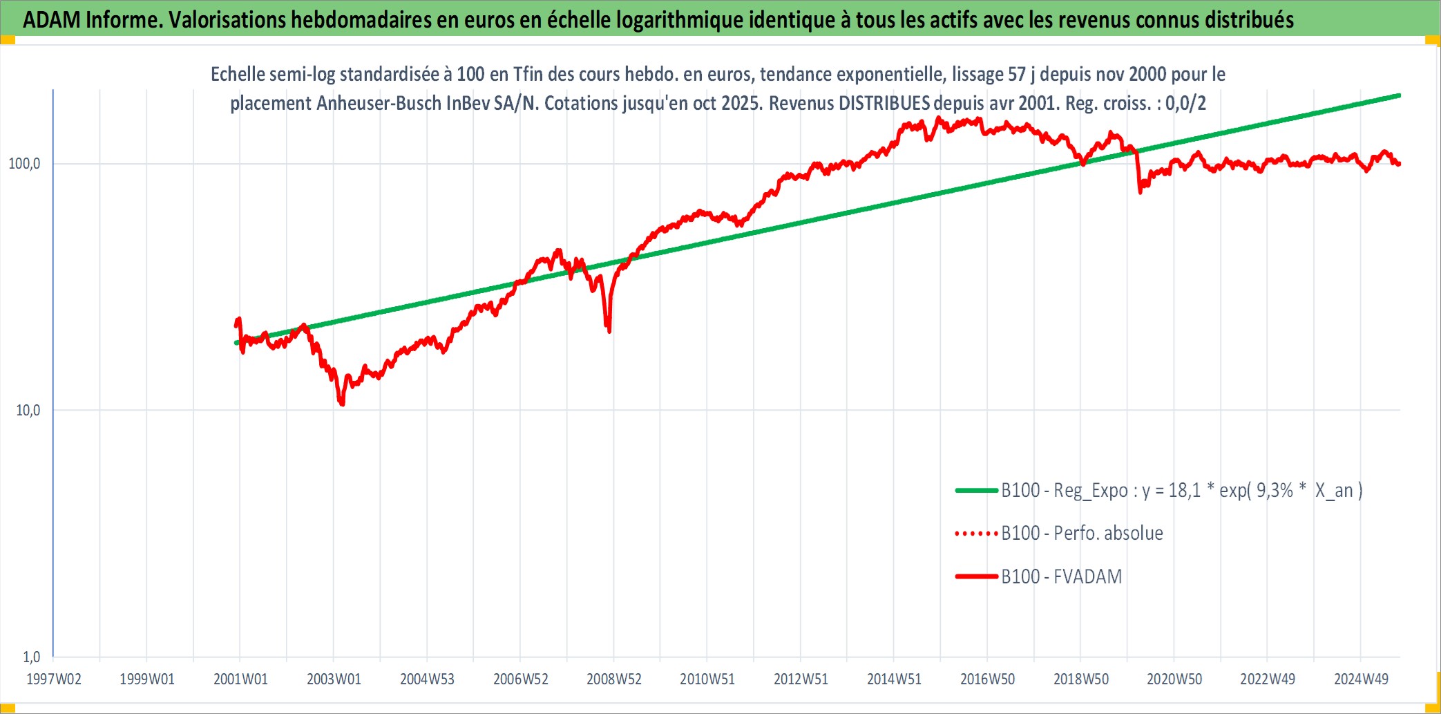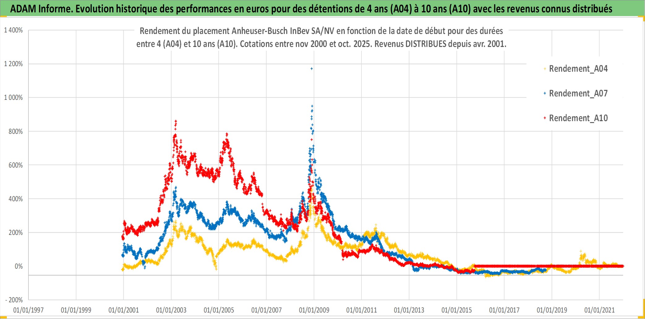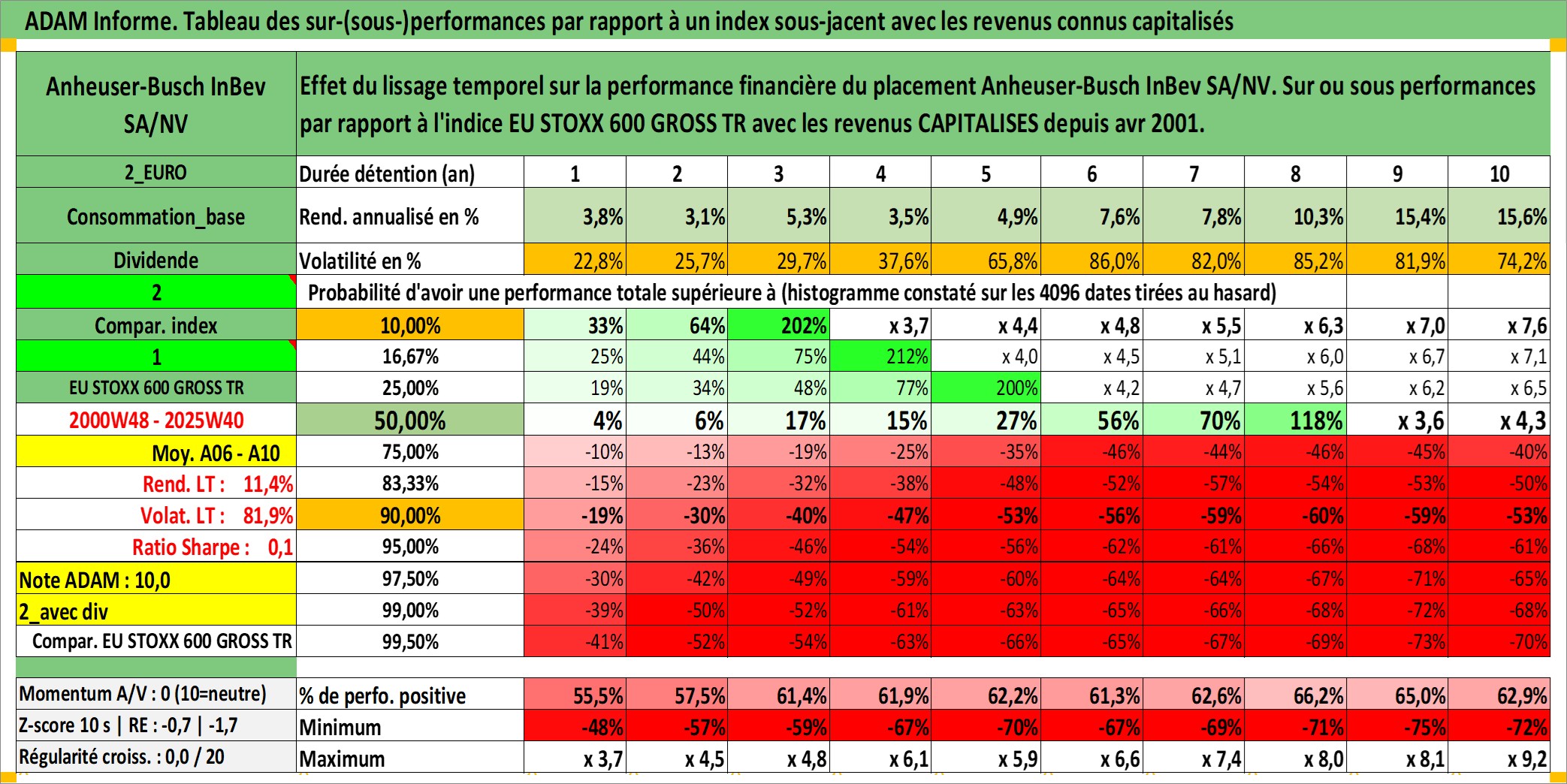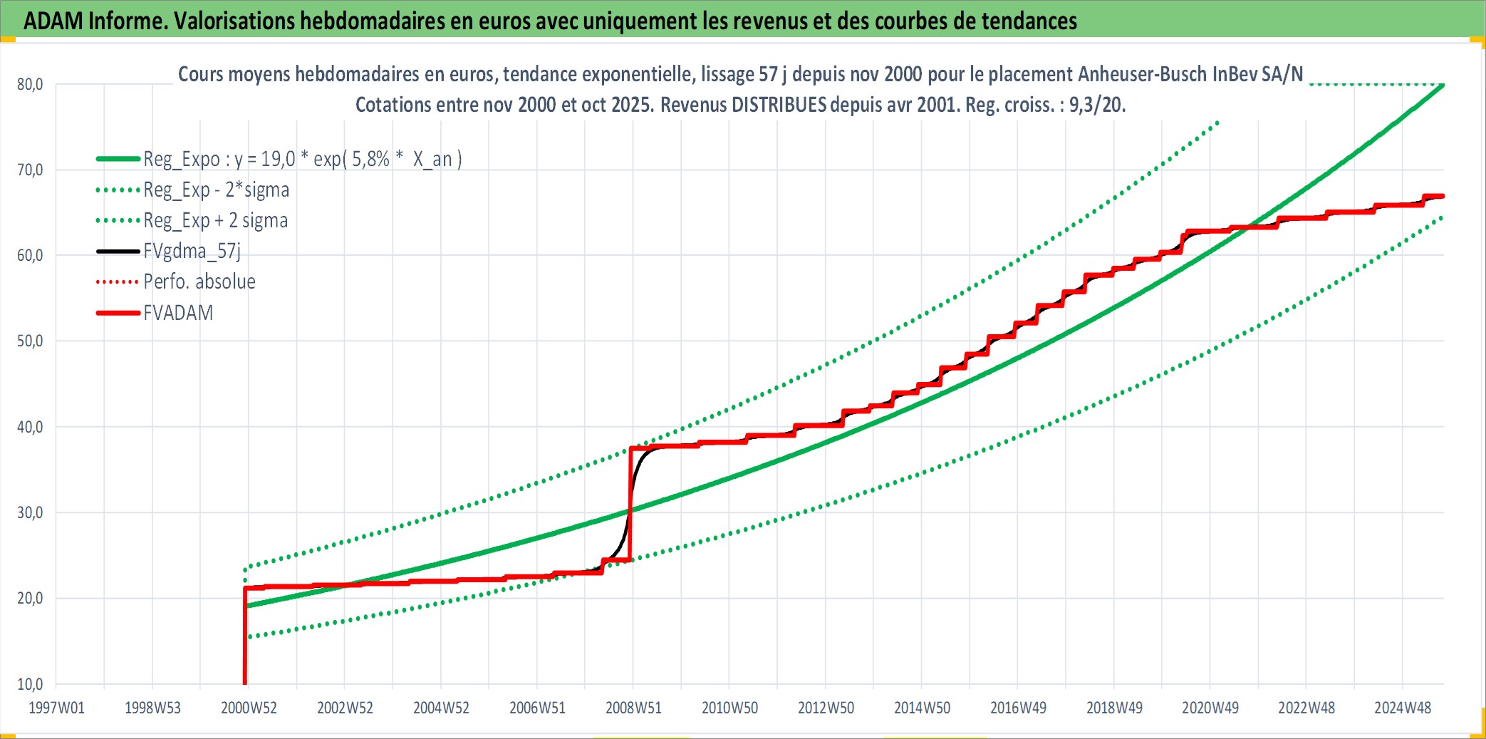 Site dédié aux investisseursPage dédiée sur site financeAnalyse des valorisations hebdomadaires de l'action Anheuser-Busch InBev SA/NV. Cet actif est cote en EUR. Les valorisations couvrent les semaines 2000W48 a 2025W40. Les revenus de cet actif financier sont pris en compte depuis la semaine 2001W17. La note globale ESG de cet actif est estimee a 10.0 (apres rebasage entre 0 et 20).