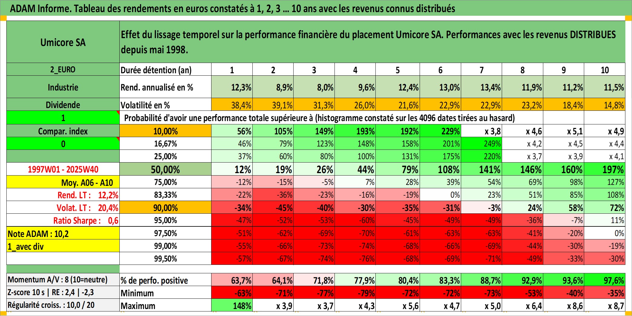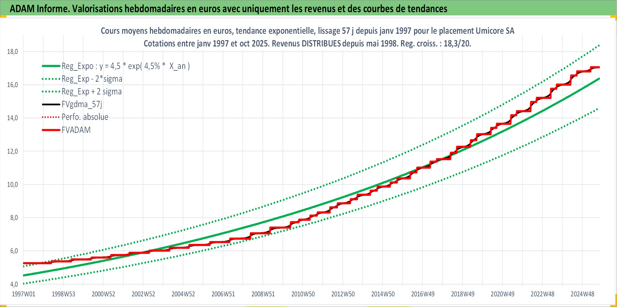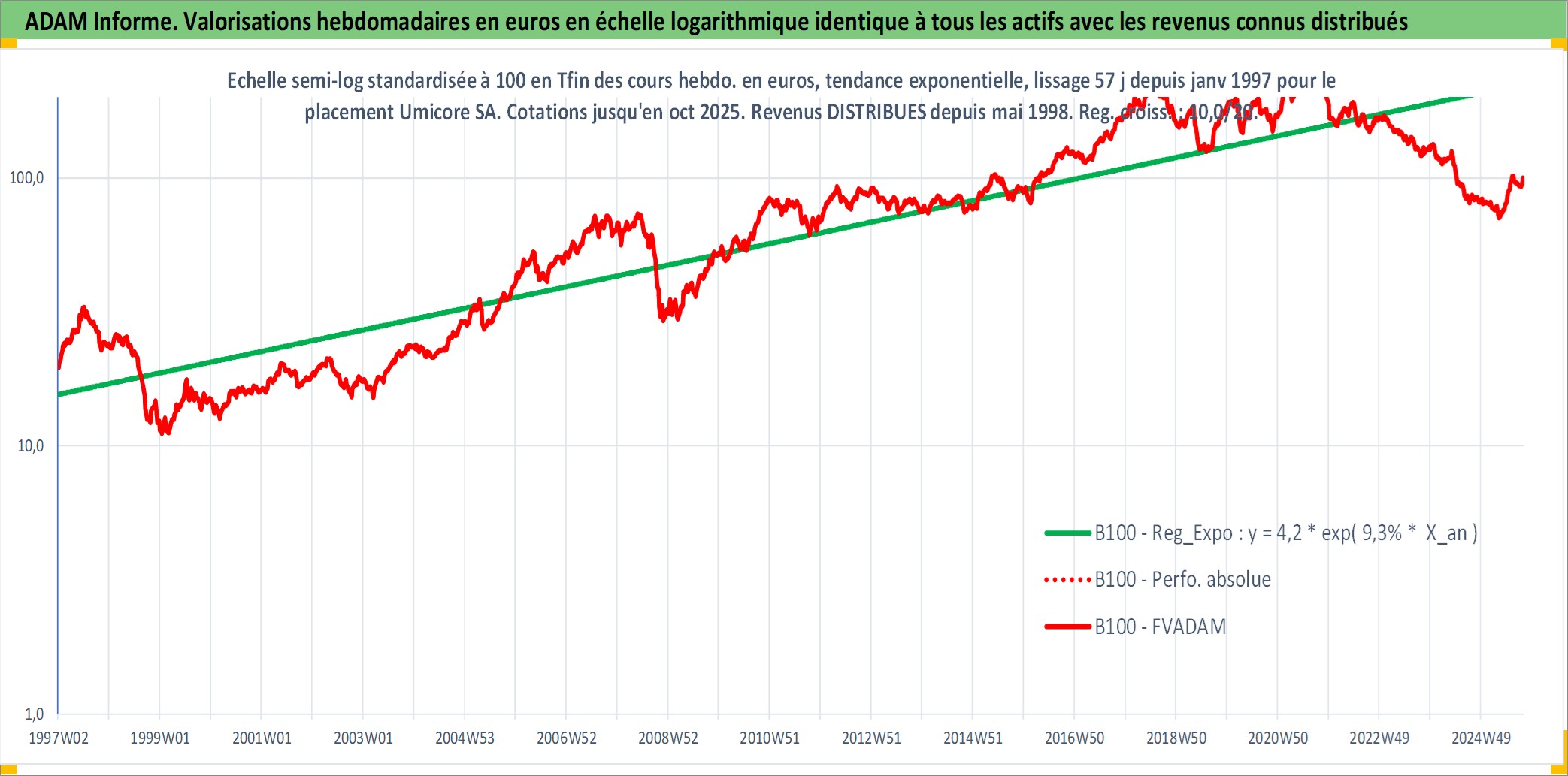 Site dédié aux investisseursPage dédiée sur site financeAnalyse des valorisations hebdomadaires de l'action Umicore SA. Cet actif est cote en EUR. Les valorisations couvrent les semaines 1997W01 a 2025W40. Les revenus de cet actif financier sont pris en compte depuis la semaine 1998W22. La note globale ESG de cet actif est estimee a 5.0 (apres rebasage entre 0 et 20).