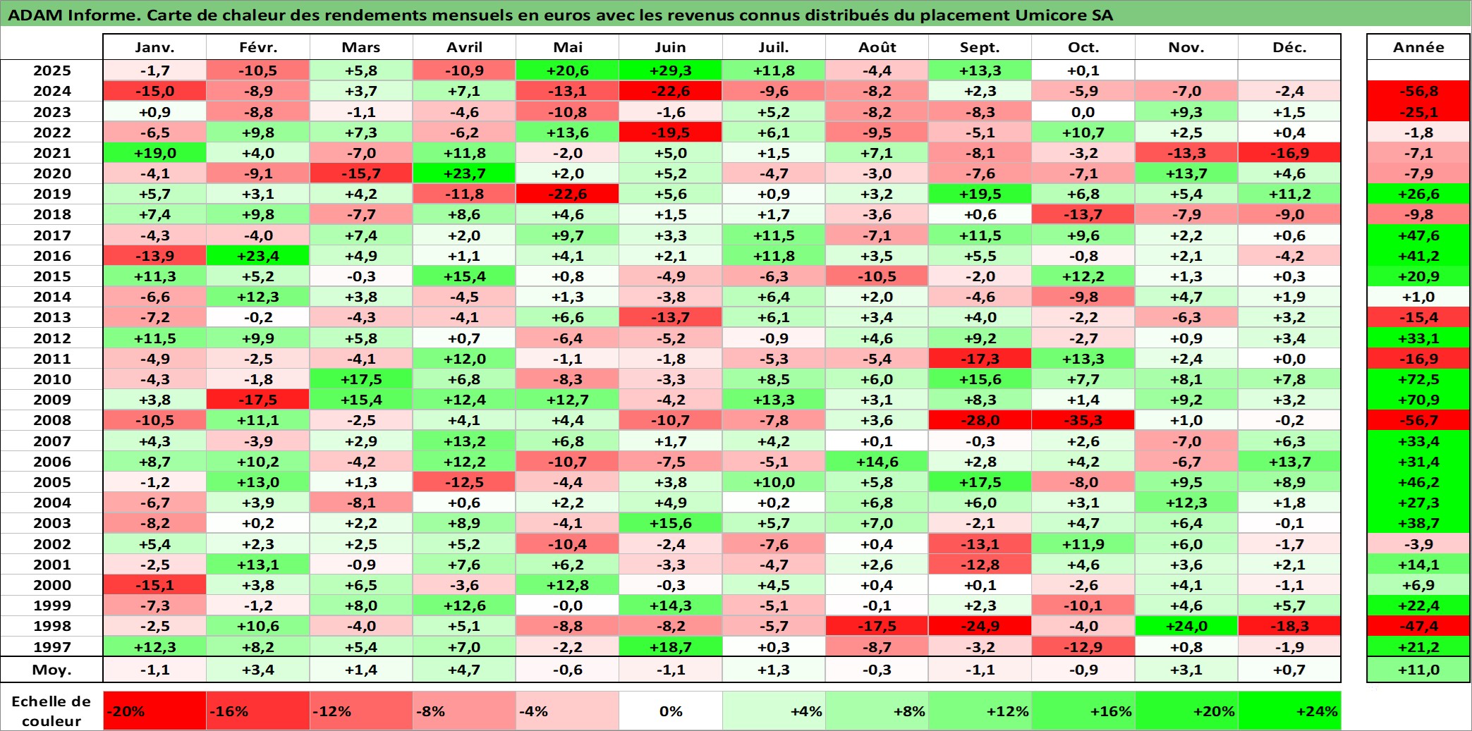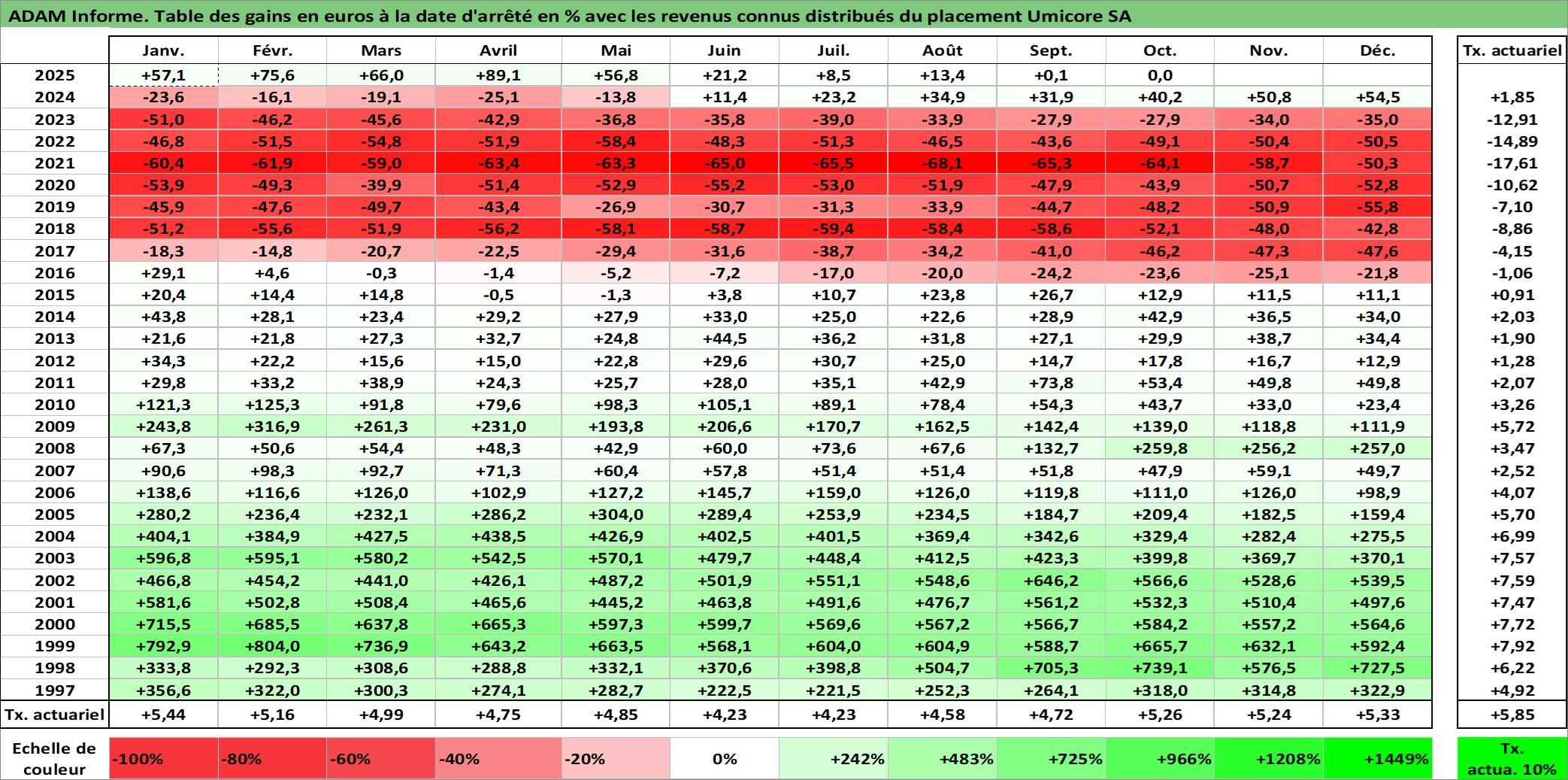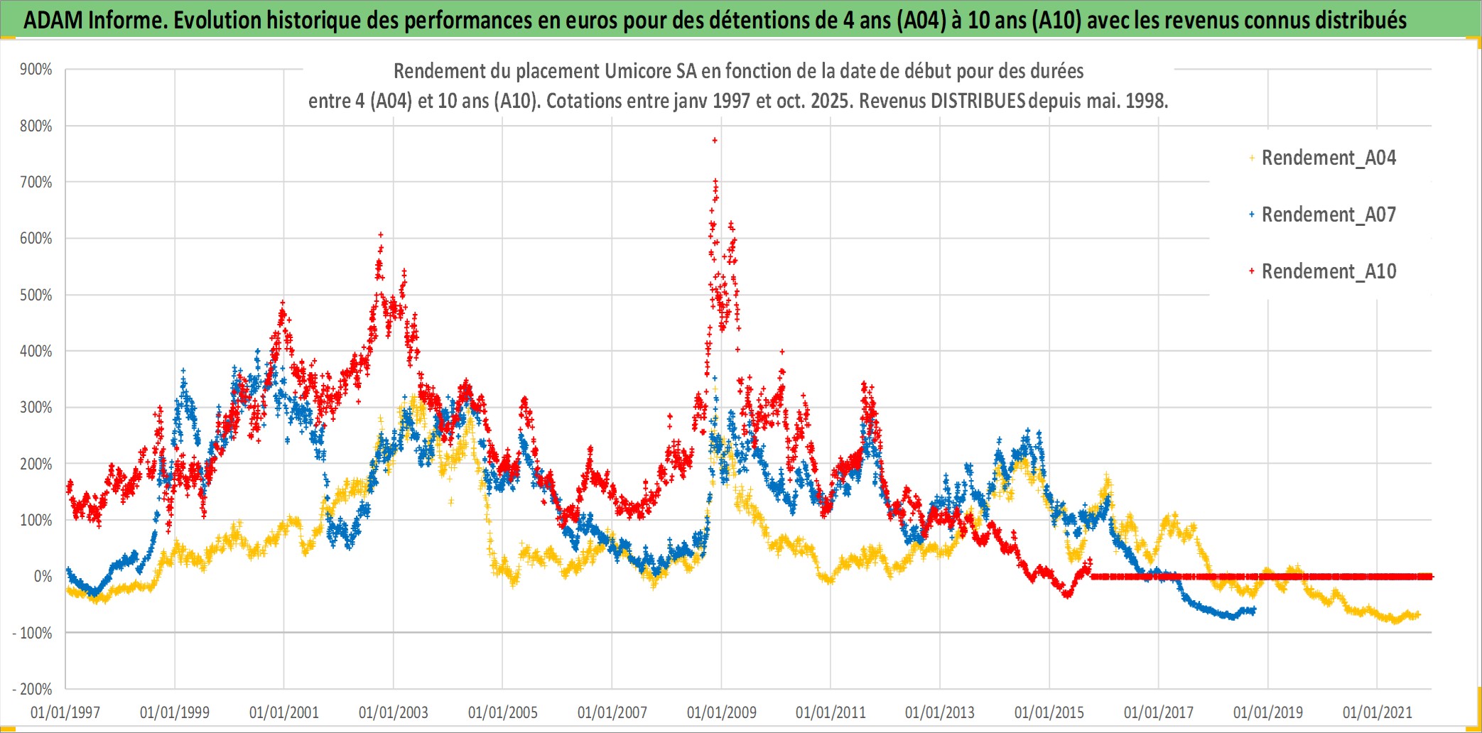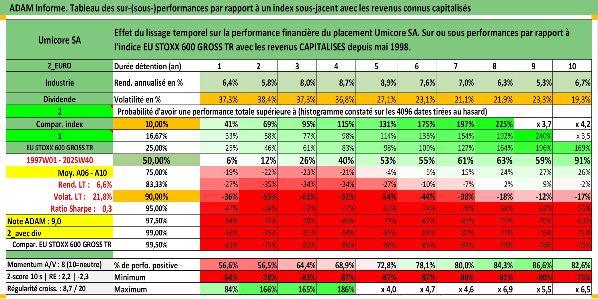 Site dédié aux investisseursPage dédiée sur site financeAnalyse des valorisations hebdomadaires de l'action Umicore SA. Cet actif est cote en EUR. Les valorisations couvrent les semaines 1997W01 a 2025W40. Les revenus de cet actif financier sont pris en compte depuis la semaine 1998W22. La note globale ESG de cet actif est estimee a 5.0 (apres rebasage entre 0 et 20).