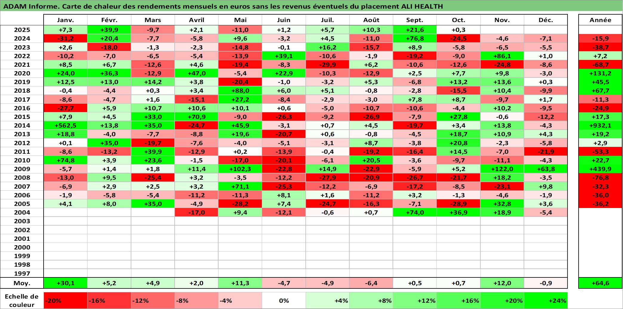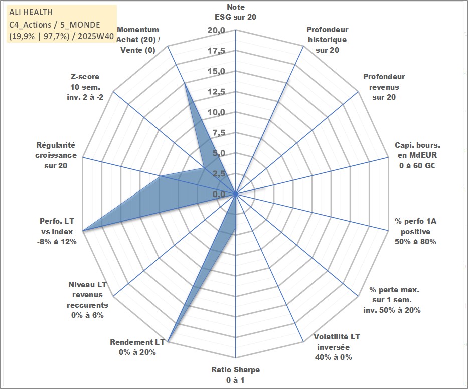 Site dédié aux investisseursPage dédiée sur site financeAnalyse des valorisations hebdomadaires de l'action ALI HEALTH. Cet actif est cote en HKD. Les valorisations sont en contrevaleur EURO et couvrent les semaines 2004W13 a 2025W40. Les revenus de cet actif financier ne sont pas connus car non existants ou non disponibles sur le site Yahoo Finance. La note ESG de cet actif n'est pas connue.