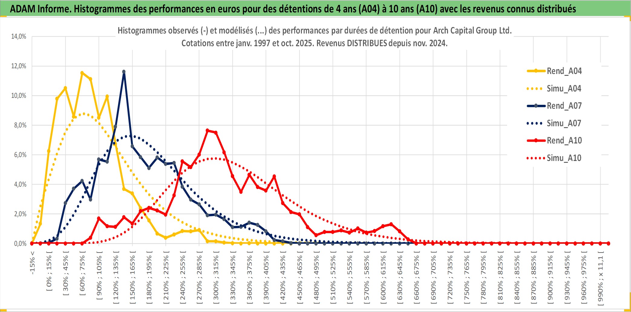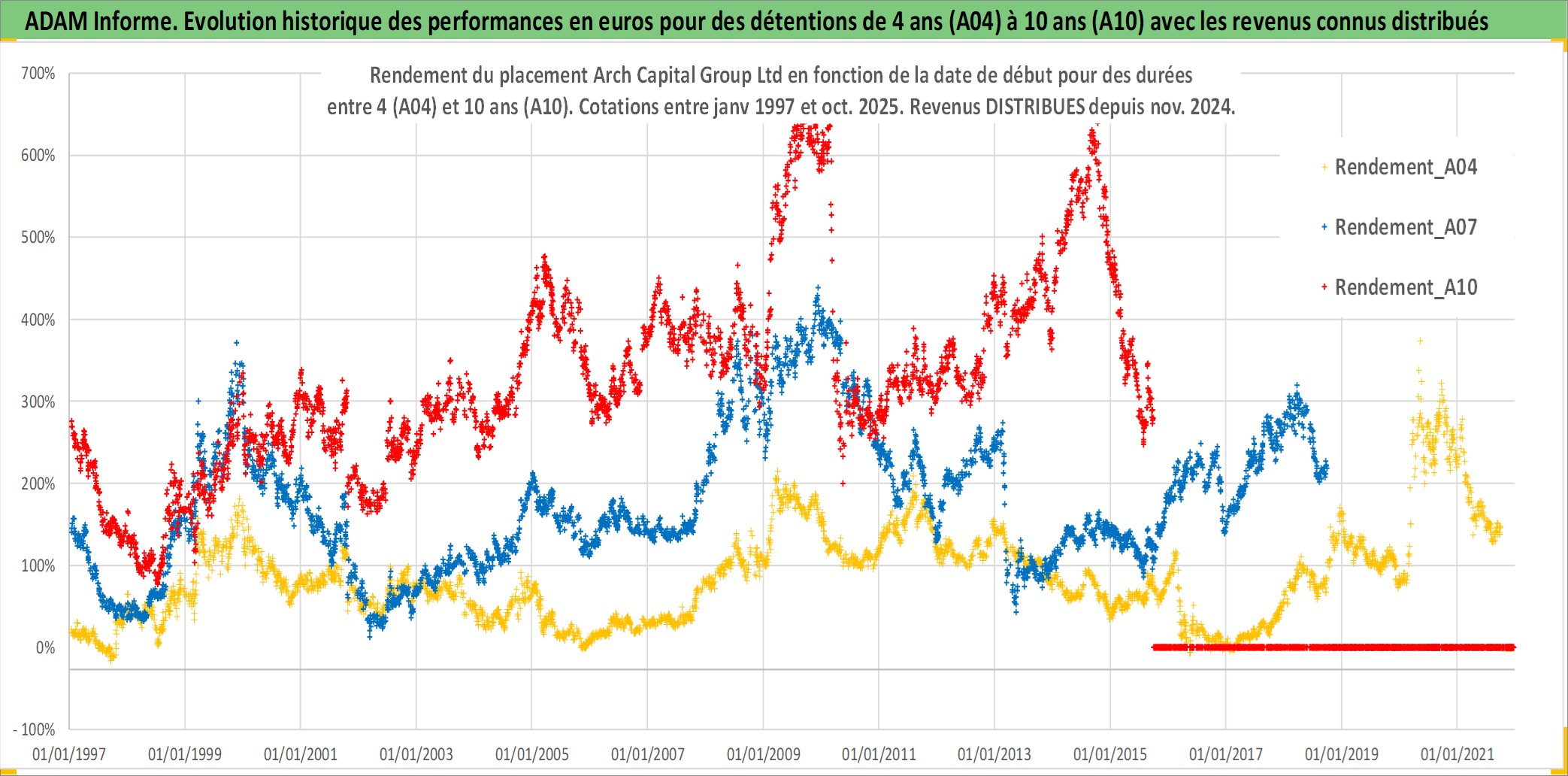 Site dédié aux investisseursPage dédiée sur site financeAnalyse des valorisations hebdomadaires de l'action Arch Capital Group Ltd. Cet actif est cote en USD. Les valorisations sont en contrevaleur EURO et couvrent les semaines 1997W01 a 2025W40. Les revenus de cet actif financier sont pris en compte depuis la semaine 2024W47. La note globale ESG de cet actif est estimee a 10.0 (apres rebasage entre 0 et 20).