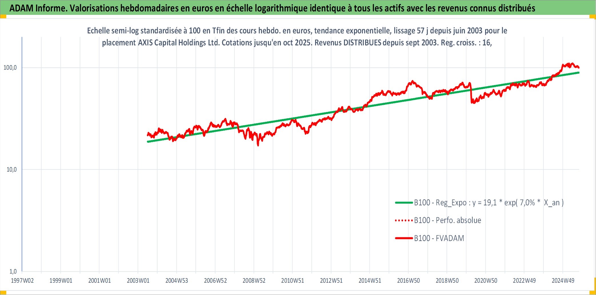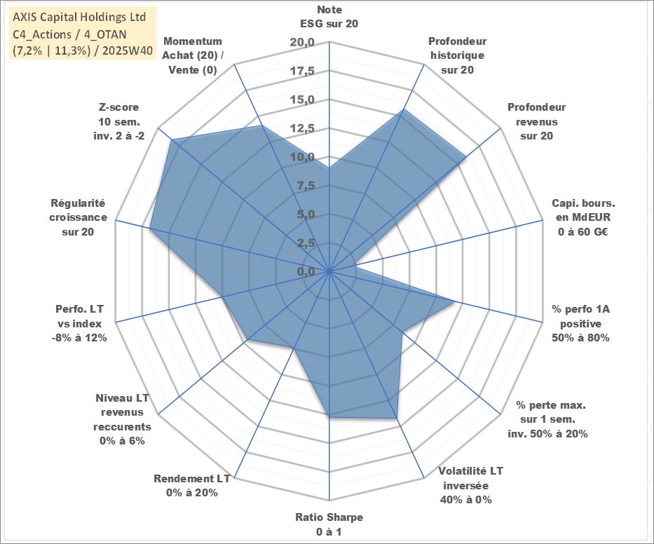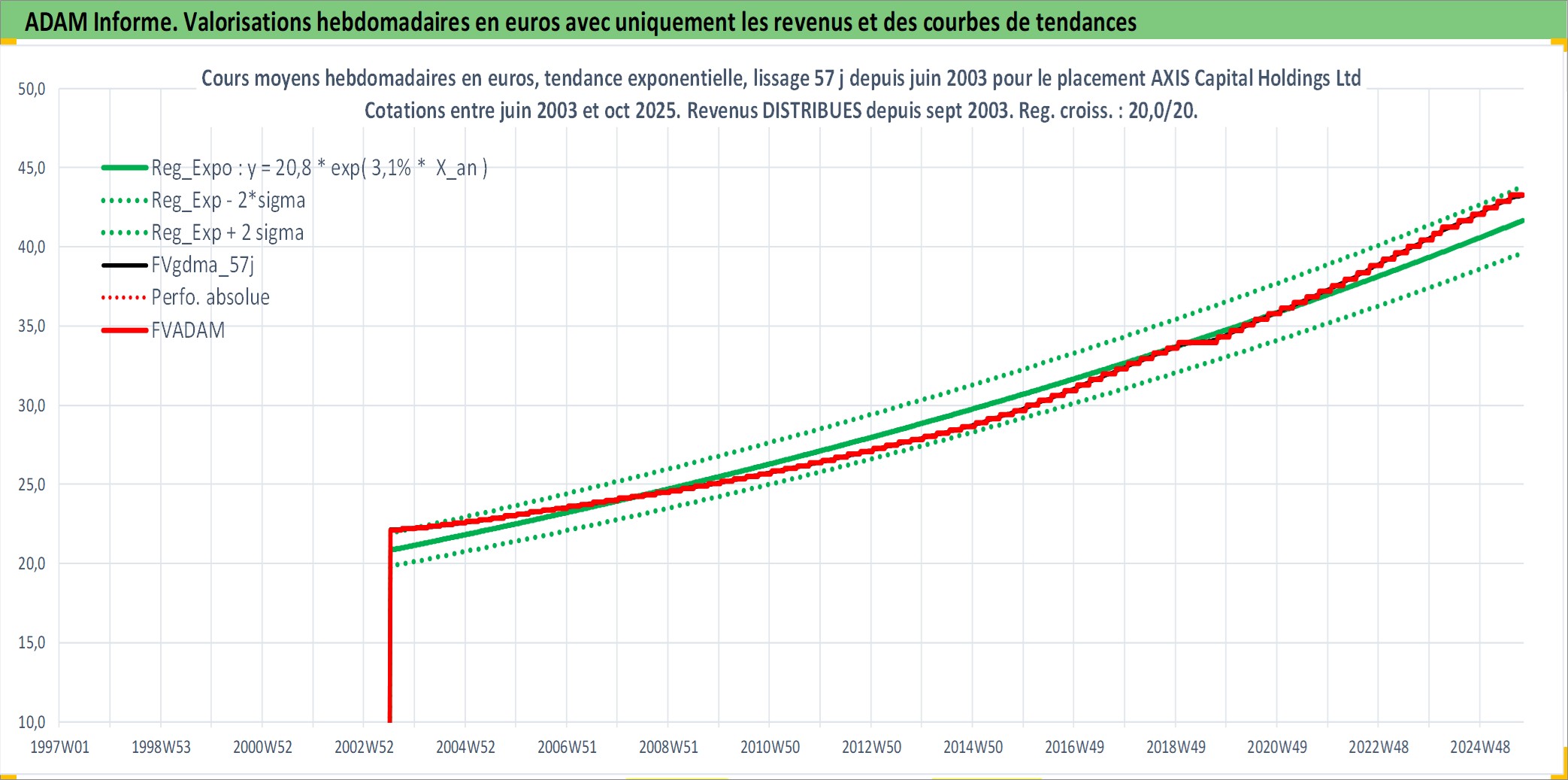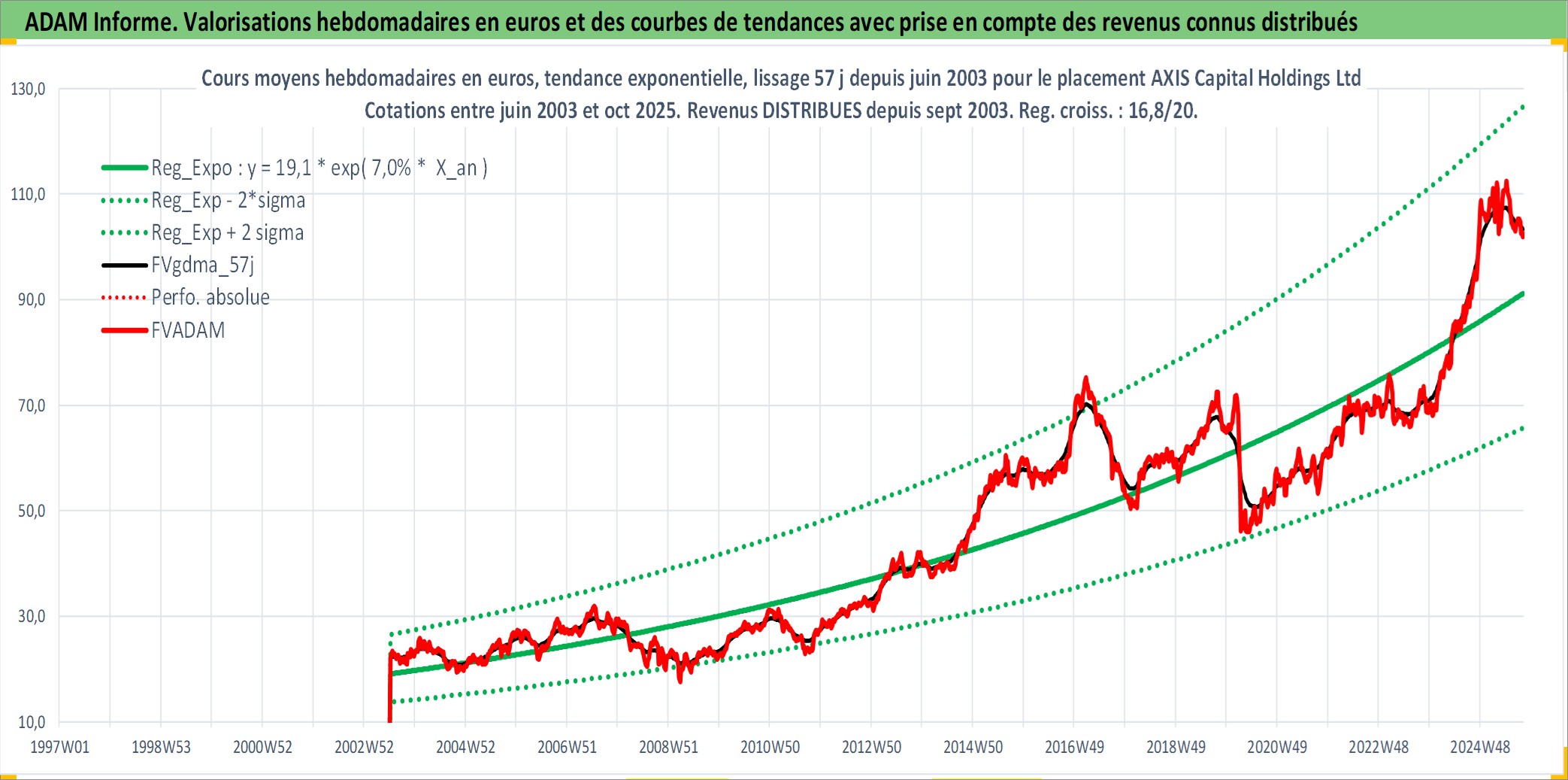 Site dédié aux investisseursPage dédiée sur site financeAnalyse des valorisations hebdomadaires de l'action AXIS Capital Holdings Ltd. Cet actif est cote en USD. Les valorisations sont en contrevaleur EURO et couvrent les semaines 2003W27 a 2025W40. Les revenus de cet actif financier sont pris en compte depuis la semaine 2003W39. La note globale ESG de cet actif est estimee a 9.0 (apres rebasage entre 0 et 20).