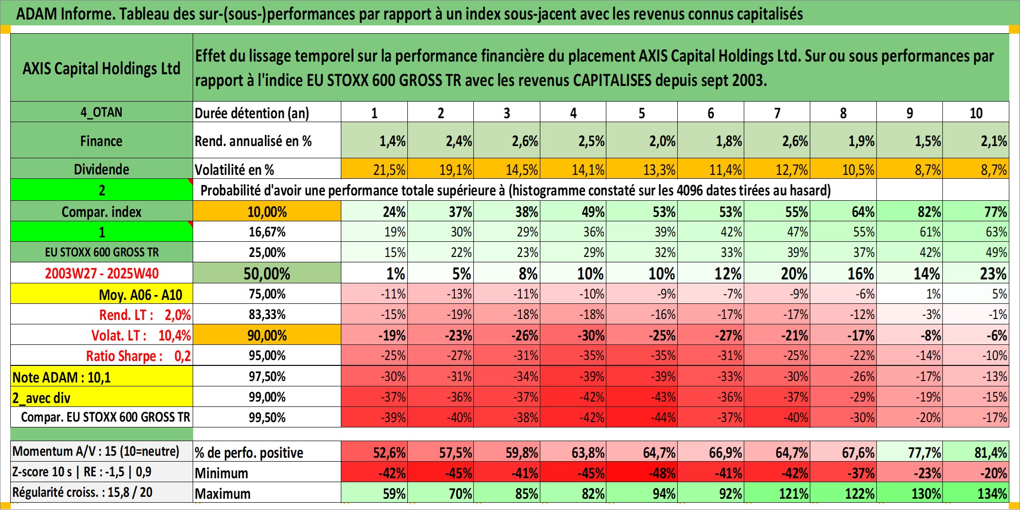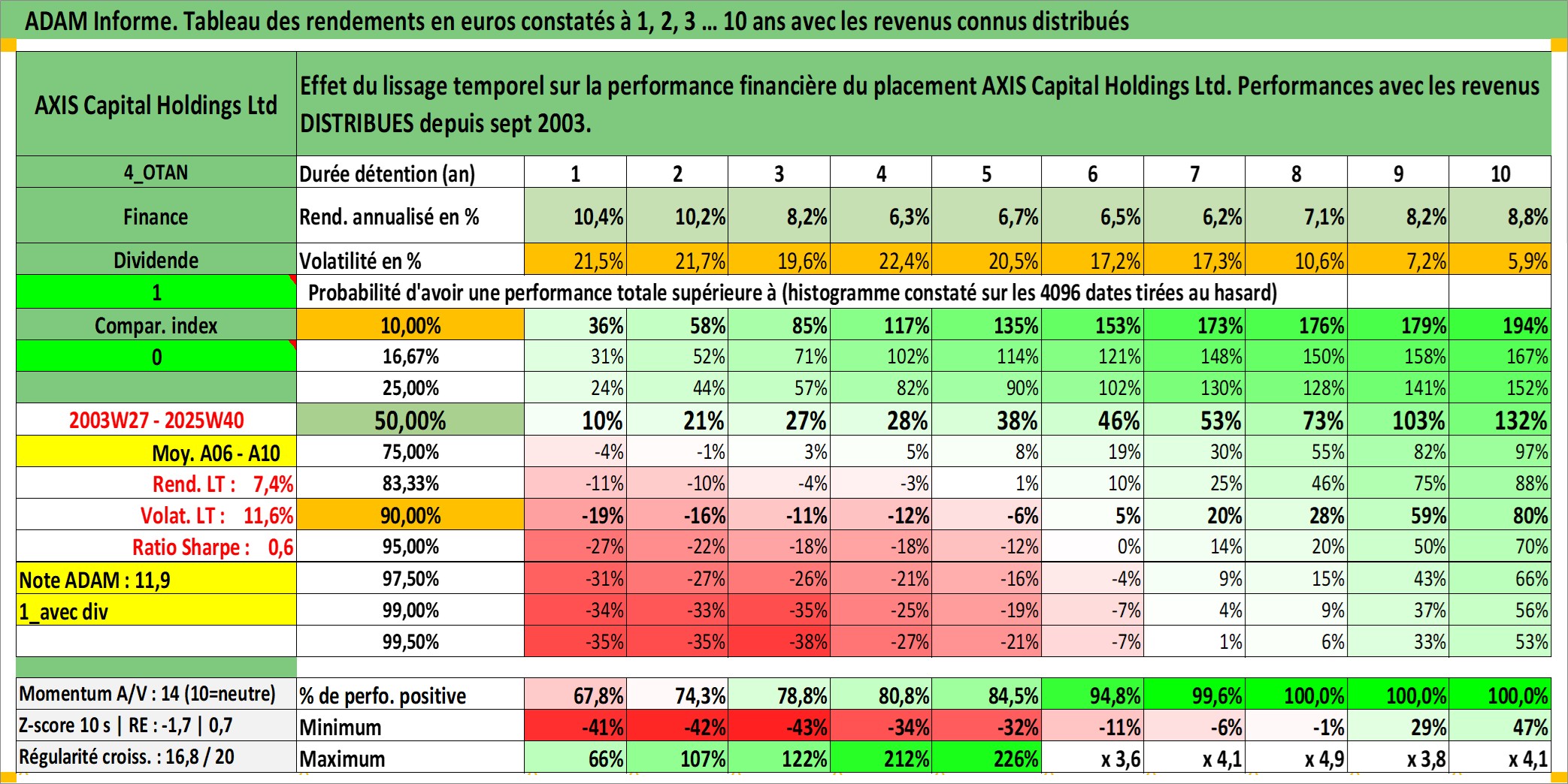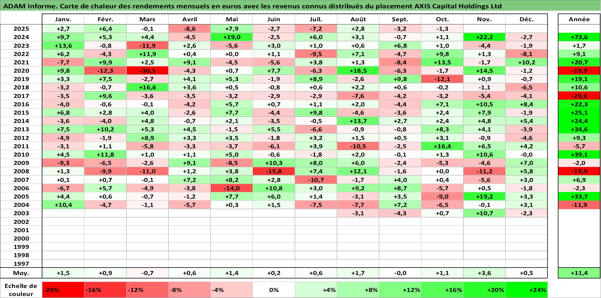 Site dédié aux investisseursPage dédiée sur site financeAnalyse des valorisations hebdomadaires de l'action AXIS Capital Holdings Ltd. Cet actif est cote en USD. Les valorisations sont en contrevaleur EURO et couvrent les semaines 2003W27 a 2025W40. Les revenus de cet actif financier sont pris en compte depuis la semaine 2003W39. La note globale ESG de cet actif est estimee a 9.0 (apres rebasage entre 0 et 20).