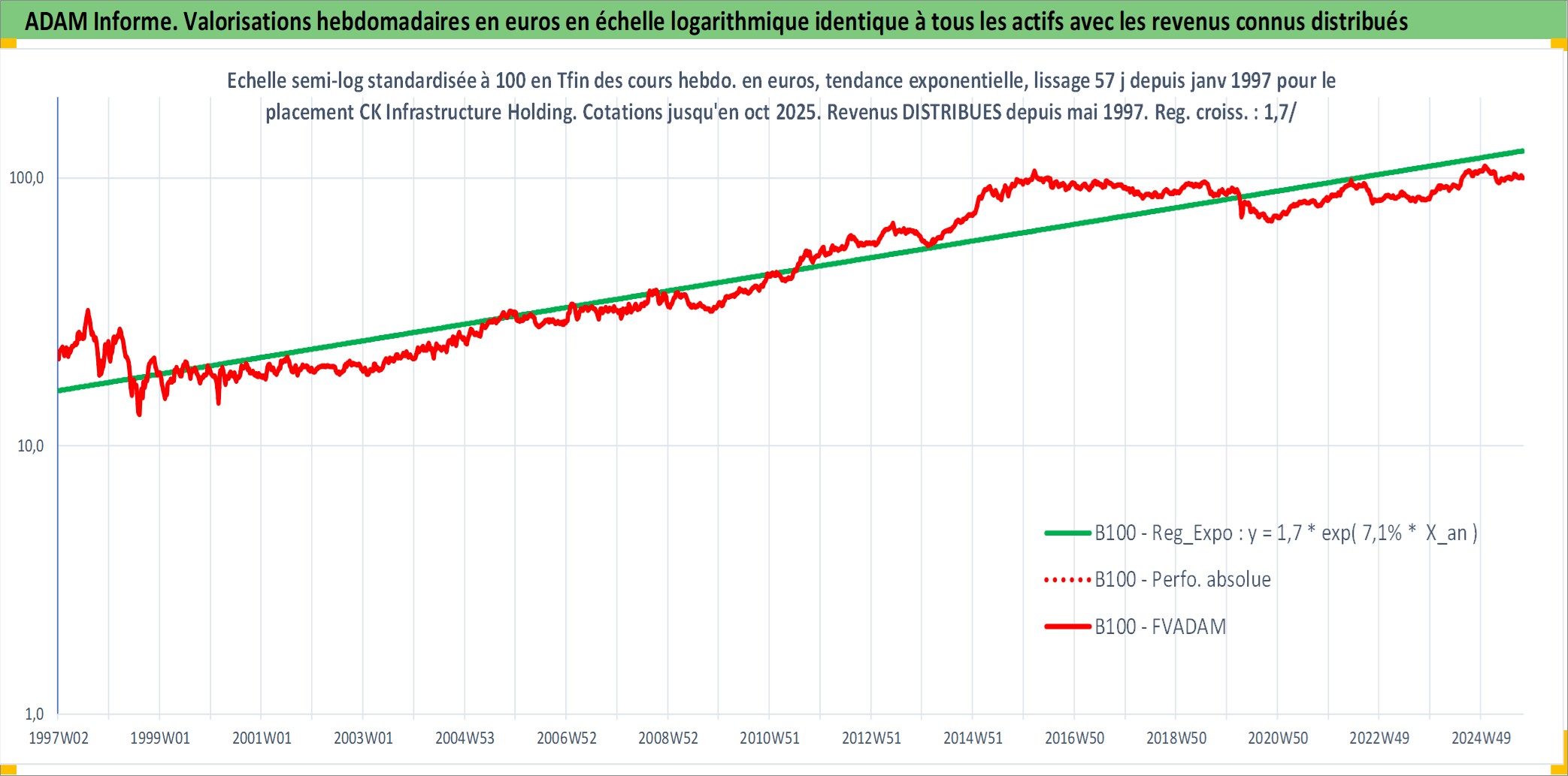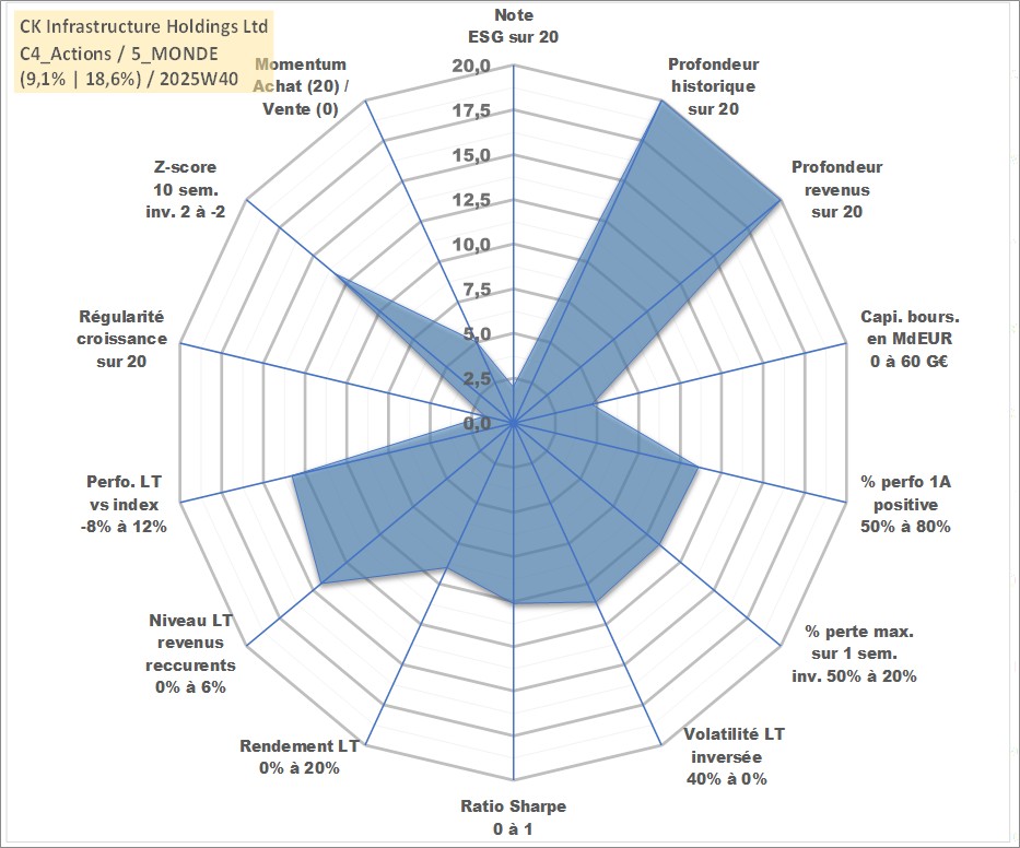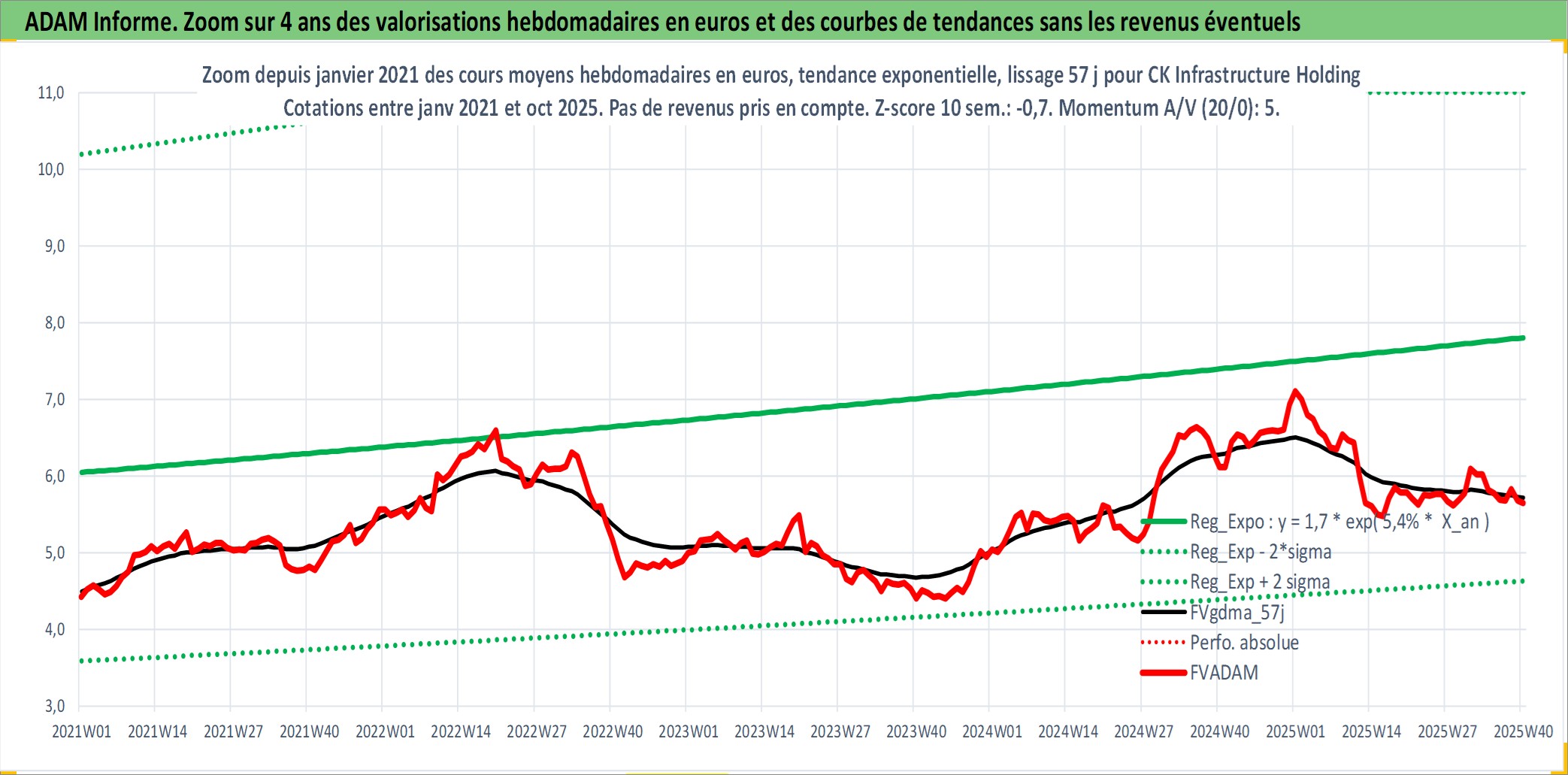 Site dédié aux investisseursPage dédiée sur site financeAnalyse des valorisations hebdomadaires de l'action CK Infrastructure Holdings Ltd. Cet actif est cote en HKD. Les valorisations sont en contrevaleur EURO et couvrent les semaines 1997W01 a 2025W40. Les revenus de cet actif financier sont pris en compte depuis la semaine 1997W19. La note globale ESG de cet actif est estimee a 2.0 (apres rebasage entre 0 et 20).