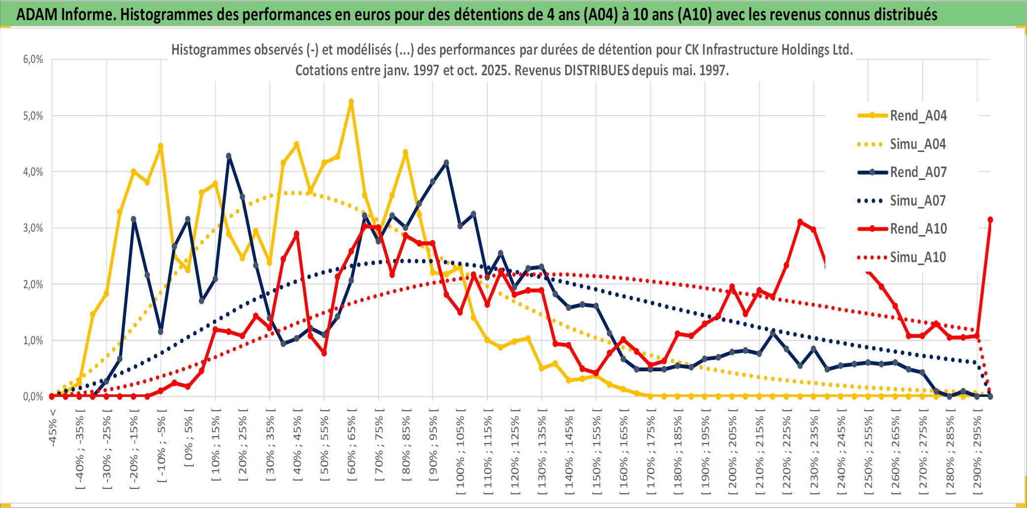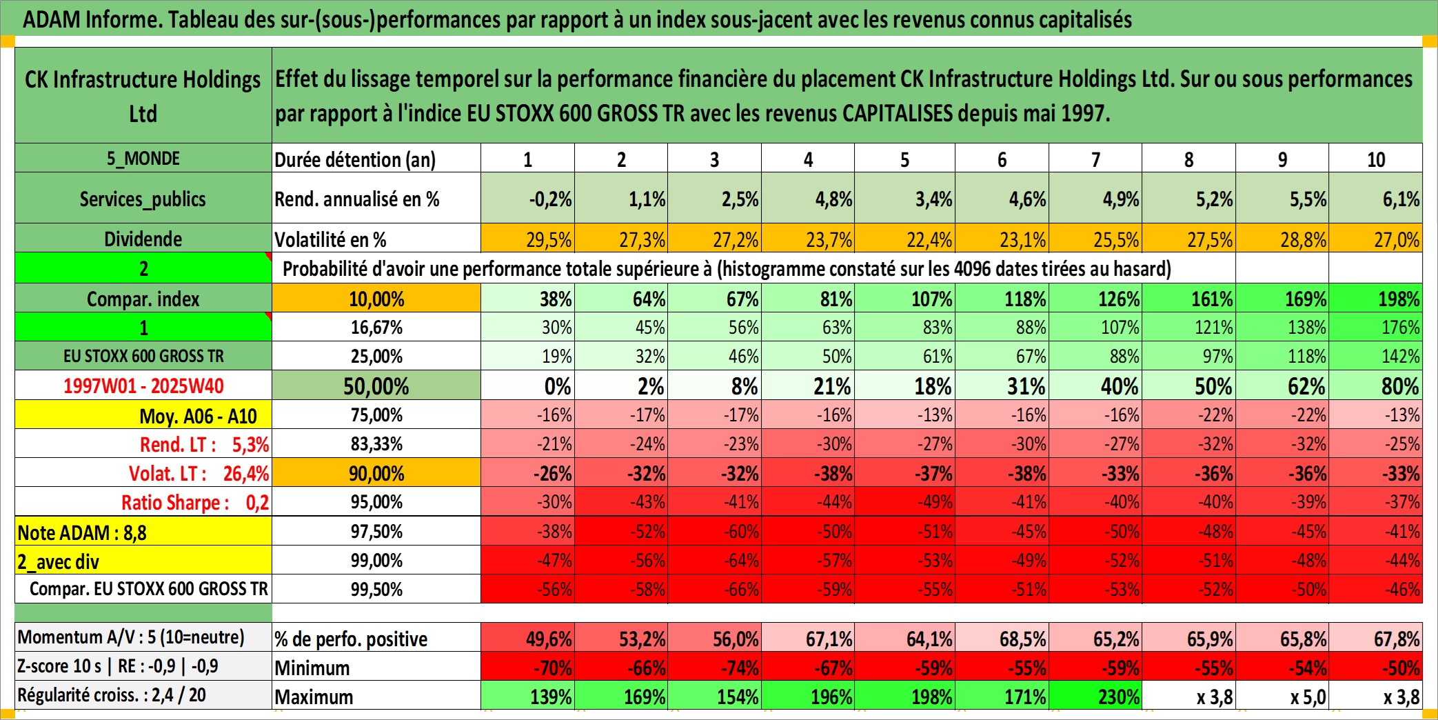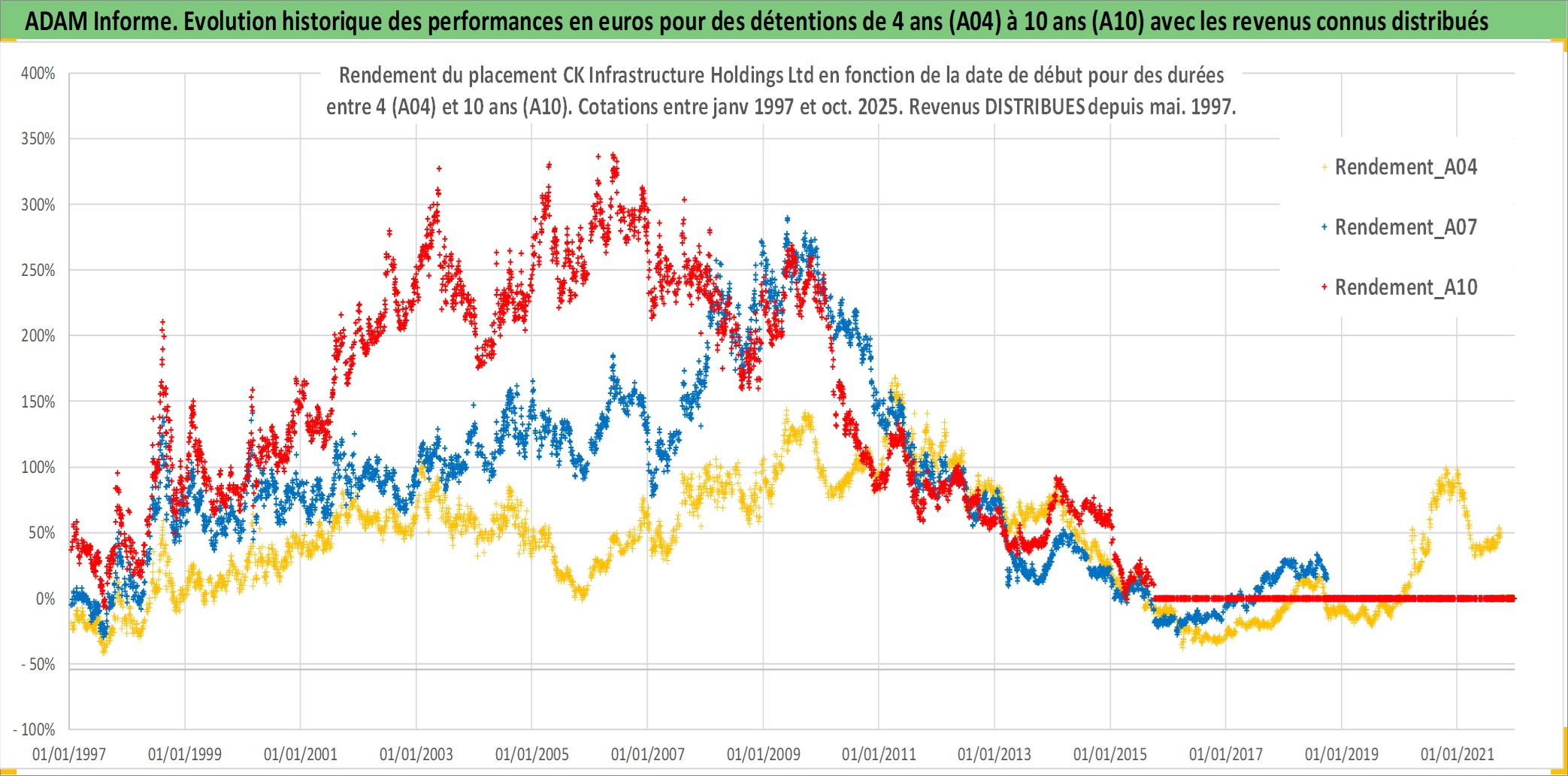 Site dédié aux investisseursPage dédiée sur site financeAnalyse des valorisations hebdomadaires de l'action CK Infrastructure Holdings Ltd. Cet actif est cote en HKD. Les valorisations sont en contrevaleur EURO et couvrent les semaines 1997W01 a 2025W40. Les revenus de cet actif financier sont pris en compte depuis la semaine 1997W19. La note globale ESG de cet actif est estimee a 2.0 (apres rebasage entre 0 et 20).