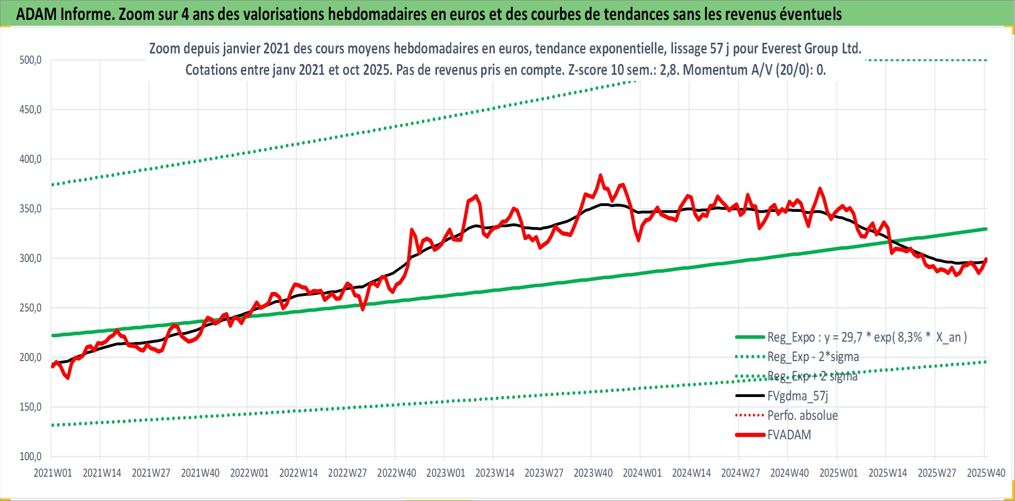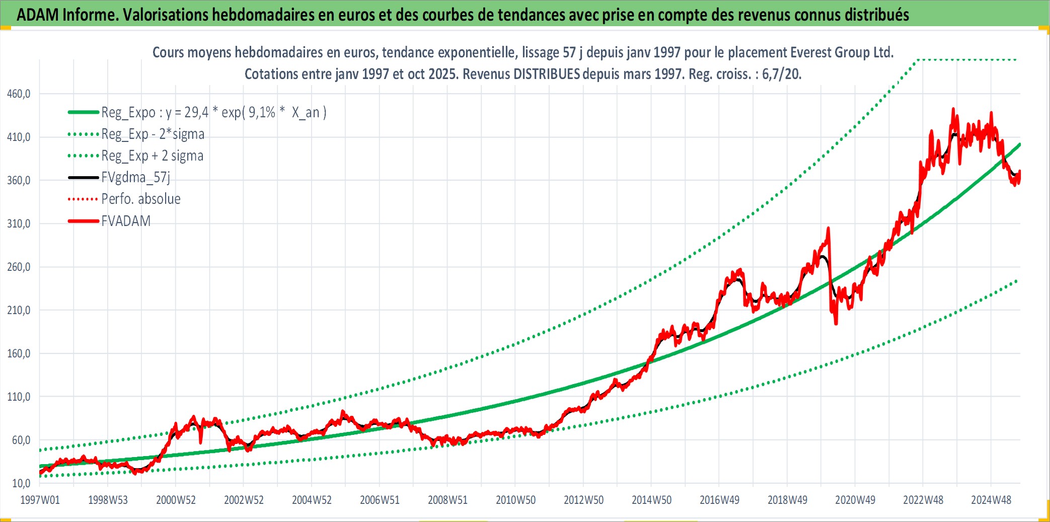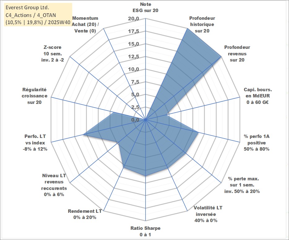 Site dédié aux investisseursPage dédiée sur site financeAnalyse des valorisations hebdomadaires de l'action Everest Group Ltd.. Cet actif est cote en USD. Les valorisations sont en contrevaleur EURO et couvrent les semaines 1997W01 a 2025W40. Les revenus de cet actif financier sont pris en compte depuis la semaine 1997W10. La note ESG de cet actif n'est pas connue.