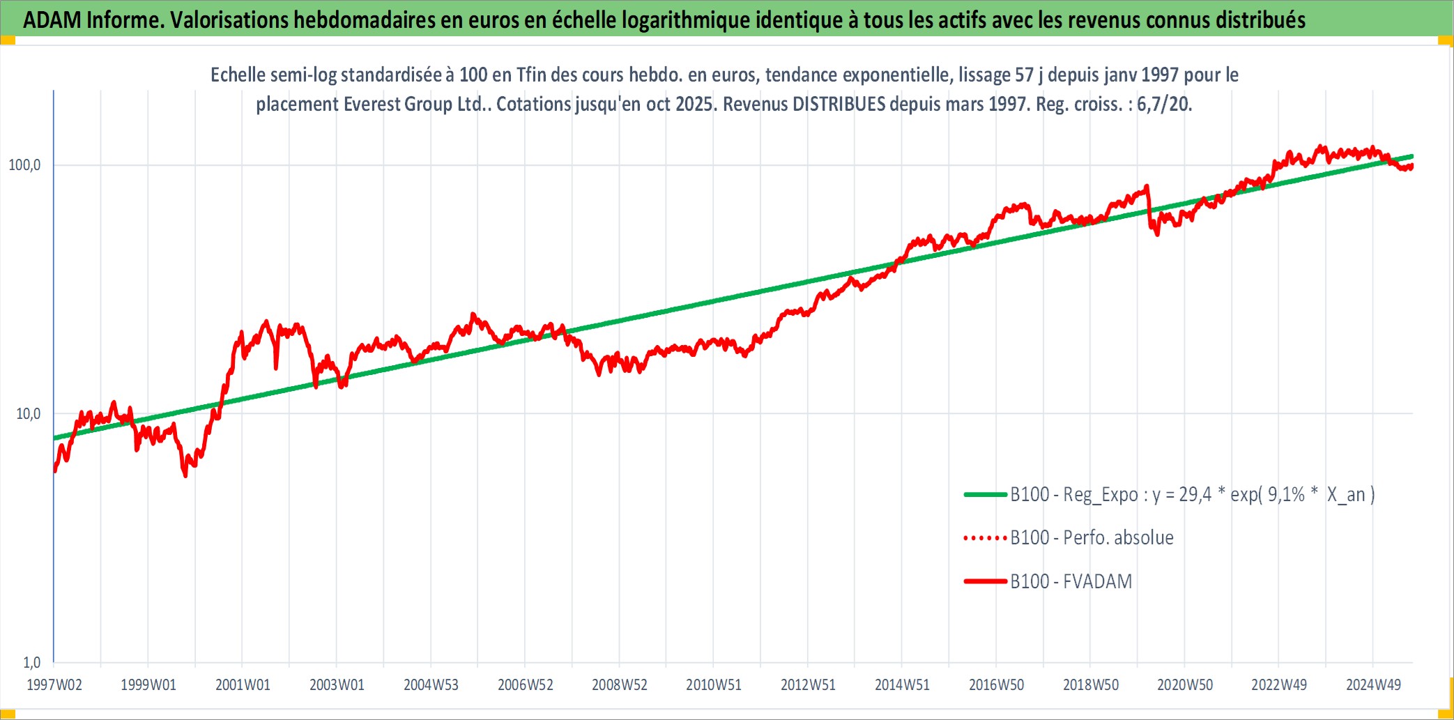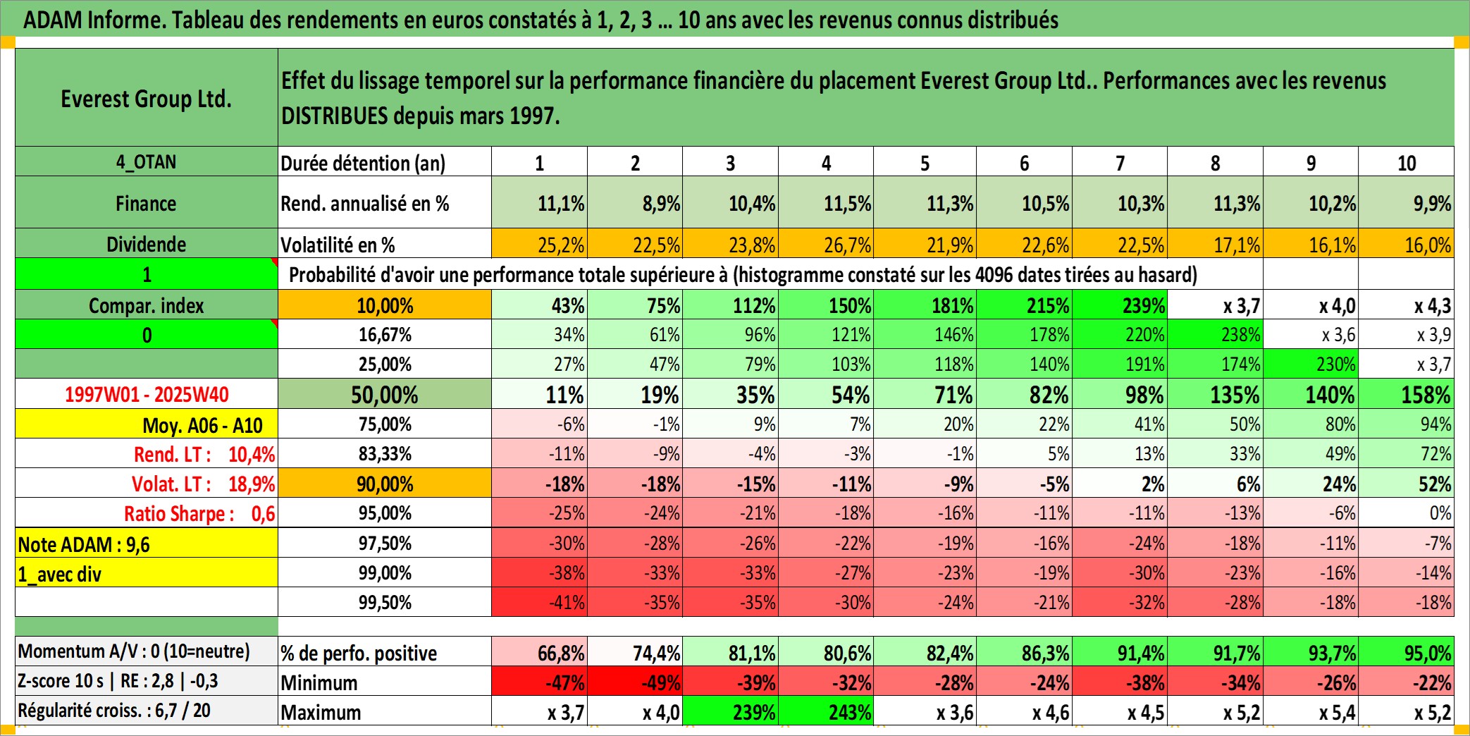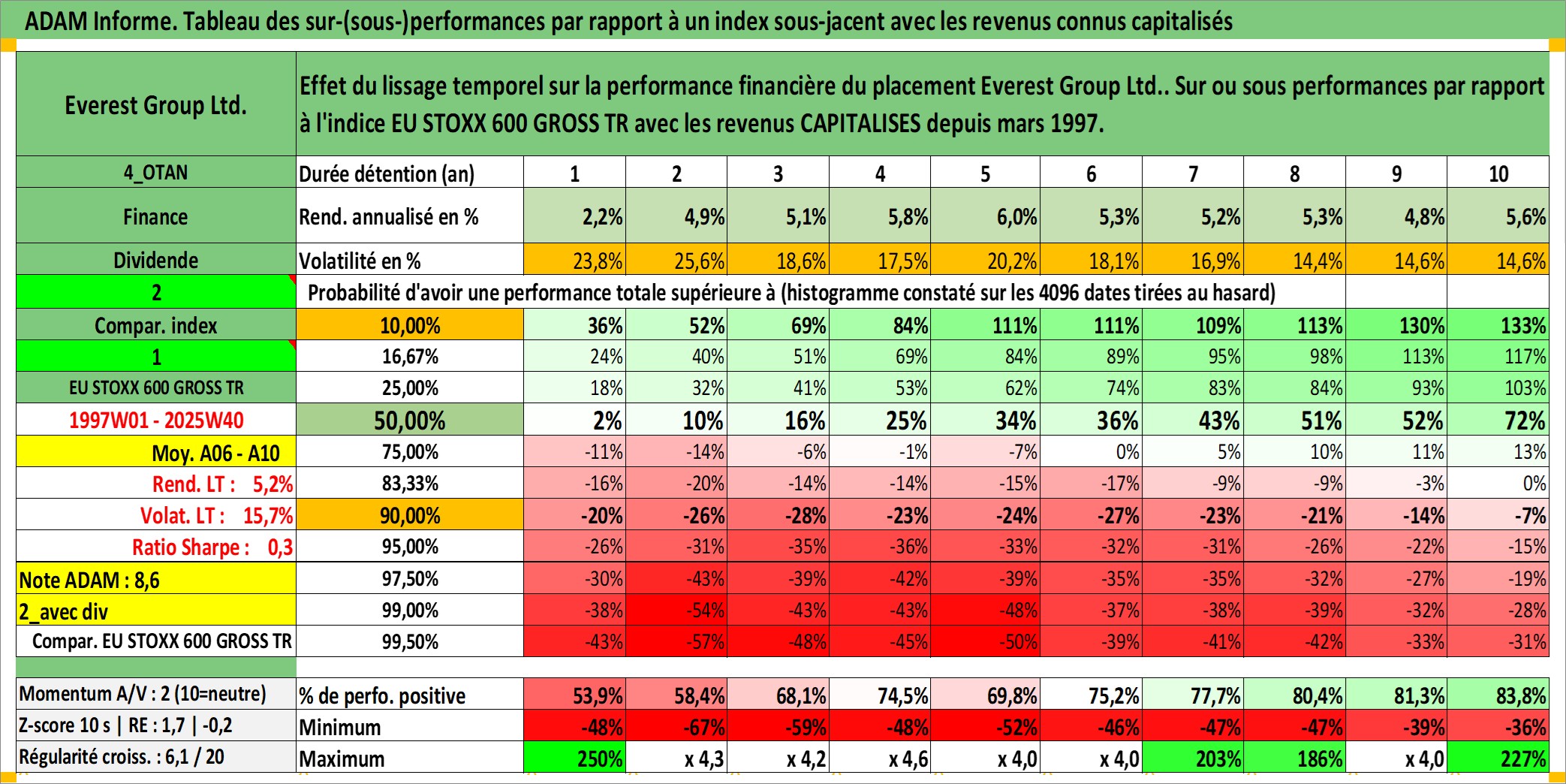 Site dédié aux investisseursPage dédiée sur site financeAnalyse des valorisations hebdomadaires de l'action Everest Group Ltd.. Cet actif est cote en USD. Les valorisations sont en contrevaleur EURO et couvrent les semaines 1997W01 a 2025W40. Les revenus de cet actif financier sont pris en compte depuis la semaine 1997W10. La note ESG de cet actif n'est pas connue.