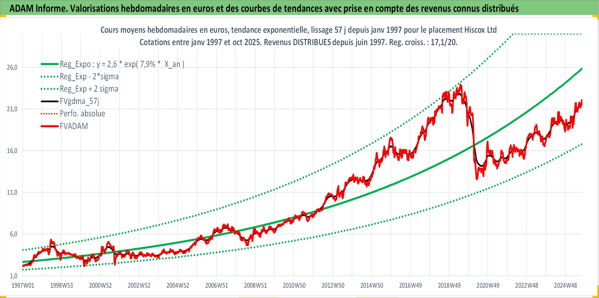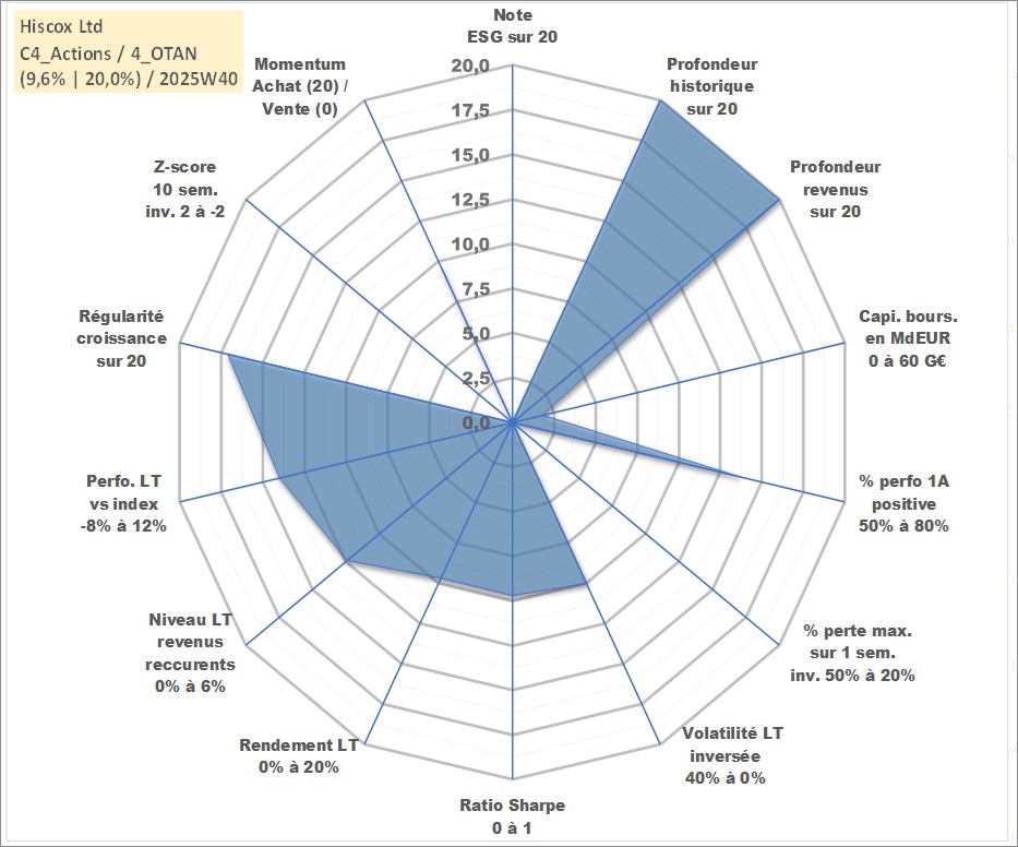 Site dédié aux investisseursPage dédiée sur site financeAnalyse des valorisations hebdomadaires de l'action Hiscox Ltd. Cet actif est cote en GBX. Les valorisations sont en contrevaleur EURO et couvrent les semaines 1997W01 a 2025W40. Les revenus de cet actif financier sont pris en compte depuis la semaine 1997W24. La note ESG de cet actif n'est pas connue.