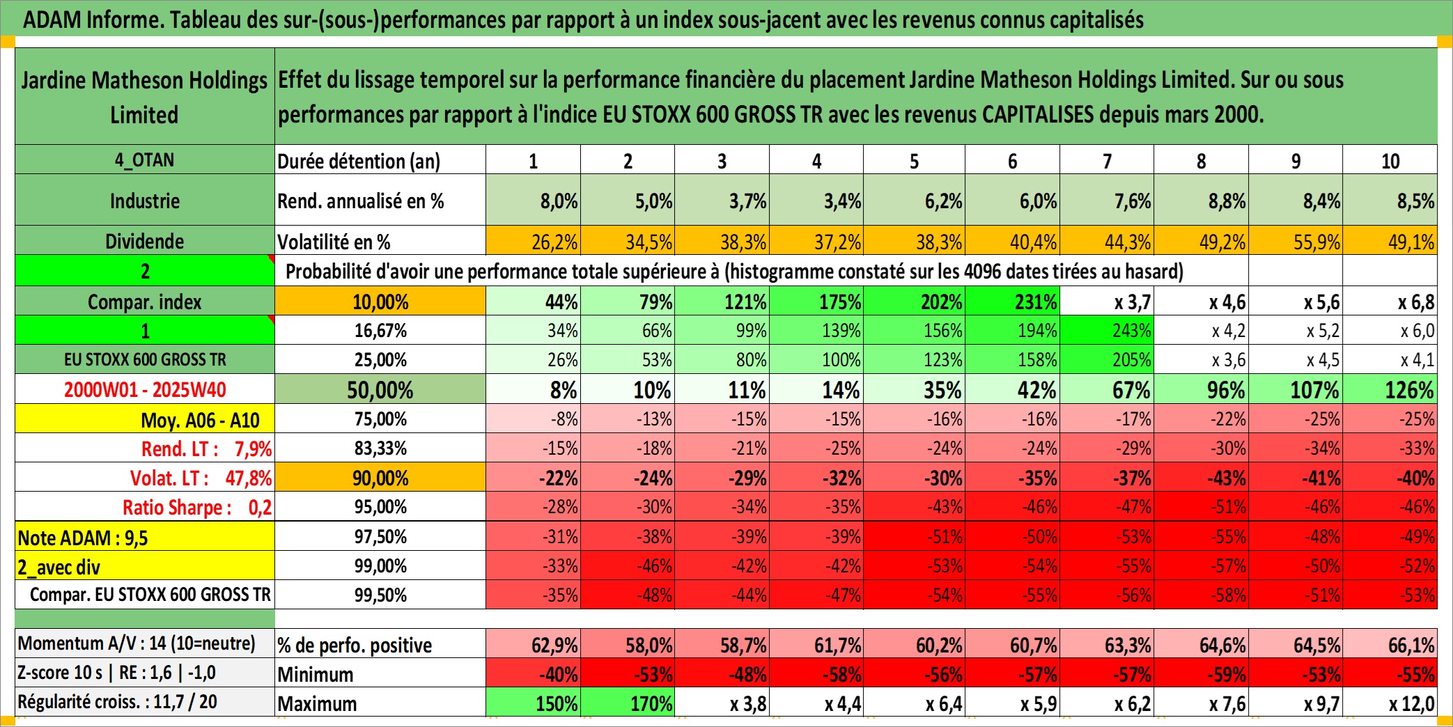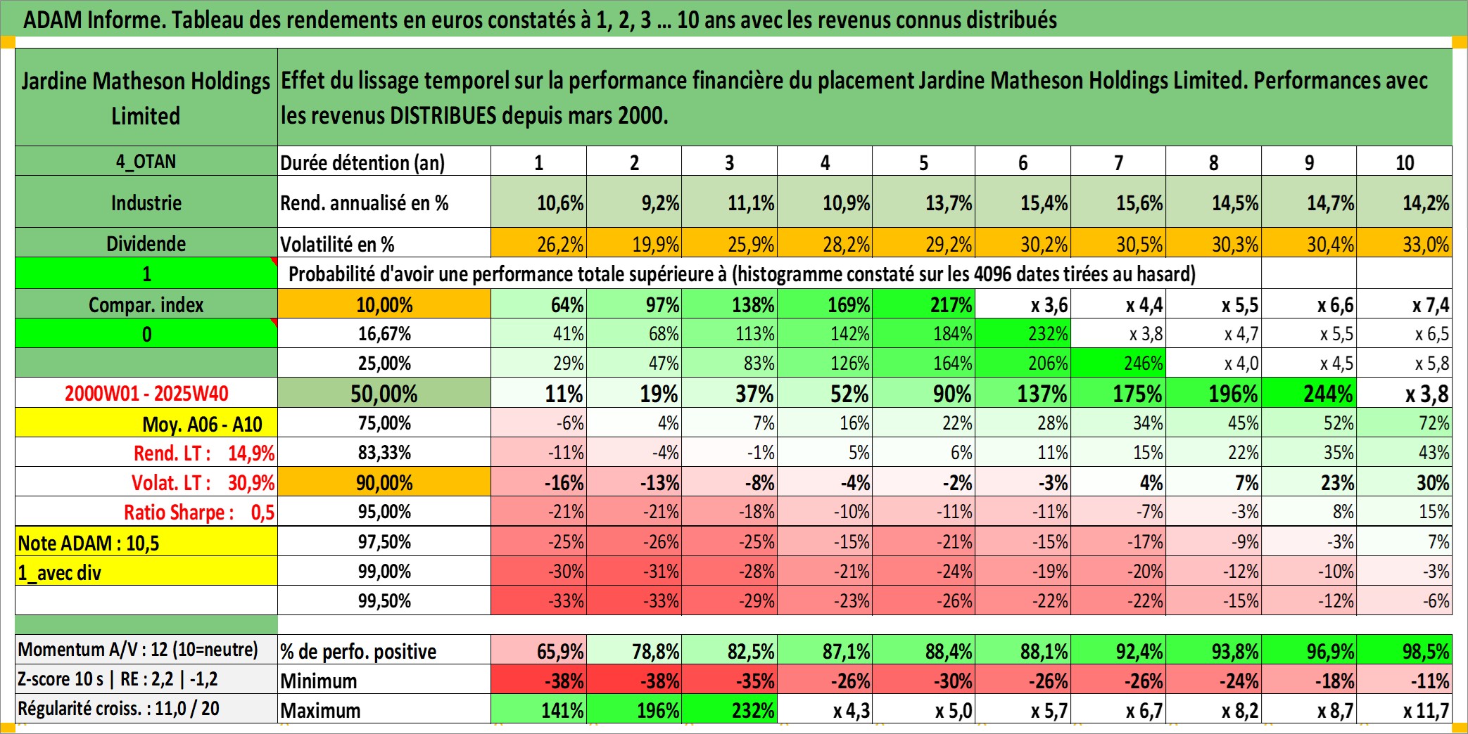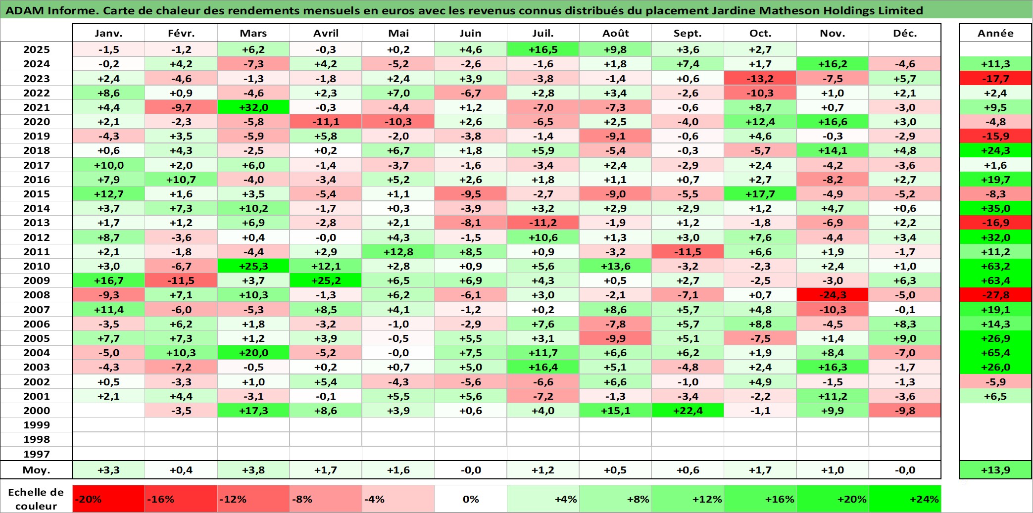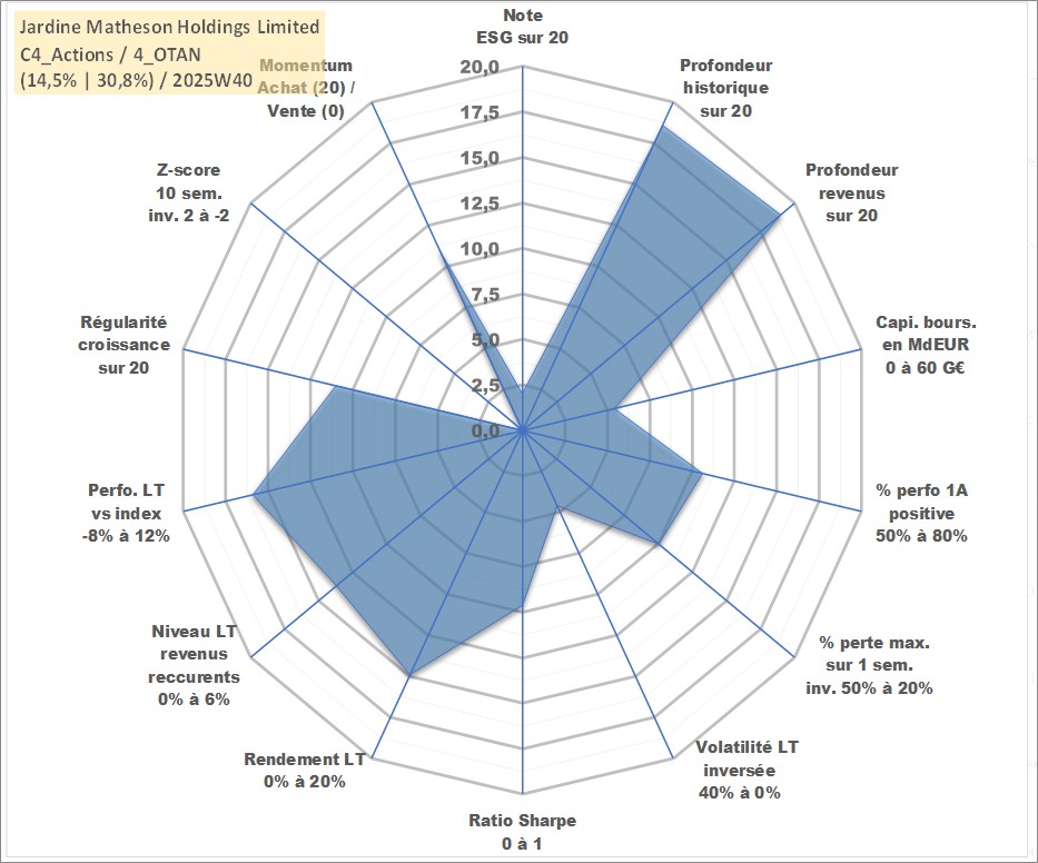 Site dédié aux investisseursPage dédiée sur site financeAnalyse des valorisations hebdomadaires de l'action Jardine Matheson Holdings Limited. Cet actif est cote en USD. Les valorisations sont en contrevaleur EURO et couvrent les semaines 2000W01 a 2025W40. Les revenus de cet actif financier sont pris en compte depuis la semaine 2000W12. La note globale ESG de cet actif est estimee a 2.0 (apres rebasage entre 0 et 20).