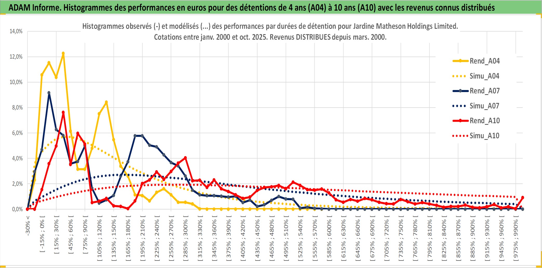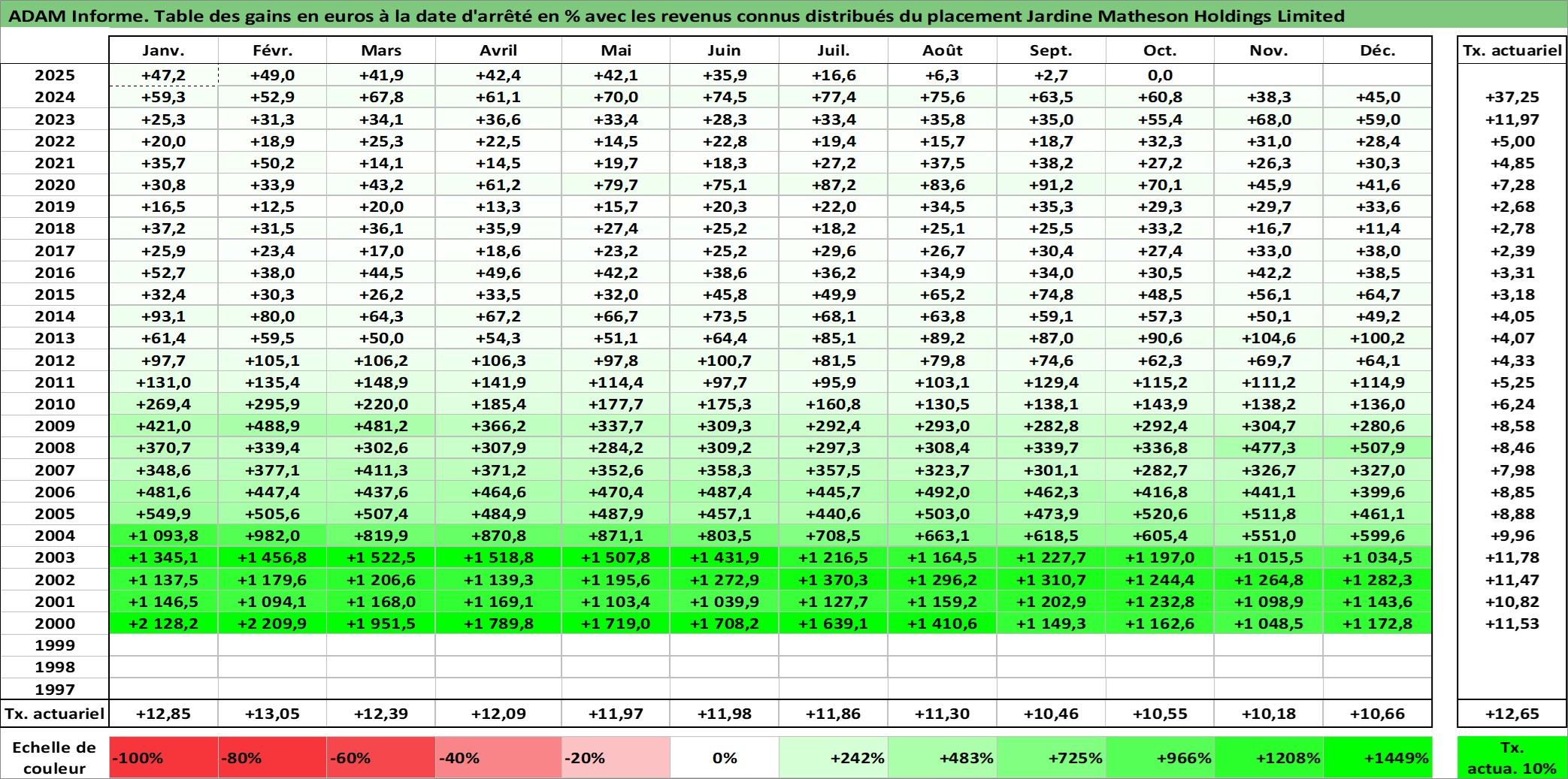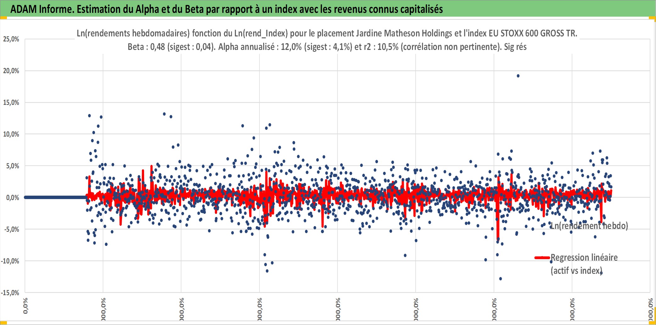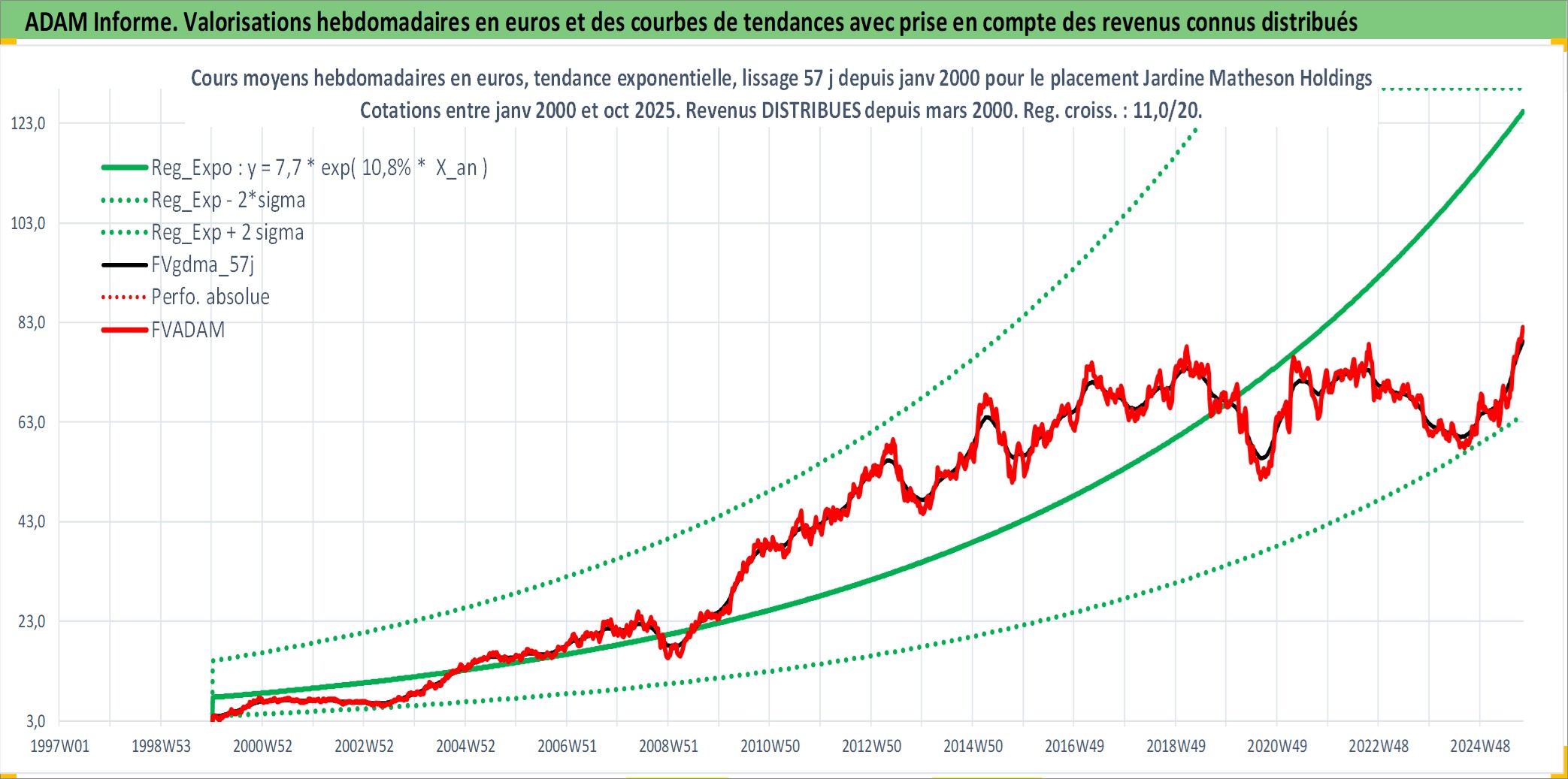 Site dédié aux investisseursPage dédiée sur site financeAnalyse des valorisations hebdomadaires de l'action Jardine Matheson Holdings Limited. Cet actif est cote en USD. Les valorisations sont en contrevaleur EURO et couvrent les semaines 2000W01 a 2025W40. Les revenus de cet actif financier sont pris en compte depuis la semaine 2000W12. La note globale ESG de cet actif est estimee a 2.0 (apres rebasage entre 0 et 20).
