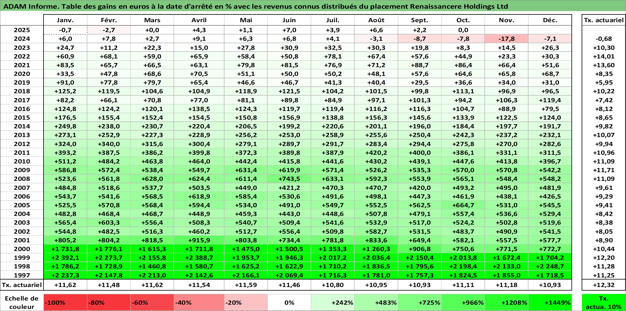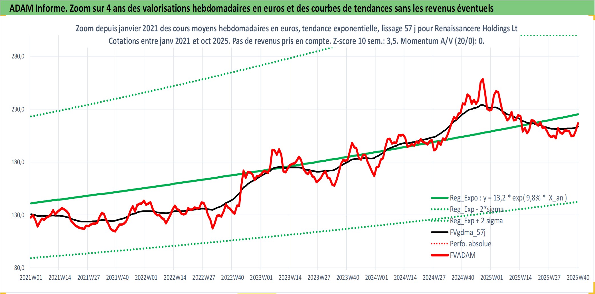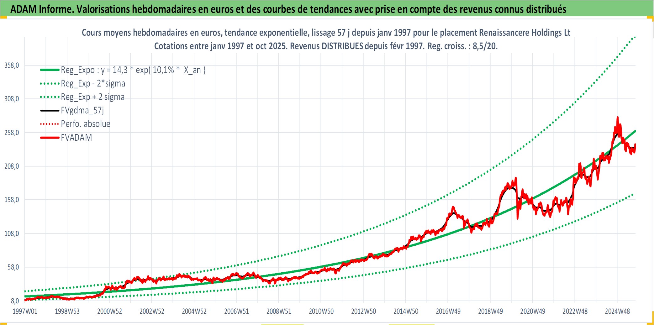 Site dédié aux investisseursPage dédiée sur site financeAnalyse des valorisations hebdomadaires de l'action Renaissancere Holdings Ltd. Cet actif est cote en USD. Les valorisations sont en contrevaleur EURO et couvrent les semaines 1997W01 a 2025W40. Les revenus de cet actif financier sont pris en compte depuis la semaine 1997W07. La note globale ESG de cet actif est estimee a 7.0 (apres rebasage entre 0 et 20).