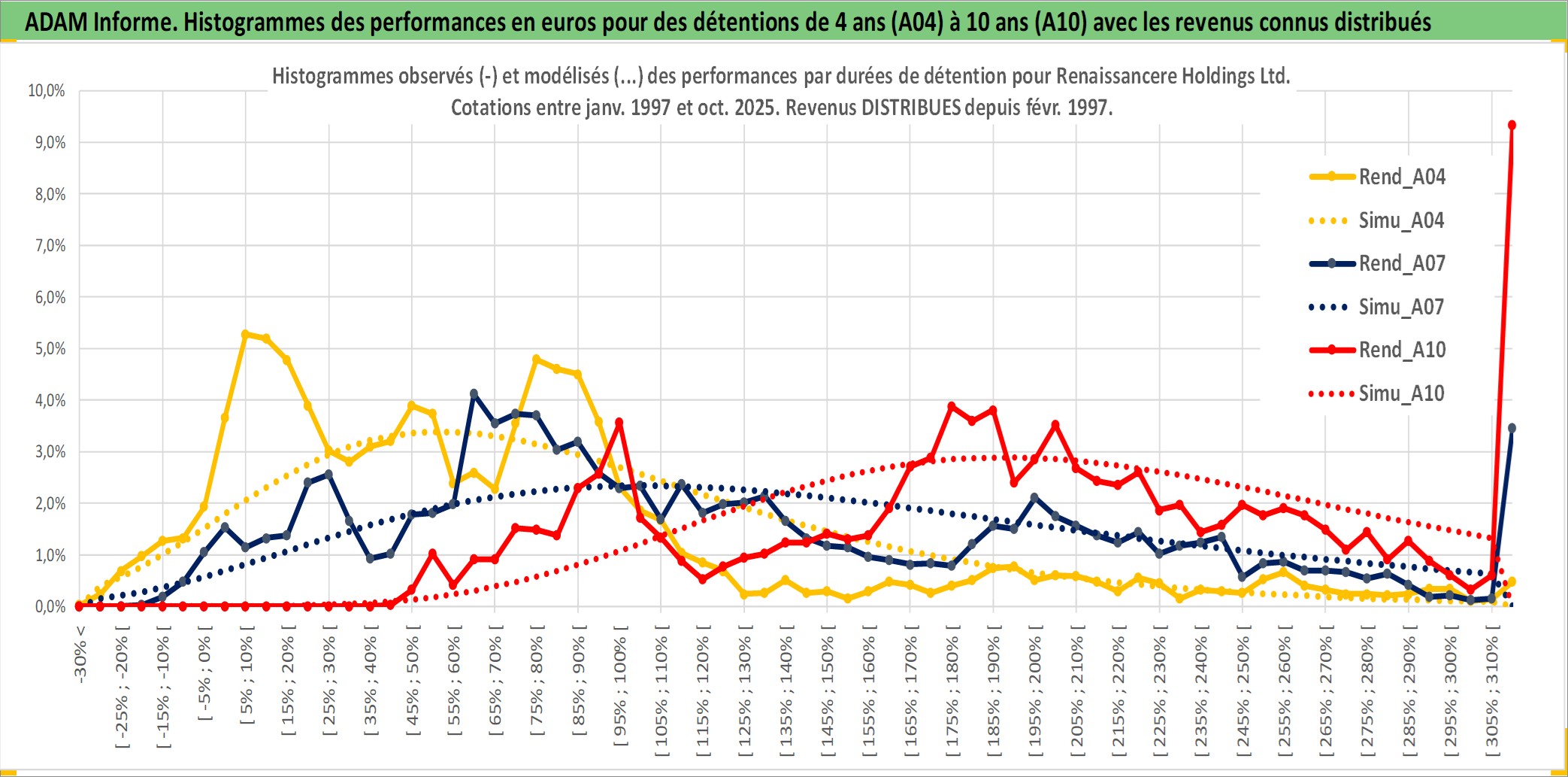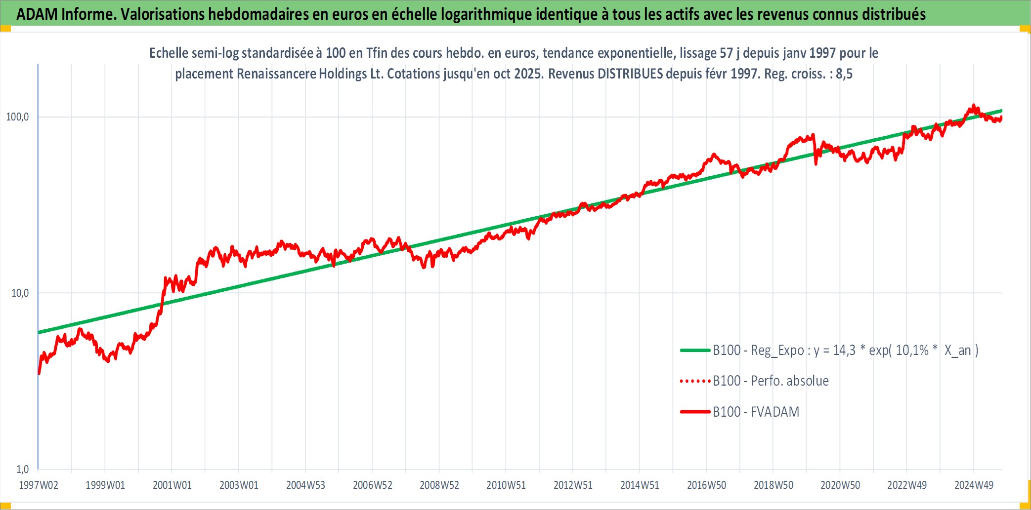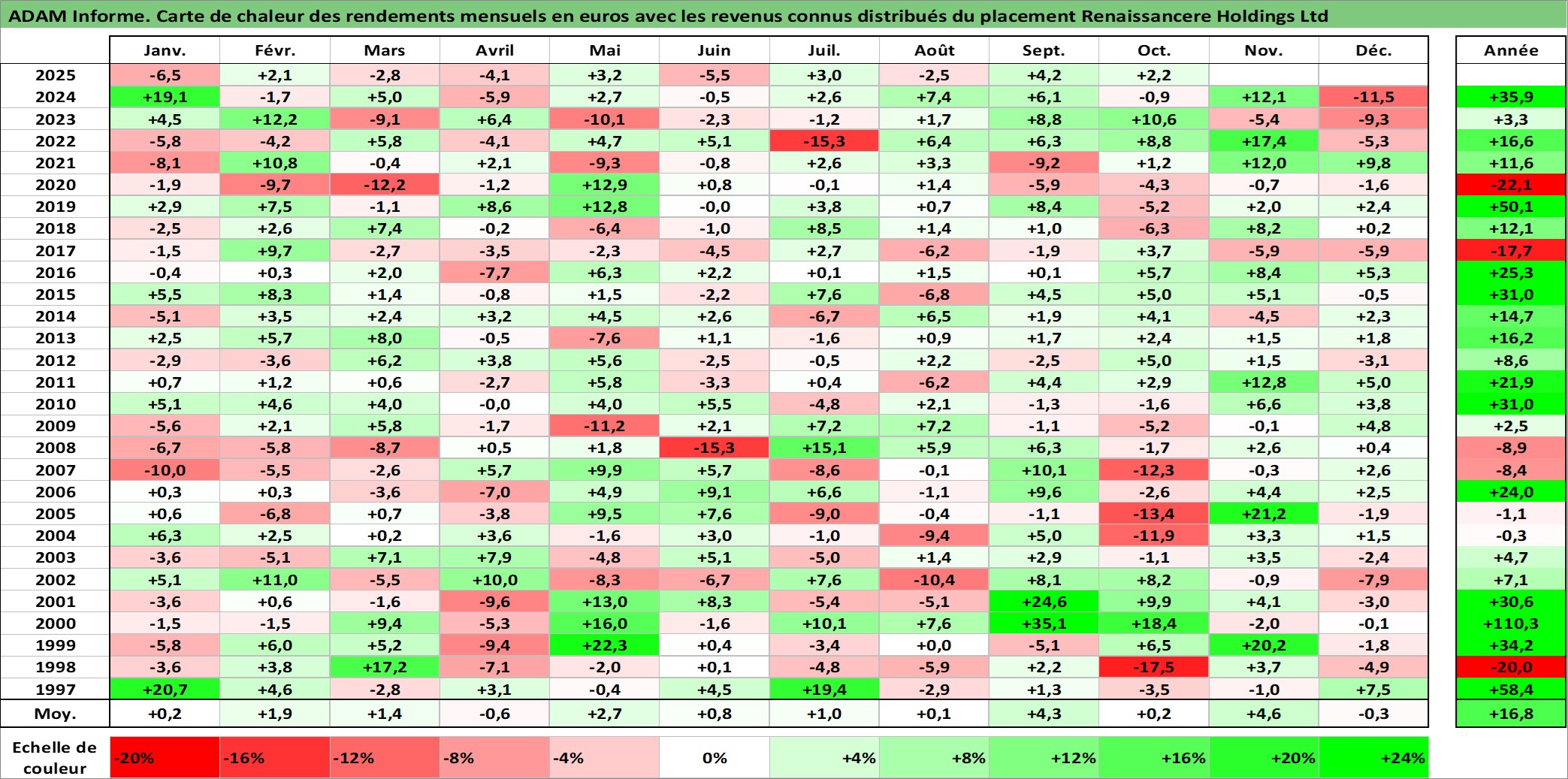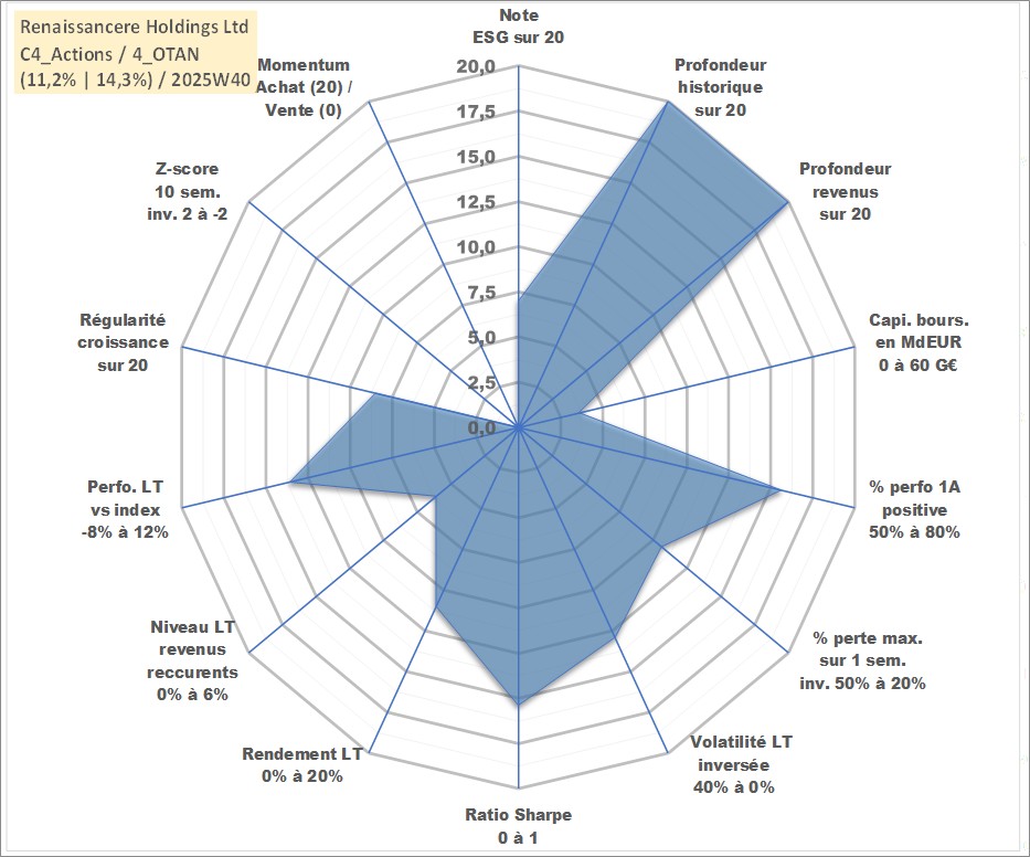 Site dédié aux investisseursPage dédiée sur site financeAnalyse des valorisations hebdomadaires de l'action Renaissancere Holdings Ltd. Cet actif est cote en USD. Les valorisations sont en contrevaleur EURO et couvrent les semaines 1997W01 a 2025W40. Les revenus de cet actif financier sont pris en compte depuis la semaine 1997W07. La note globale ESG de cet actif est estimee a 7.0 (apres rebasage entre 0 et 20).