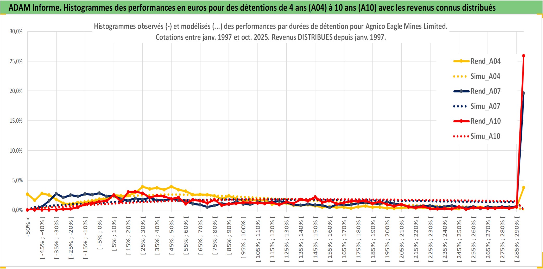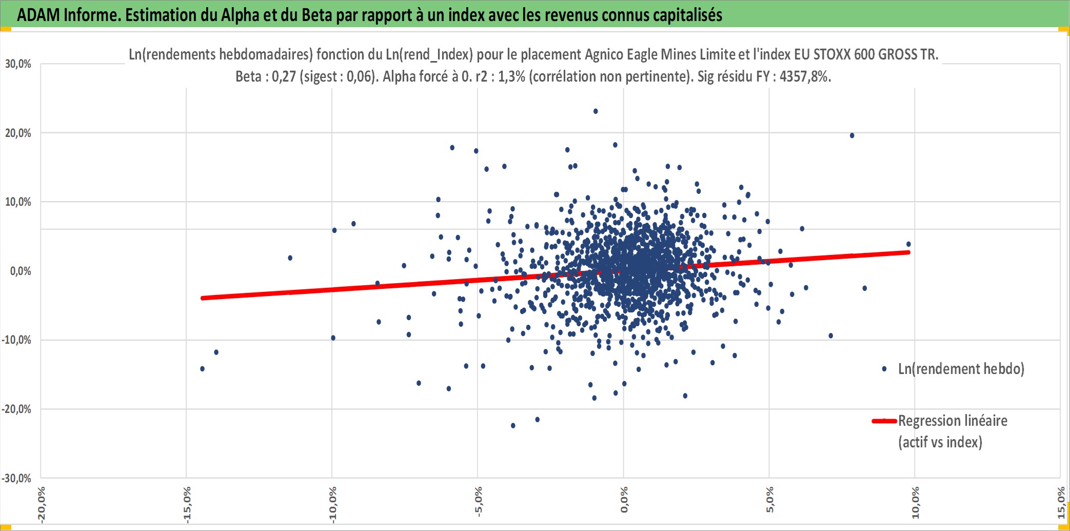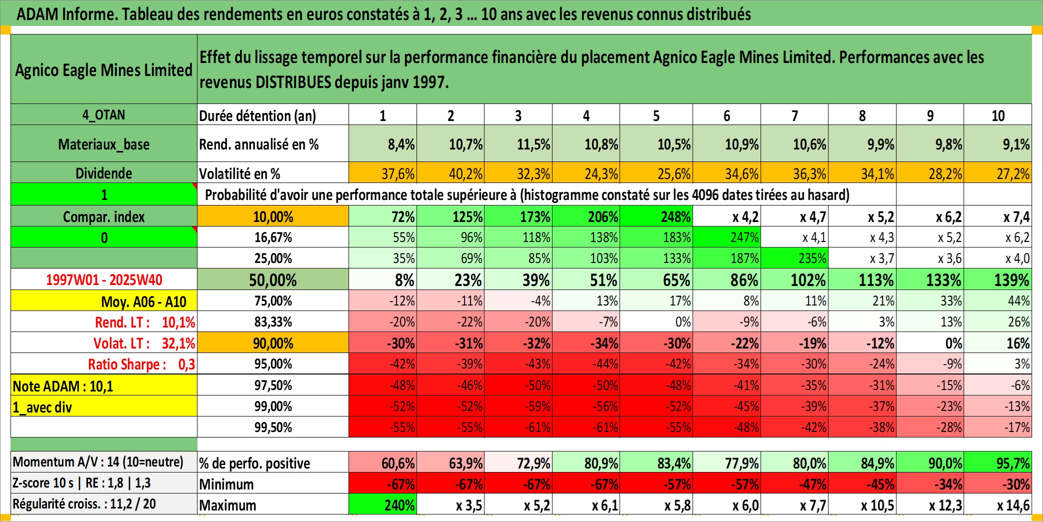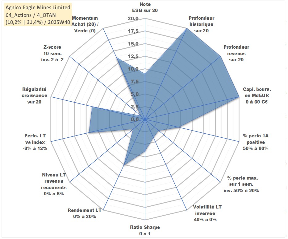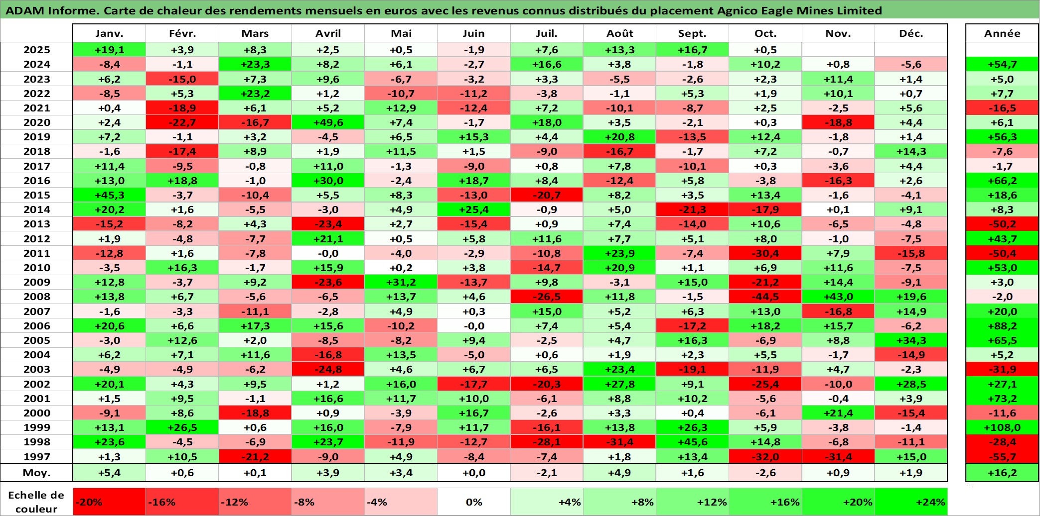 Site dédié aux investisseursPage dédiée sur site financeAnalyse des valorisations hebdomadaires de l'action Agnico Eagle Mines Limited. Cet actif est cote en CAD. Les valorisations sont en contrevaleur EURO et couvrent les semaines 1997W01 a 2025W40. Les revenus de cet actif financier sont pris en compte depuis la semaine 1997W01. La note globale ESG de cet actif est estimee a 9.0 (apres rebasage entre 0 et 20).