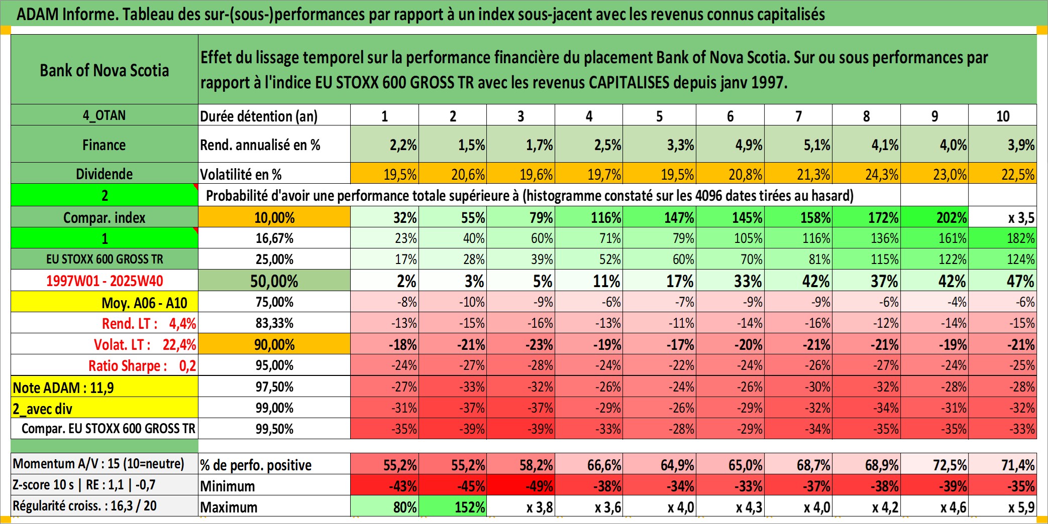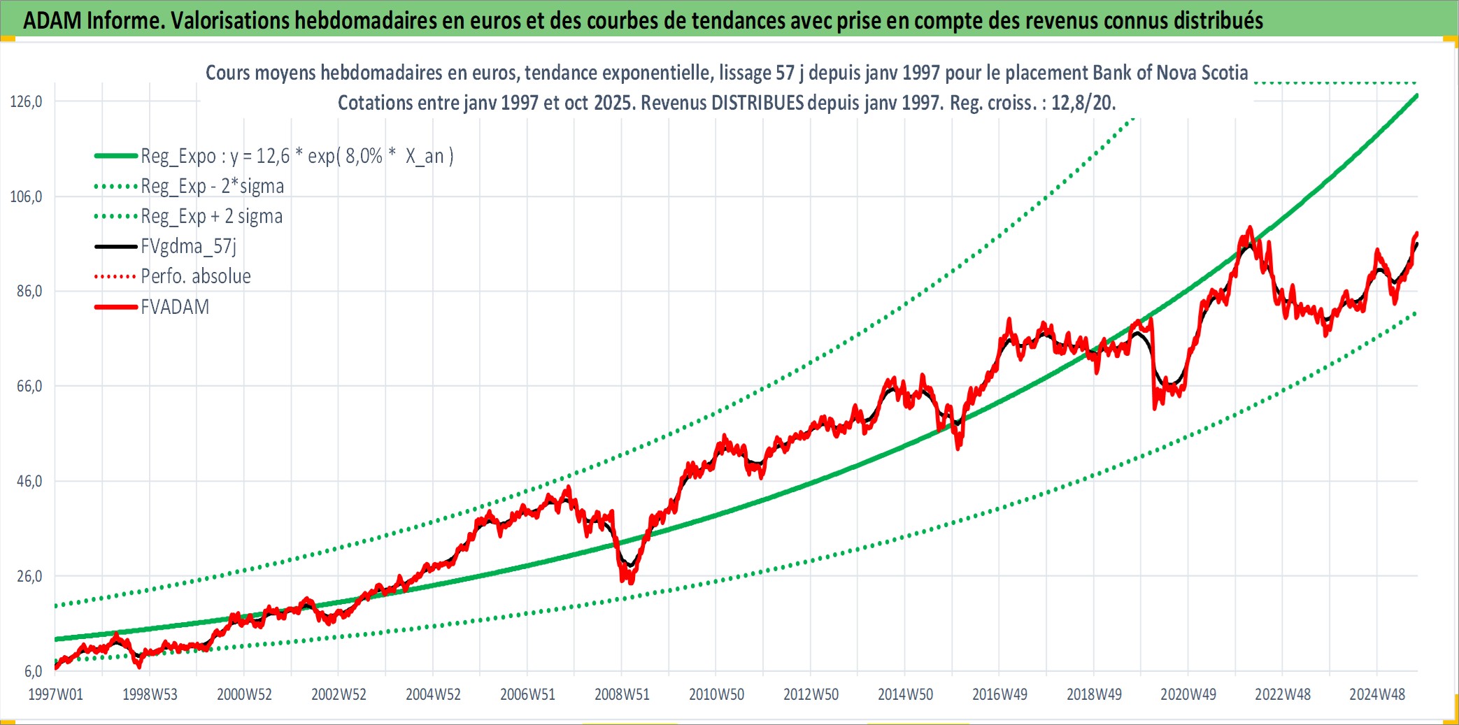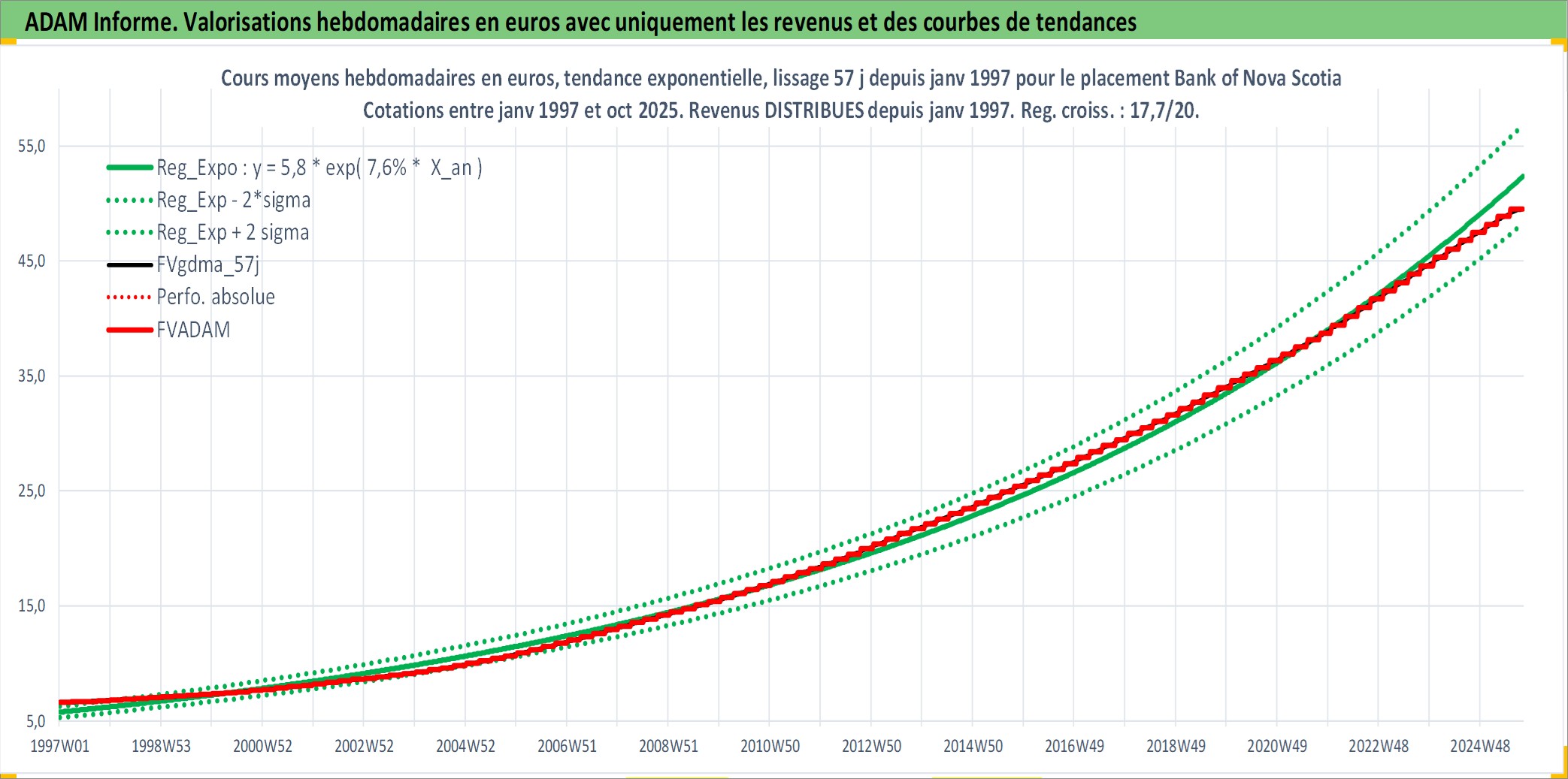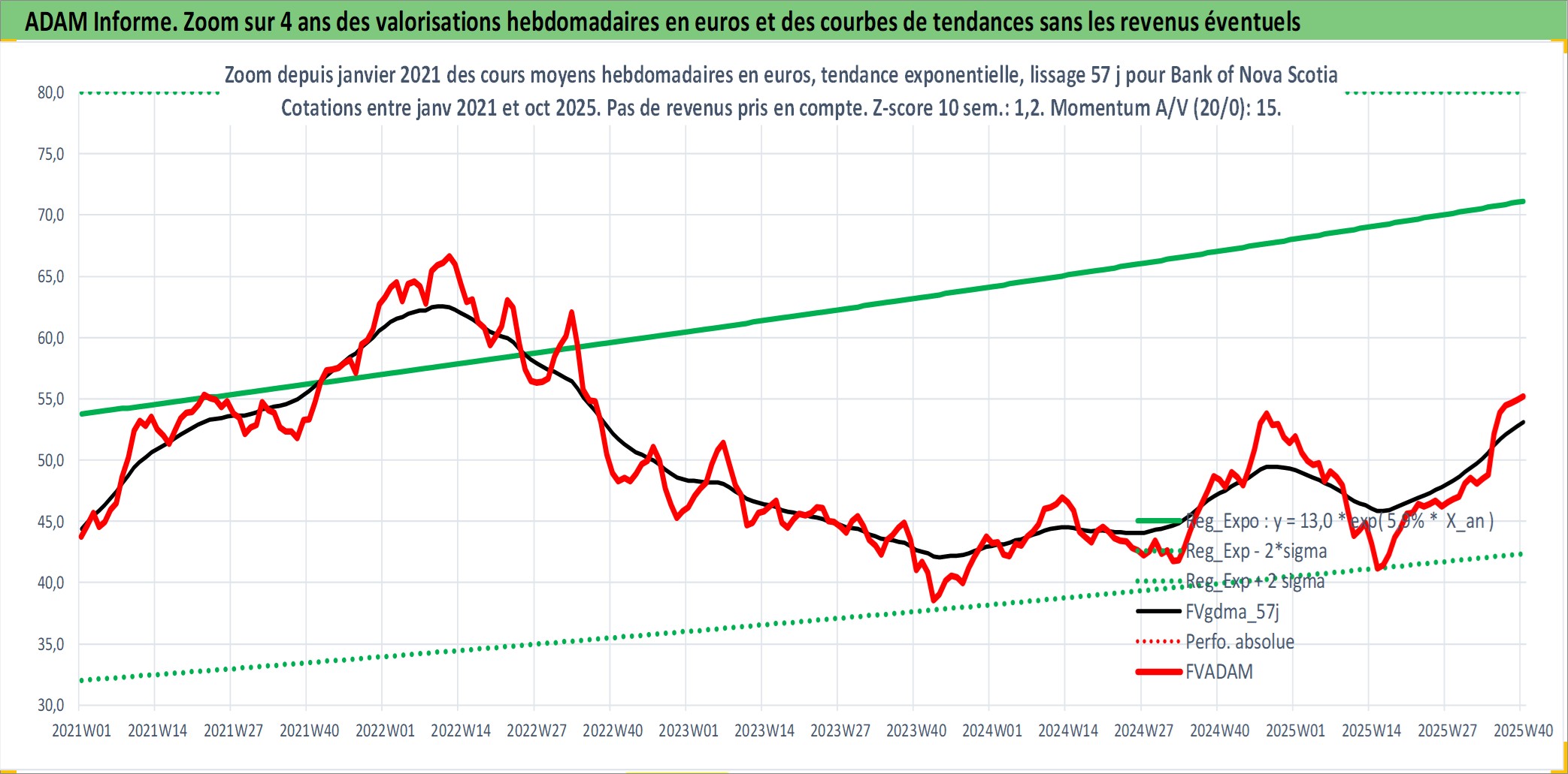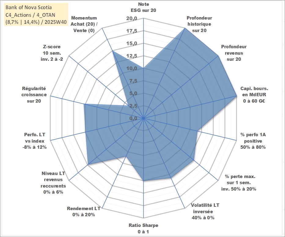 Site dédié aux investisseursPage dédiée sur site financeAnalyse des valorisations hebdomadaires de l'action Bank of Nova Scotia. Cet actif est cote en CAD. Les valorisations sont en contrevaleur EURO et couvrent les semaines 1997W01 a 2025W40. Les revenus de cet actif financier sont pris en compte depuis la semaine 1997W01. La note globale ESG de cet actif est estimee a 10.0 (apres rebasage entre 0 et 20).