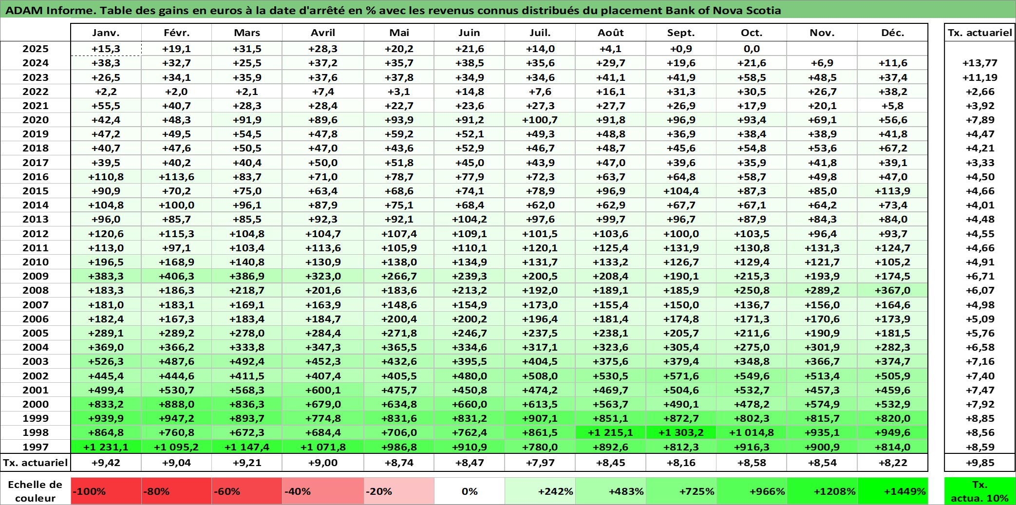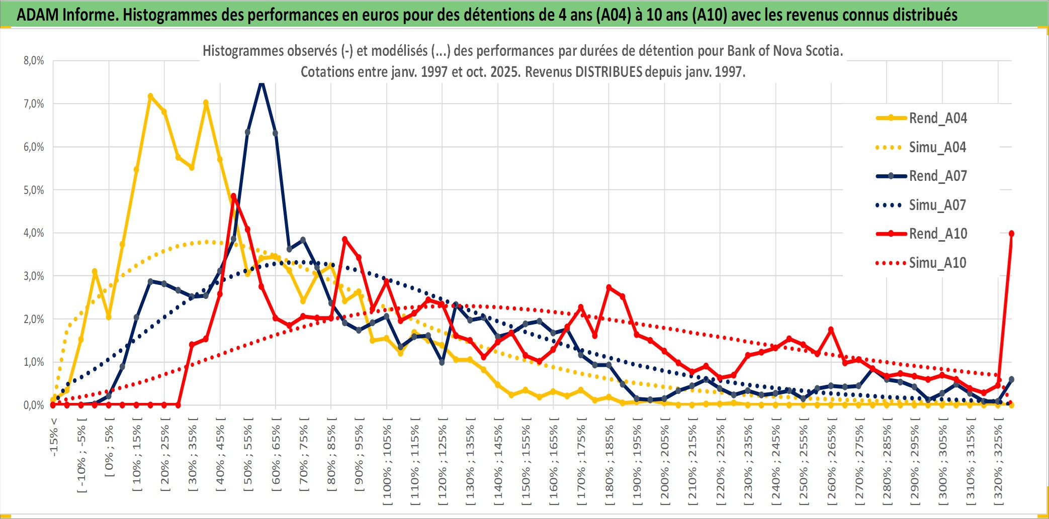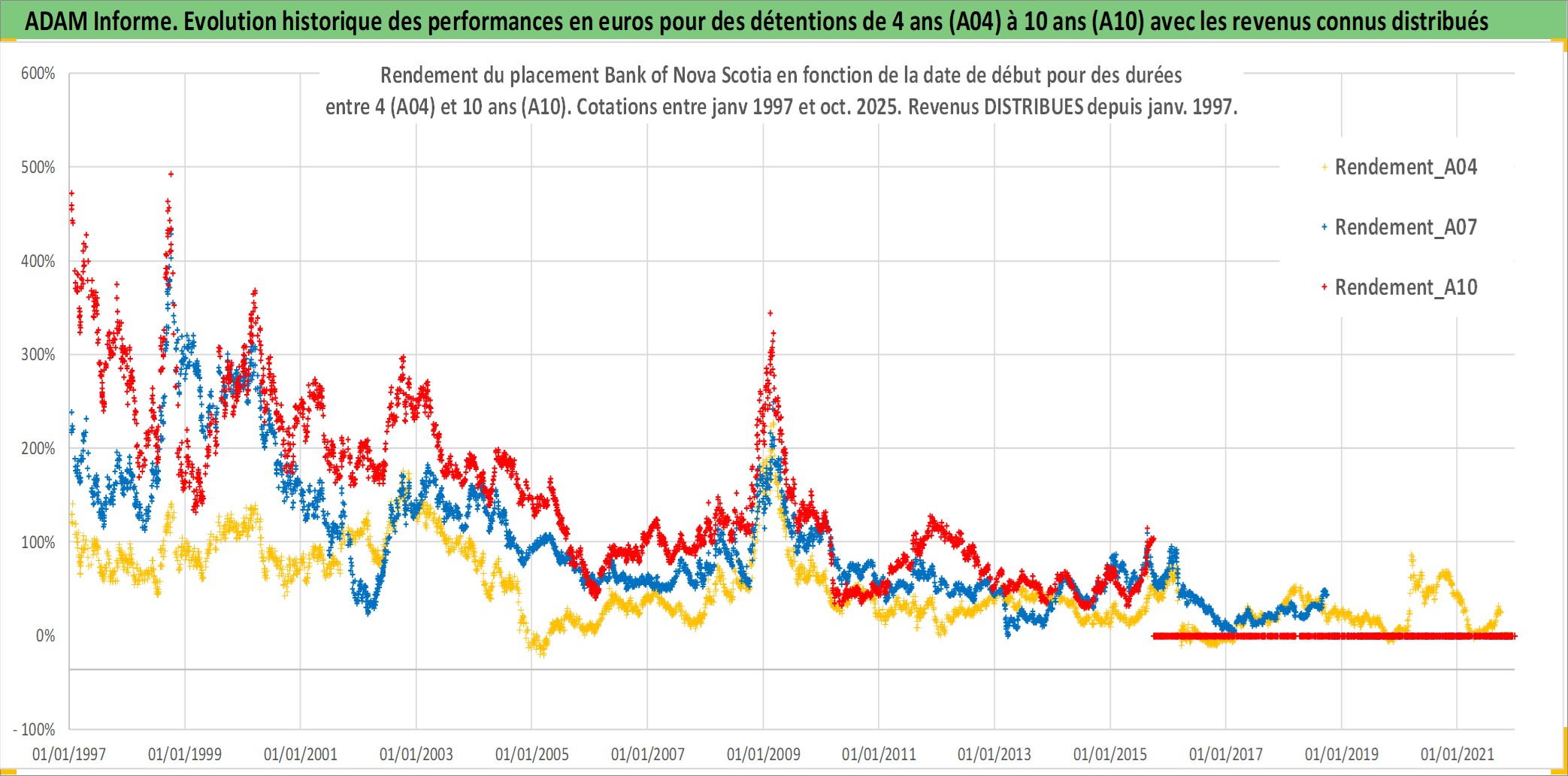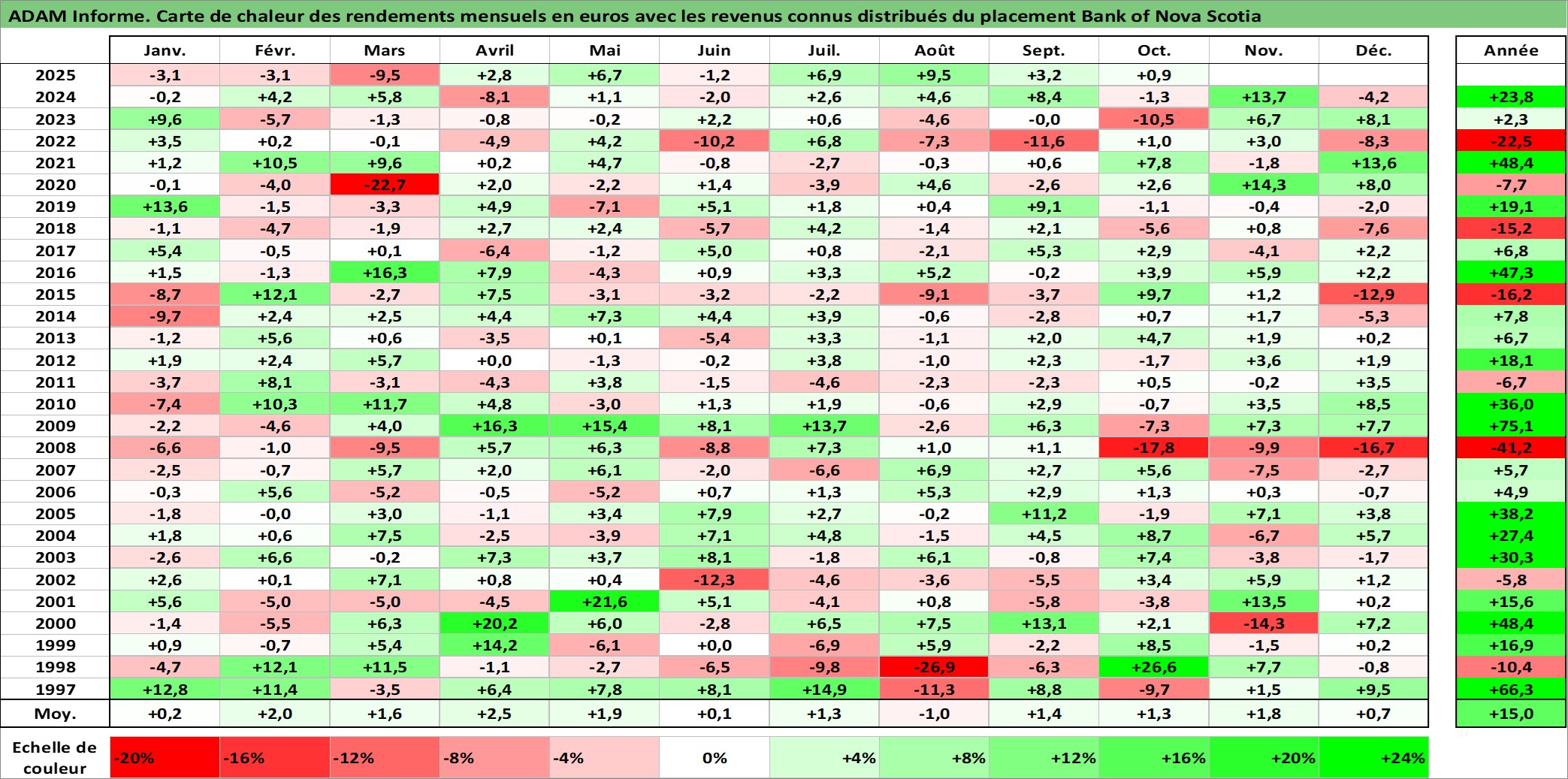 Site dédié aux investisseursPage dédiée sur site financeAnalyse des valorisations hebdomadaires de l'action Bank of Nova Scotia. Cet actif est cote en CAD. Les valorisations sont en contrevaleur EURO et couvrent les semaines 1997W01 a 2025W40. Les revenus de cet actif financier sont pris en compte depuis la semaine 1997W01. La note globale ESG de cet actif est estimee a 10.0 (apres rebasage entre 0 et 20).
