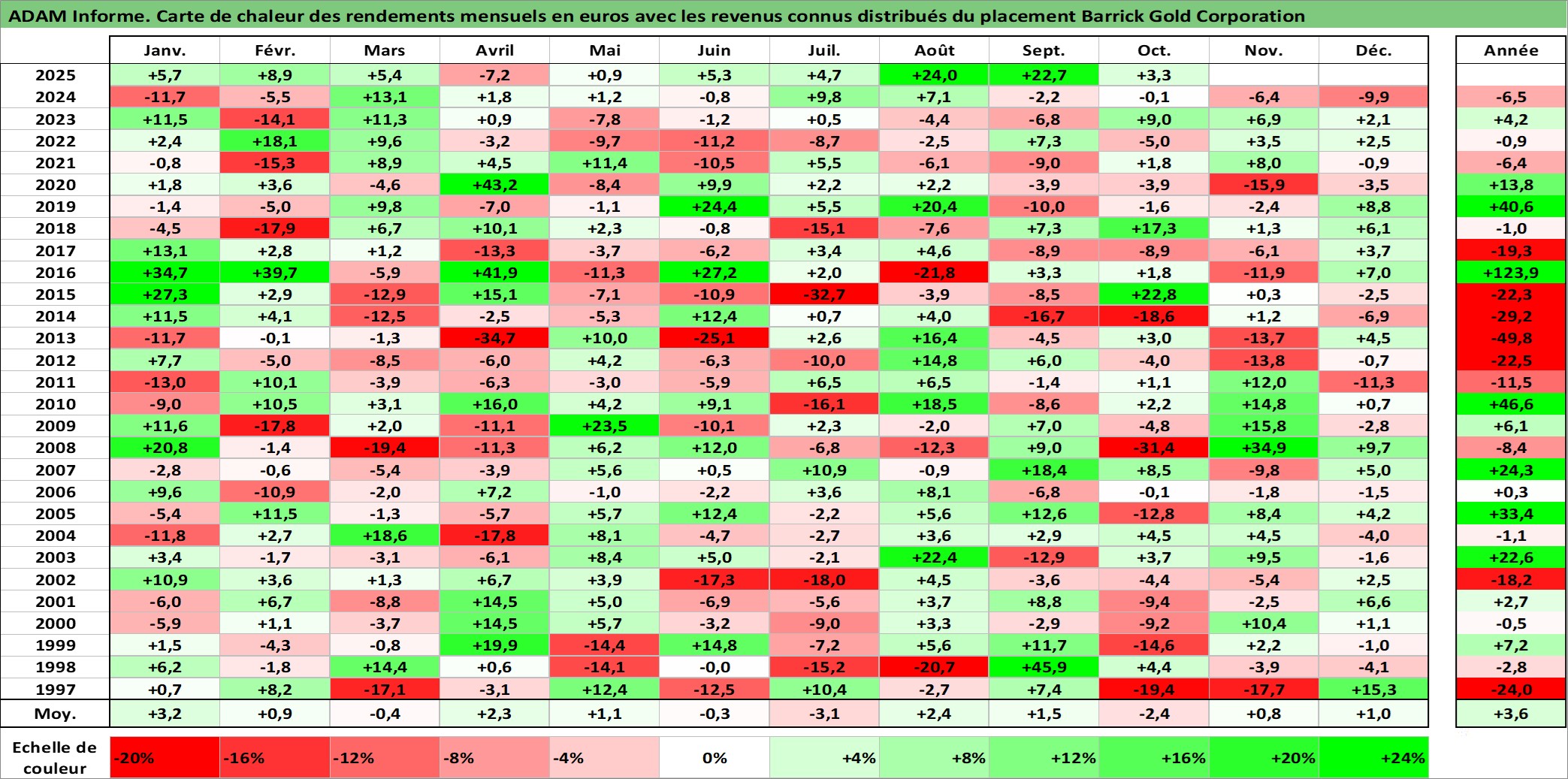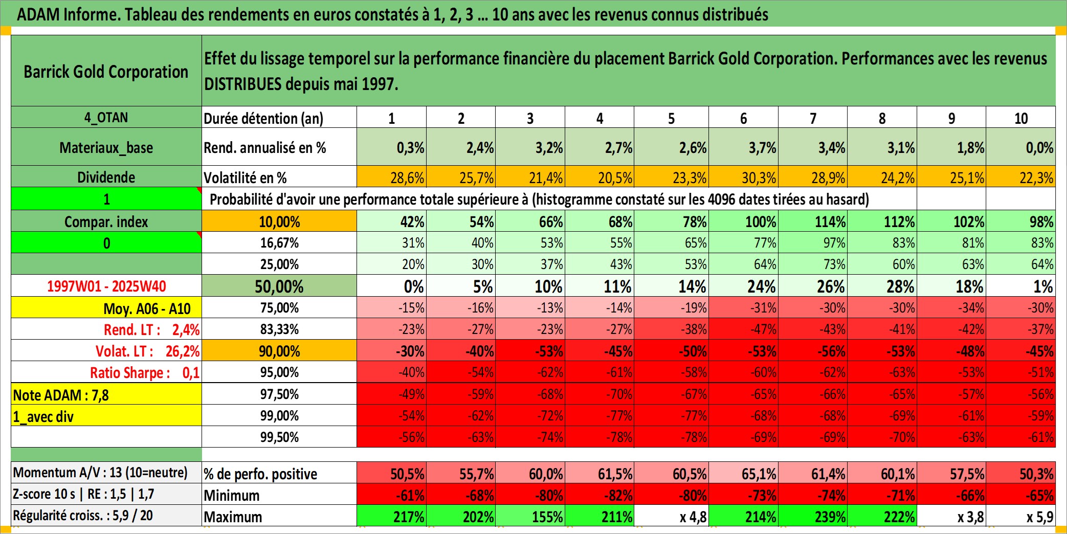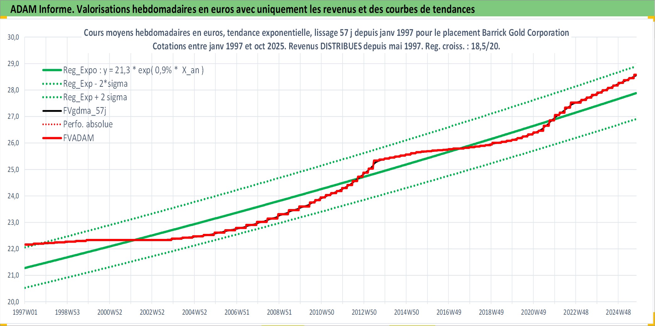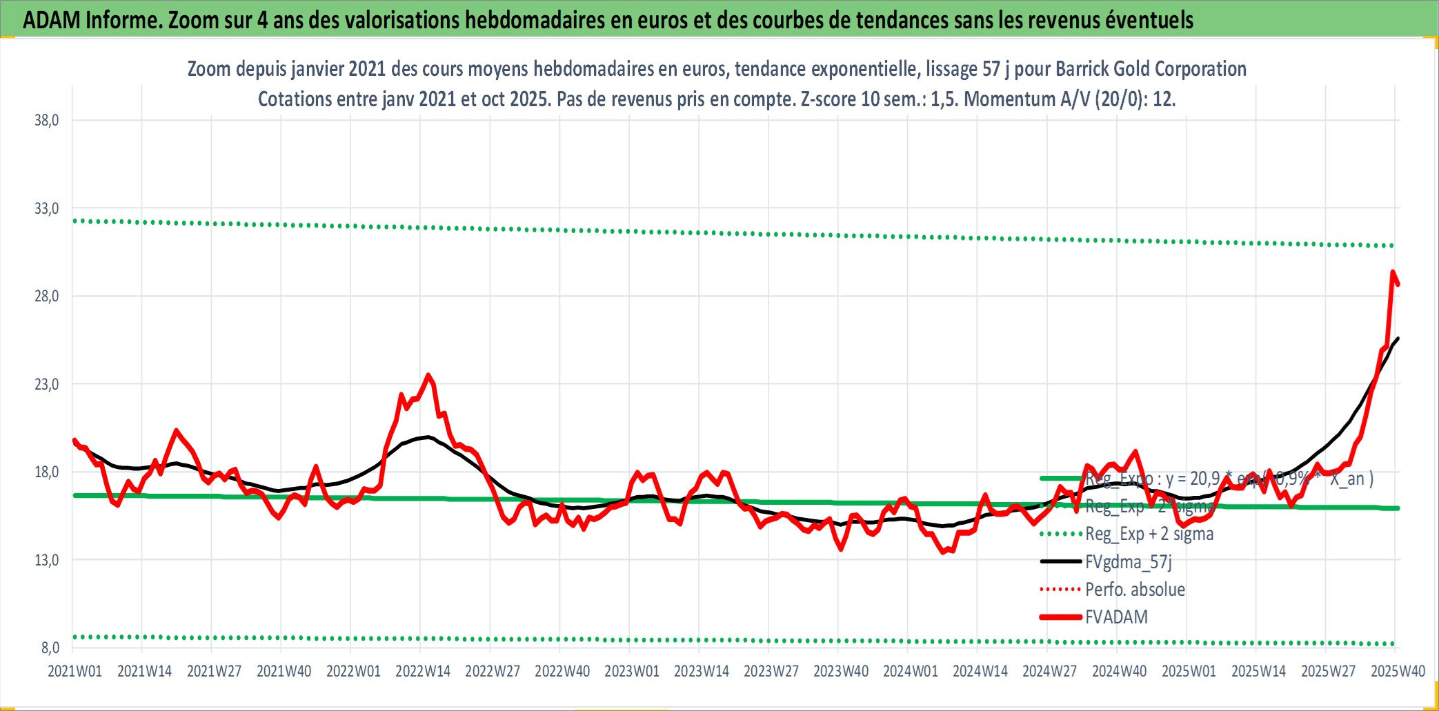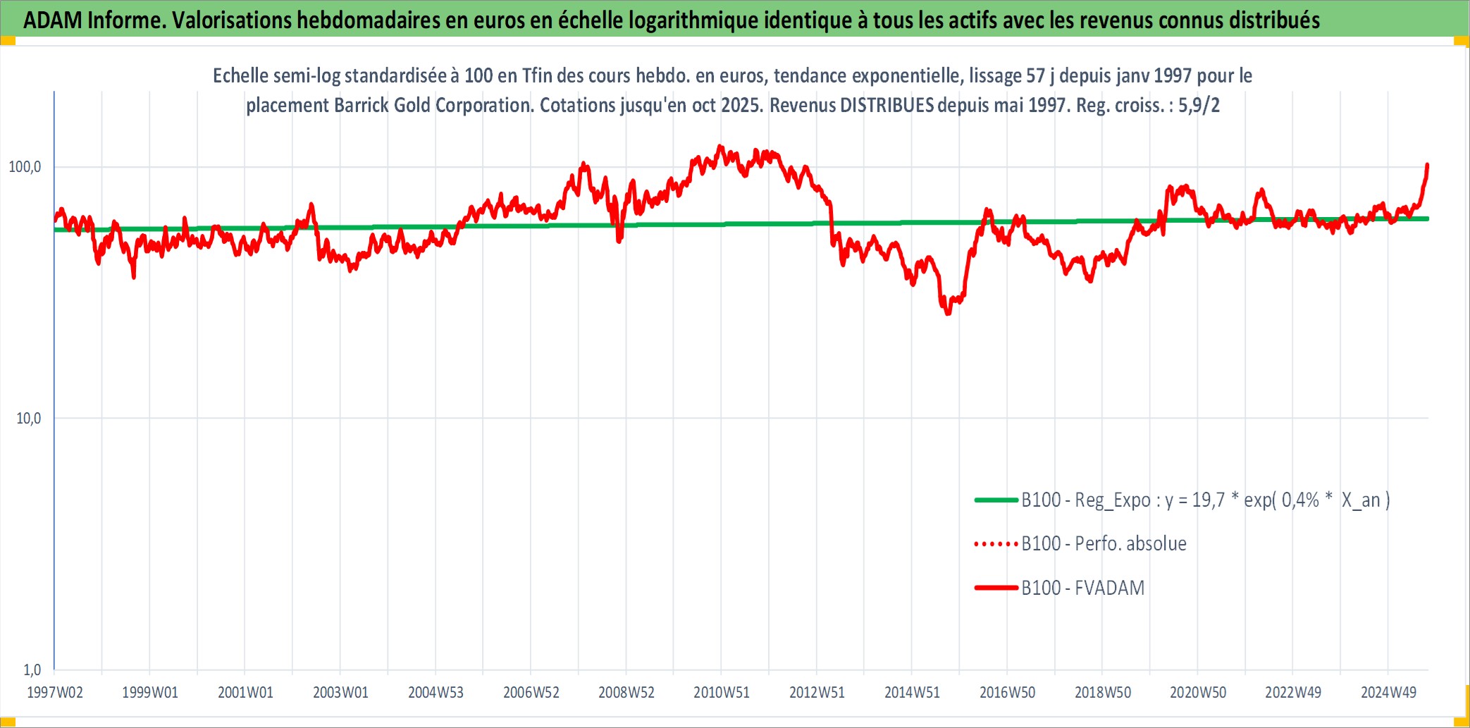 Site dédié aux investisseursPage dédiée sur site financeAnalyse des valorisations hebdomadaires de l'action Barrick Gold Corporation. Cet actif est cote en CAD. Les valorisations sont en contrevaleur EURO et couvrent les semaines 1997W01 a 2025W40. Les revenus de cet actif financier sont pris en compte depuis la semaine 1997W22. La note globale ESG de cet actif est estimee a 4.0 (apres rebasage entre 0 et 20).