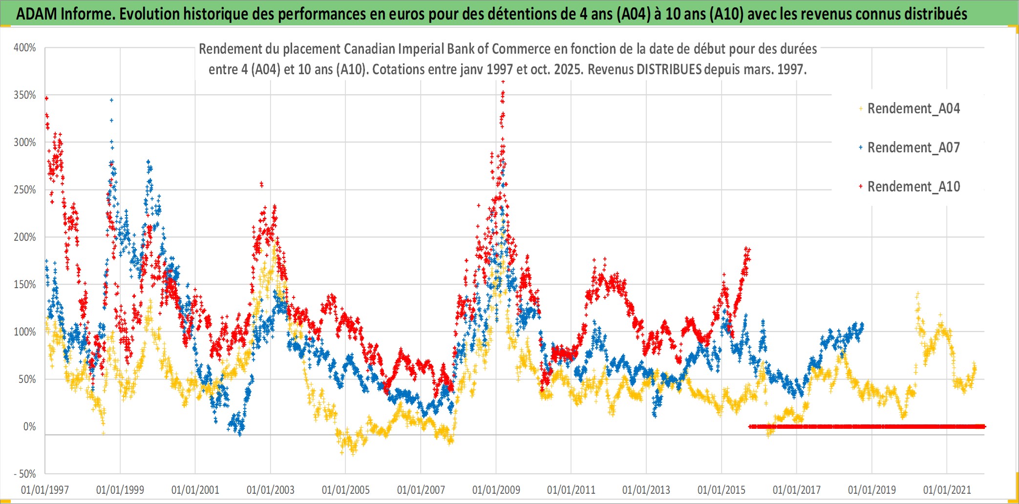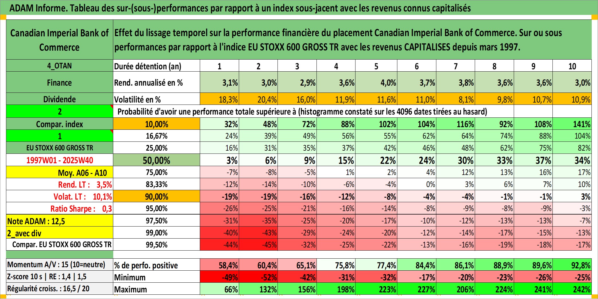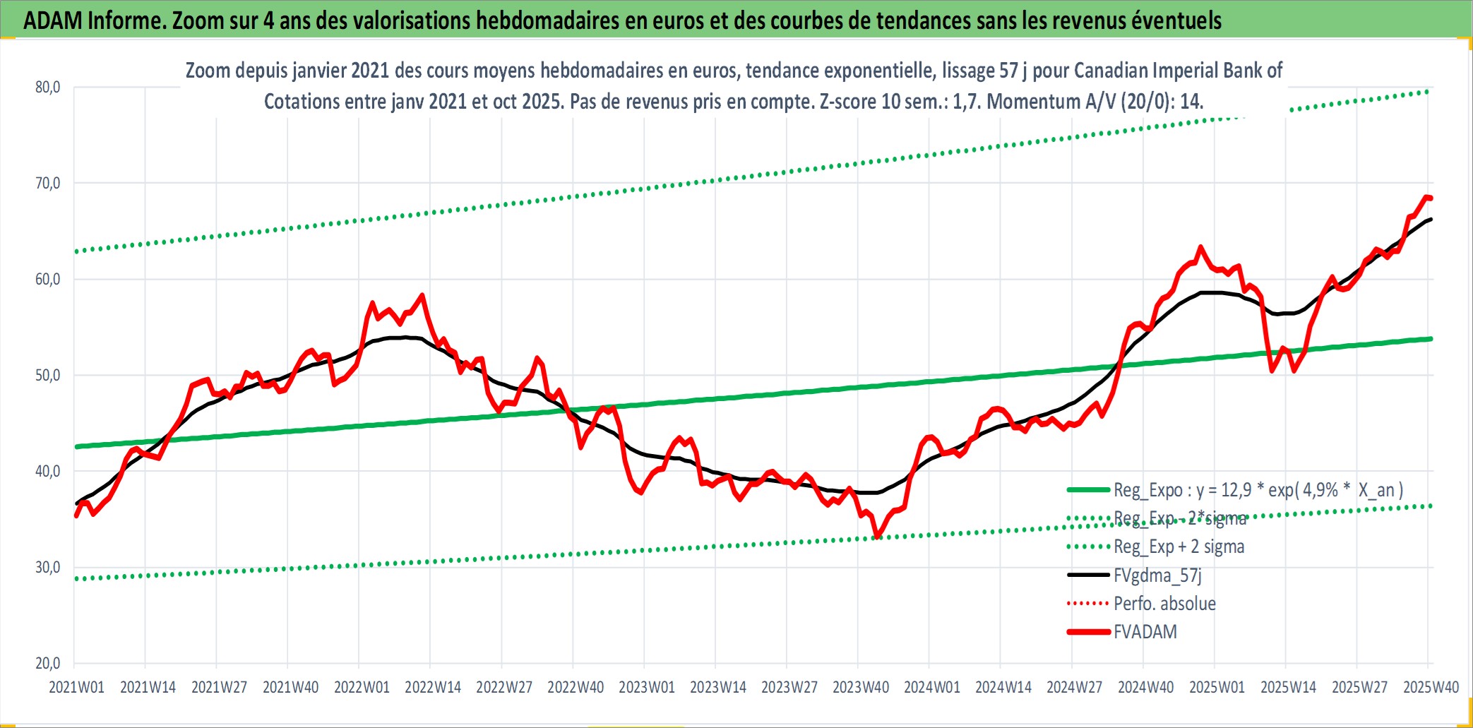 Site dédié aux investisseursPage dédiée sur site financeAnalyse des valorisations hebdomadaires de l'action Canadian Imperial Bank of Commerce. Cet actif est cote en CAD. Les valorisations sont en contrevaleur EURO et couvrent les semaines 1997W01 a 2025W40. Les revenus de cet actif financier sont pris en compte depuis la semaine 1997W13. La note globale ESG de cet actif est estimee a 11.0 (apres rebasage entre 0 et 20).