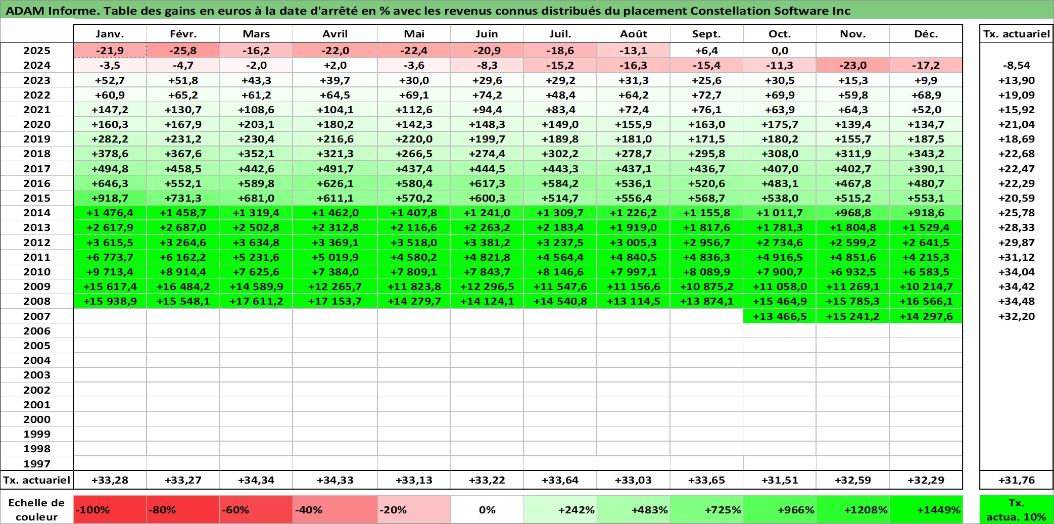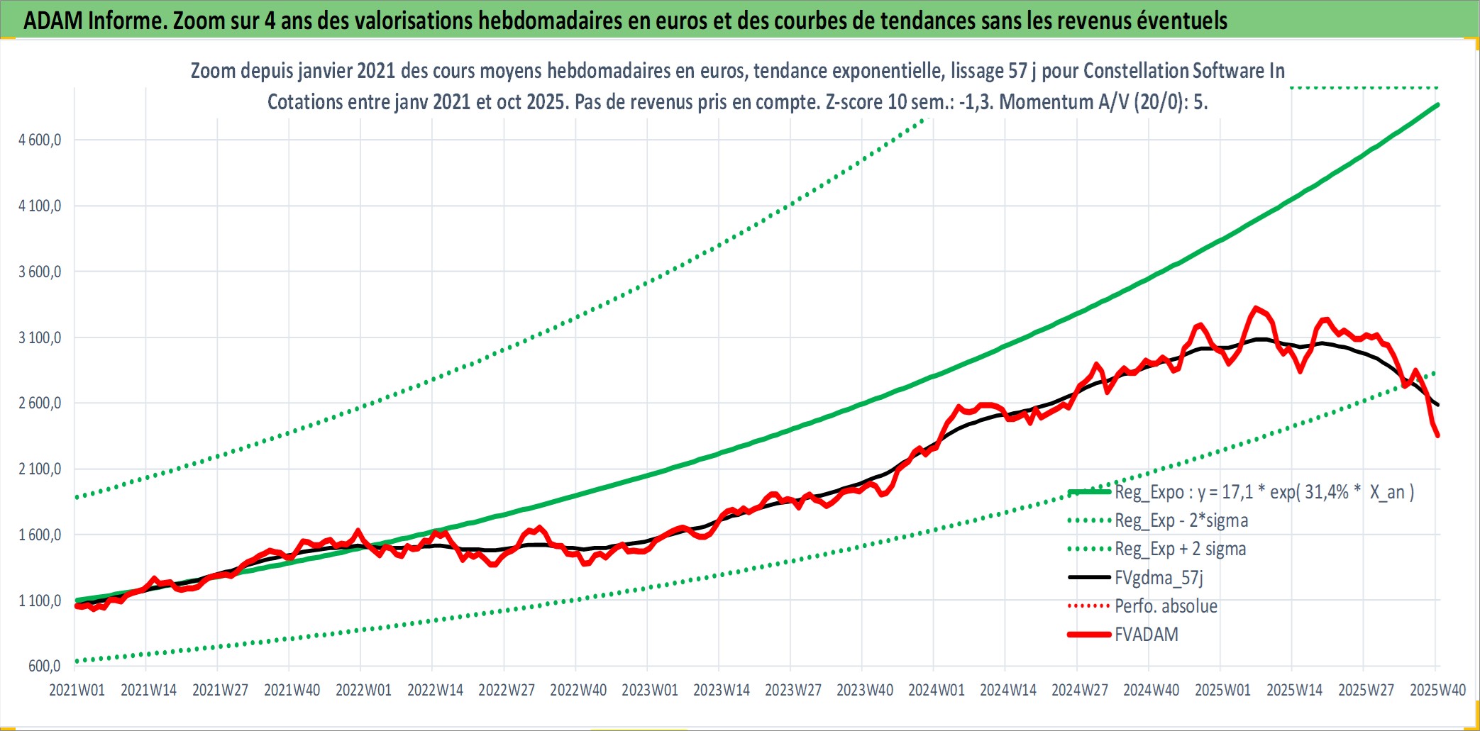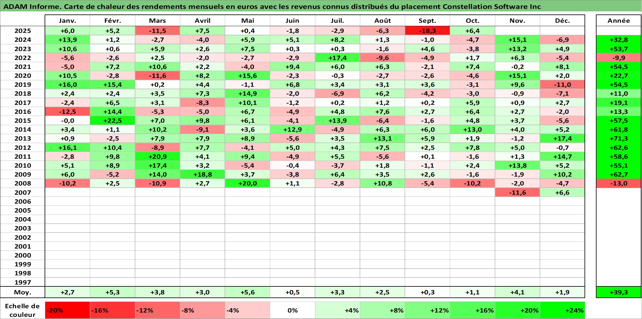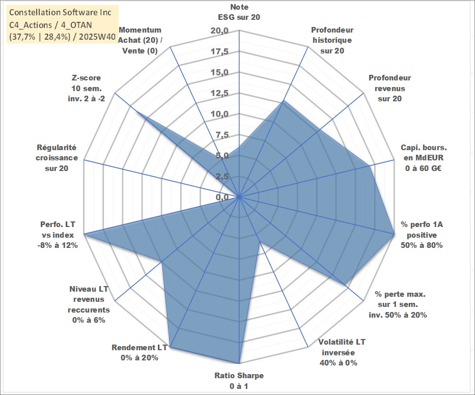 Site dédié aux investisseursPage dédiée sur site financeAnalyse des valorisations hebdomadaires de l'action Constellation Software Inc. Cet actif est cote en CAD. Les valorisations sont en contrevaleur EURO et couvrent les semaines 2007W43 a 2025W40. Les revenus de cet actif financier sont pris en compte depuis la semaine 2008W12. La note globale ESG de cet actif est estimee a 6.0 (apres rebasage entre 0 et 20).