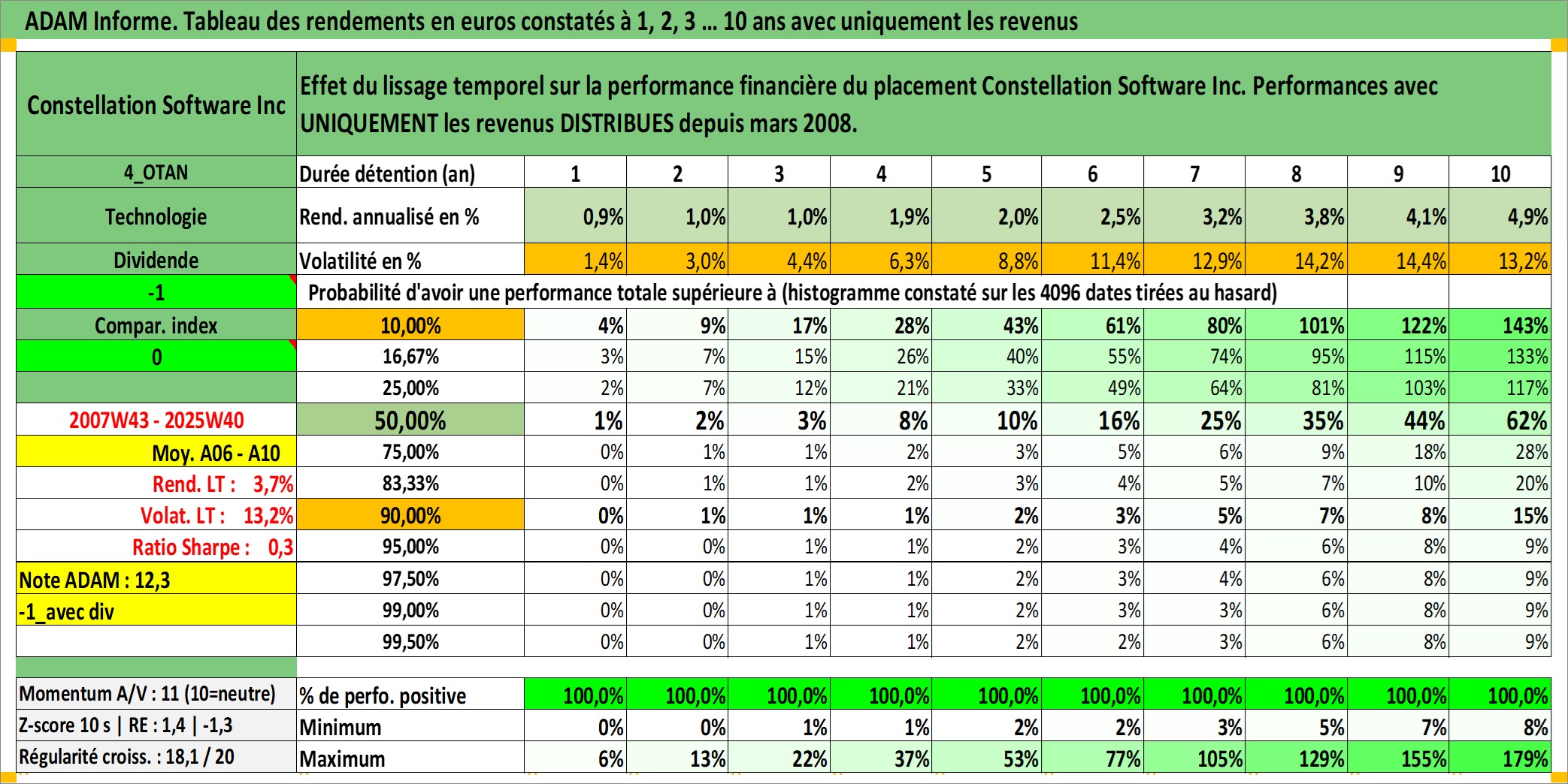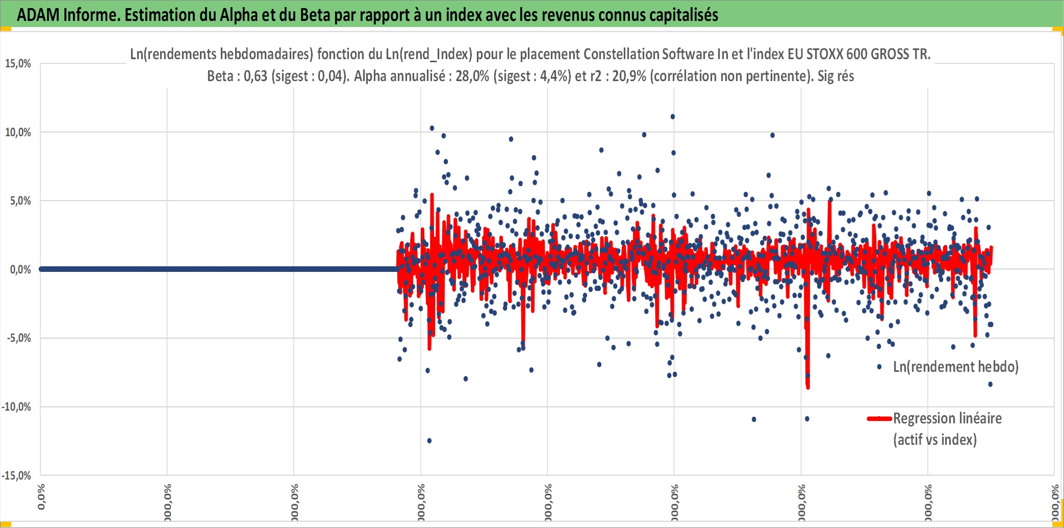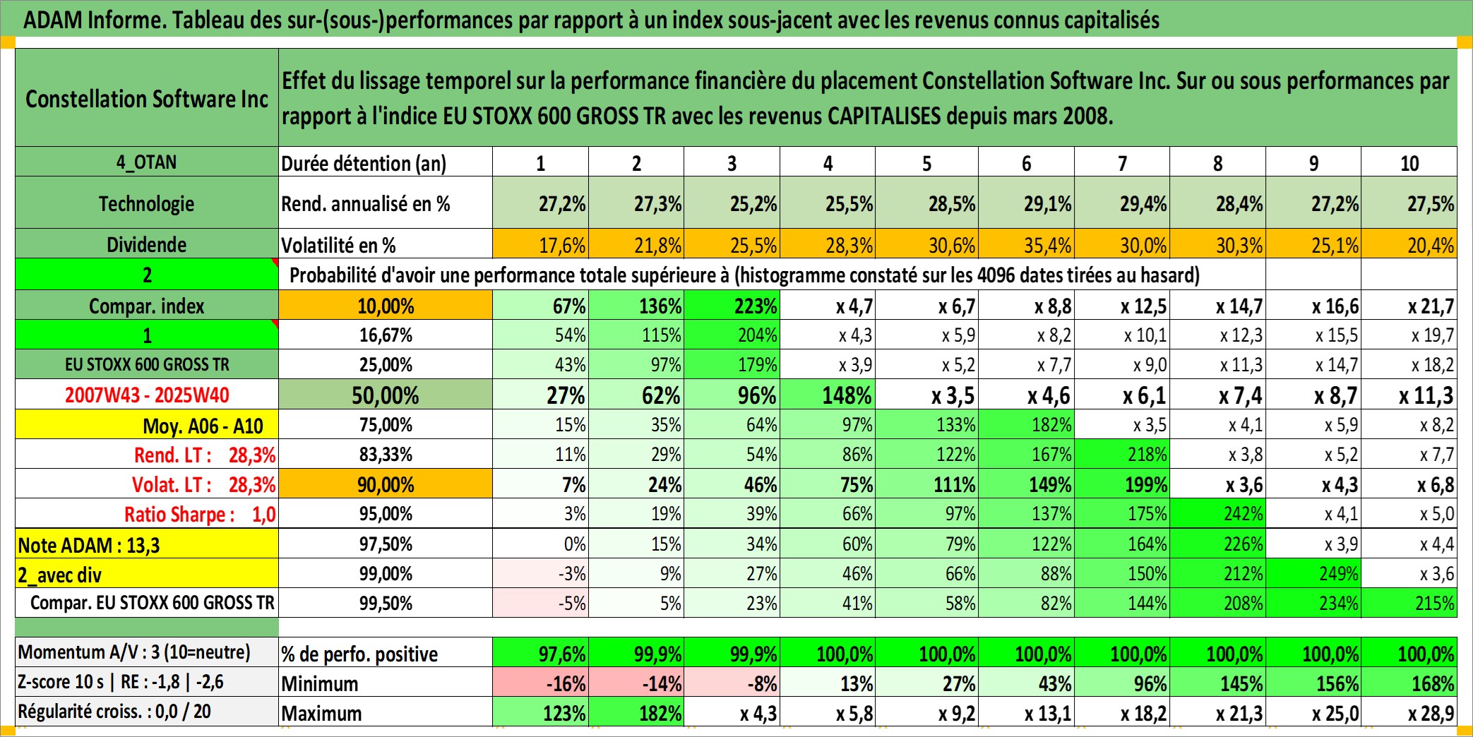 Site dédié aux investisseursPage dédiée sur site financeAnalyse des valorisations hebdomadaires de l'action Constellation Software Inc. Cet actif est cote en CAD. Les valorisations sont en contrevaleur EURO et couvrent les semaines 2007W43 a 2025W40. Les revenus de cet actif financier sont pris en compte depuis la semaine 2008W12. La note globale ESG de cet actif est estimee a 6.0 (apres rebasage entre 0 et 20).