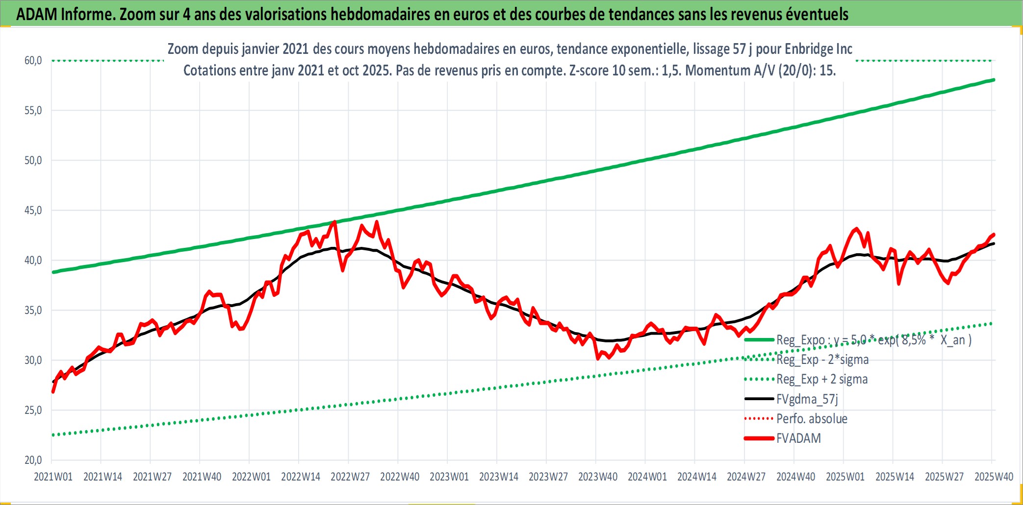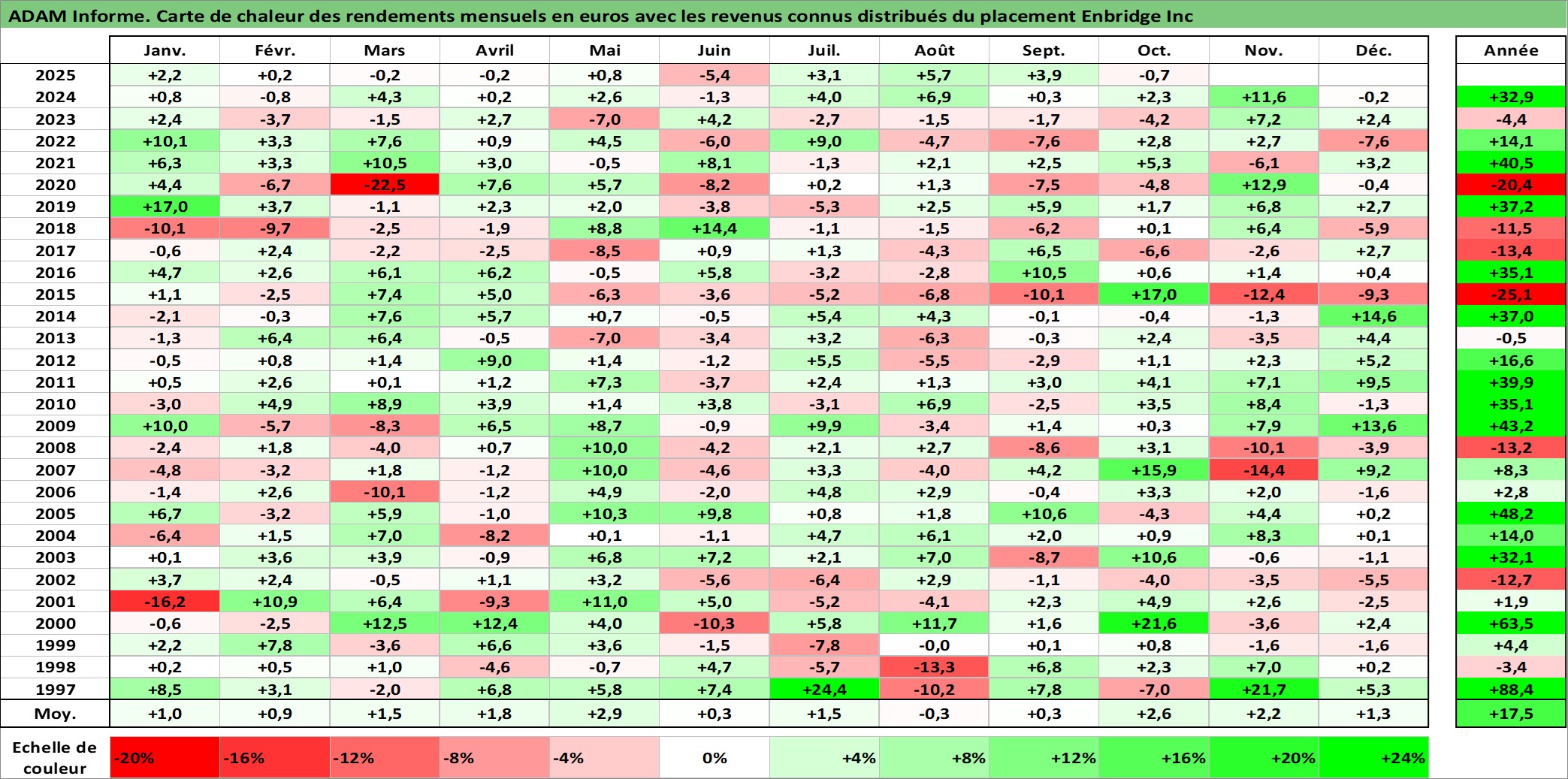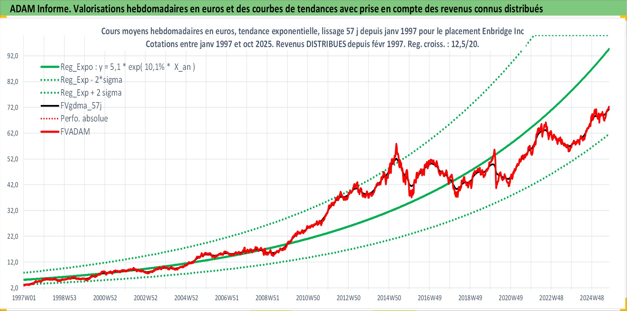Site dédié aux investisseursPage dédiée sur site financeAnalyse des valorisations hebdomadaires de l'action Enbridge Inc. Cet actif est cote en CAD. Les valorisations sont en contrevaleur EURO et couvrent les semaines 1997W01 a 2025W40. Les revenus de cet actif financier sont pris en compte depuis la semaine 1997W07. La note globale ESG de cet actif est estimee a 9.0 (apres rebasage entre 0 et 20).